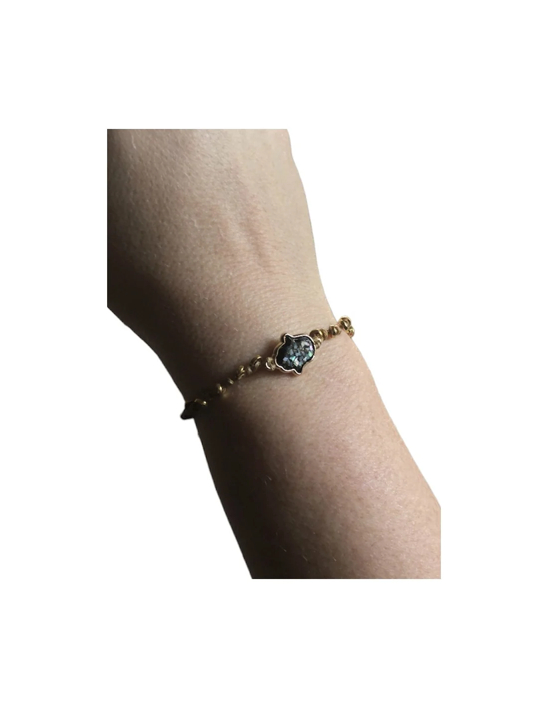 Αυτό το γυναικείο βραχιόλι ξεχωρίζει για το κεντρικό στοιχείο από φίλντισί, το οποίο βρίσκεται σε επιχρυσωμένο πλαίσιο και έχει το σχέδιο του χεριού Χάμσα.