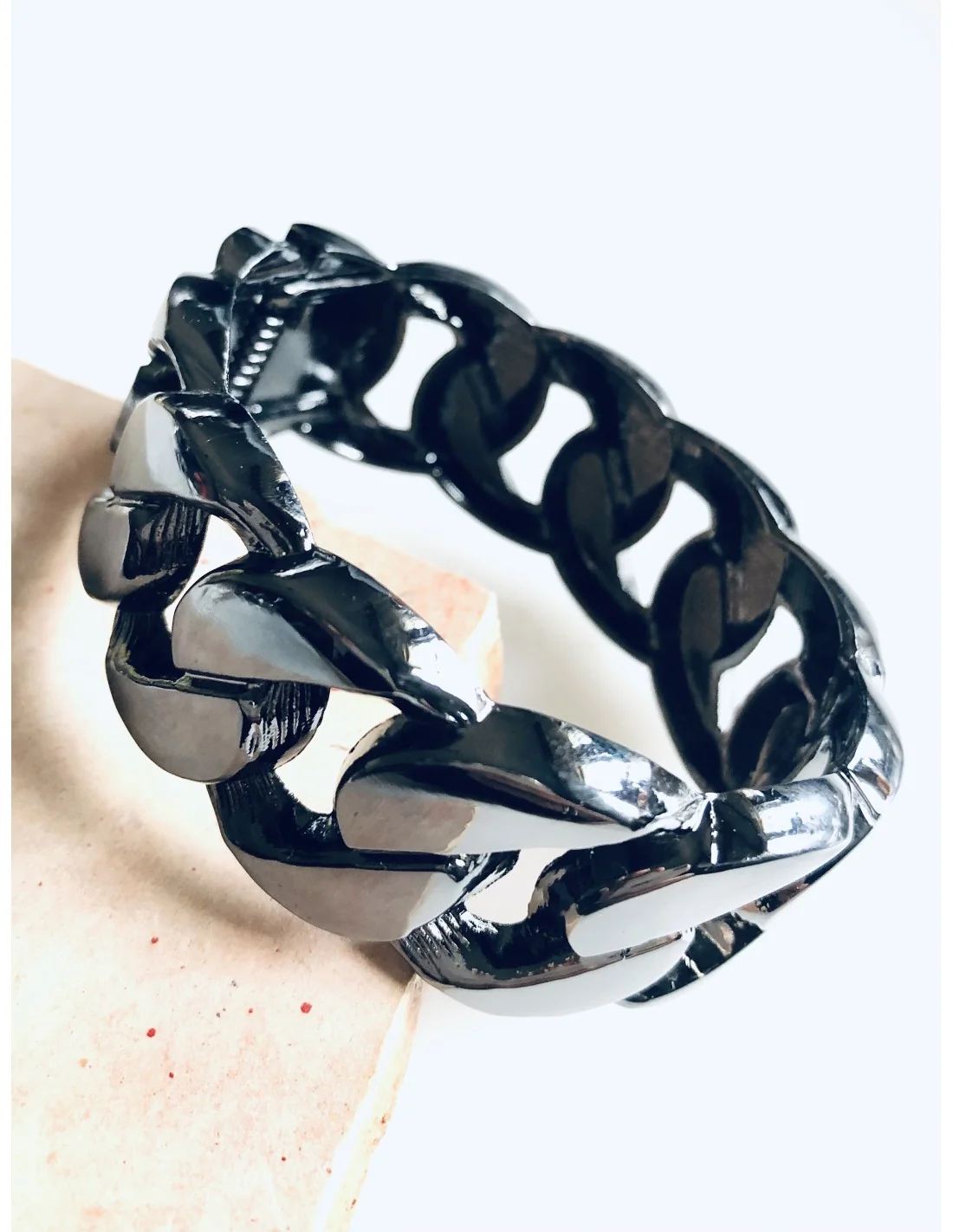 Αυτό το χειροποίητο, φαρδύ βραχιόλι χειροπέδα είναι κατασκευασμένο από ανθεκτικό ατσάλι και διαθέτει κομψό σχέδιο καδένας σε αποχρώσεις του χρυσού και του μαύρου.