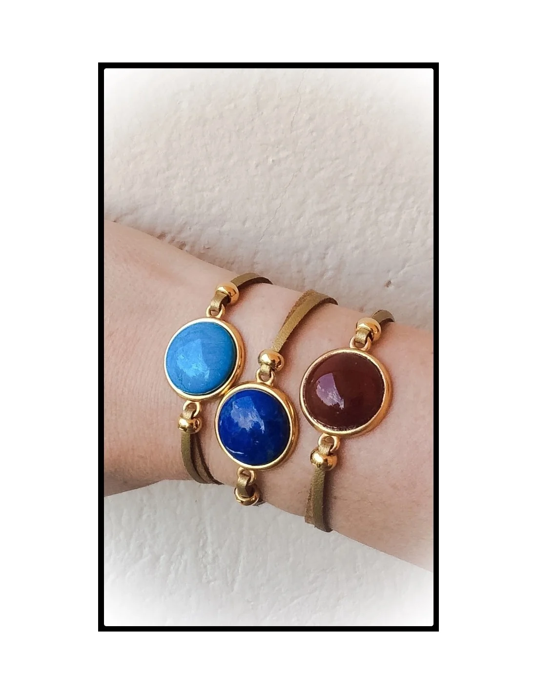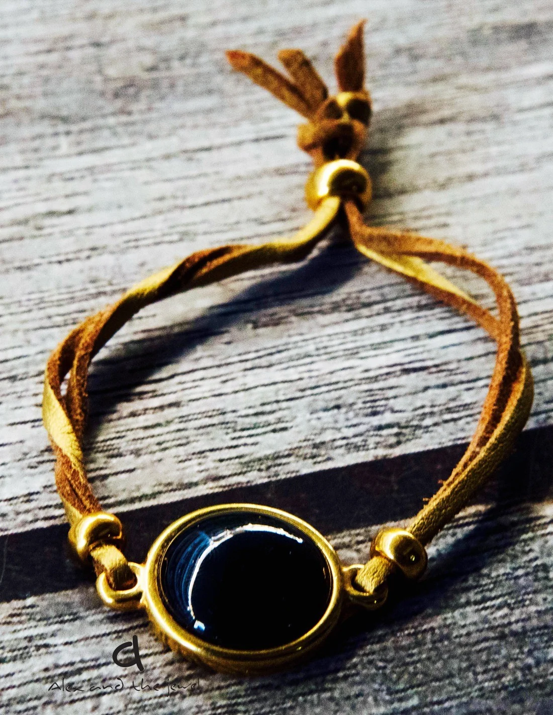 - Υλικά: Ημιπολύτιμος λίθος, double face δέρμα (χρυσό-καφέ) με αυξομείωση