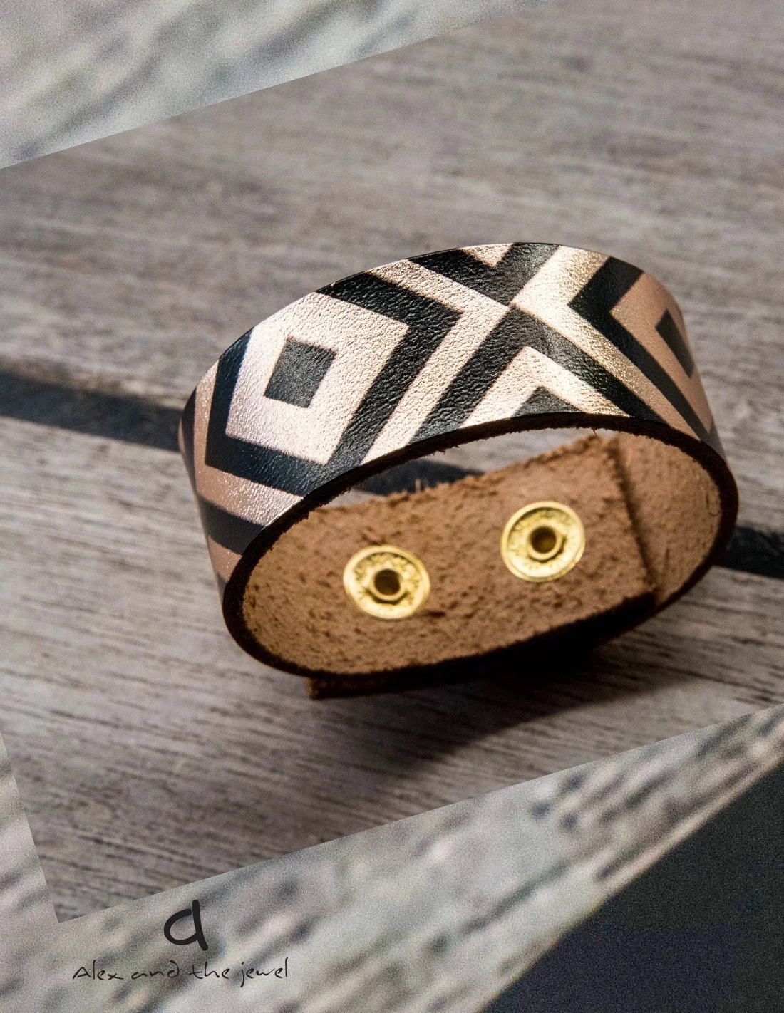 Το Aztec είναι ένα εντυπωσιακό χειροποίητο δερμάτινο βραχιόλι με μοναδικά γεωμετρικά σχέδια που συνδυάζει το μοντέρνο με το κλασικό. Διατίθεται σε μαύρο με ροζ χρυσό ή χρυσό και διαθέτει ρυθμιζόμενο κούμπωμα με τρουκς για άνεση και στυλ. Το βραχιόλι αυτό προσθέτει μια τολμηρή πινελιά σε κάθε εμφάνιση.