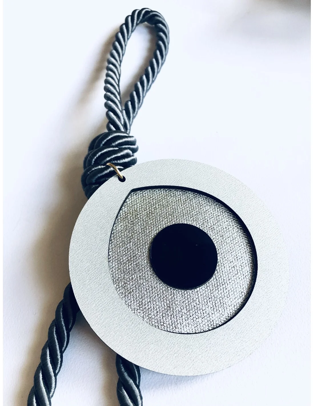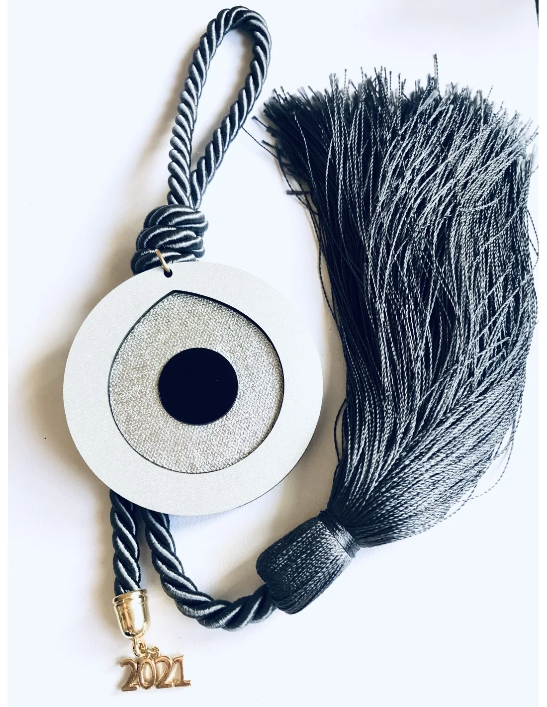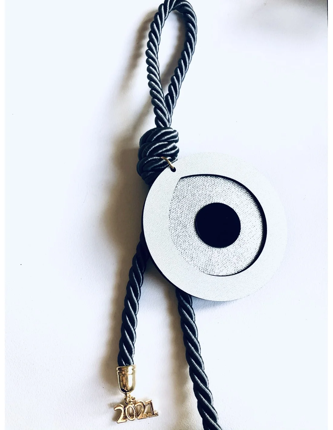 Γούρι evil eye με μακριά φούντα δεμένο σε μπλε σκούρο κορδόνι.