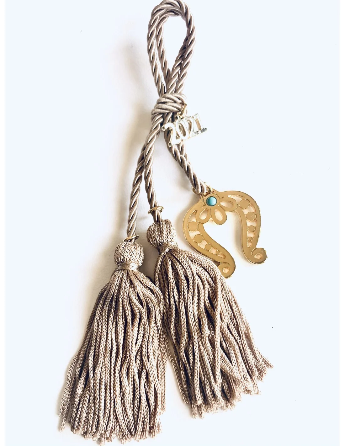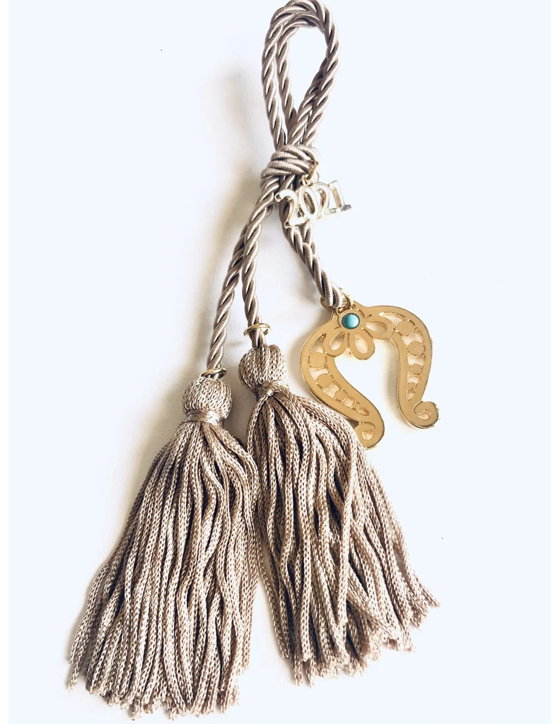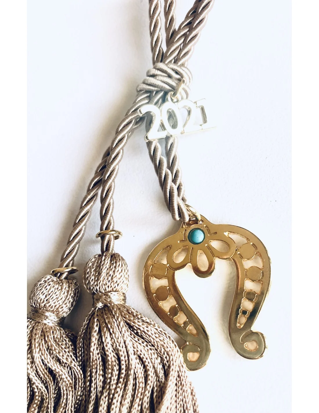 Διακοσμητικό γούρι με κρεμαστό στοιχείο πέταλο σε χρυσό χρώμα με κεντρική πέτρα Χαολίτη, δεμένο σε κορδόνι σε μπεζ καφέ με διπλή φούντα