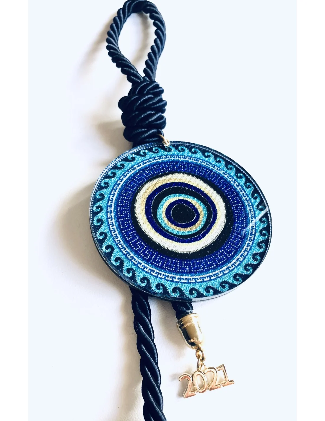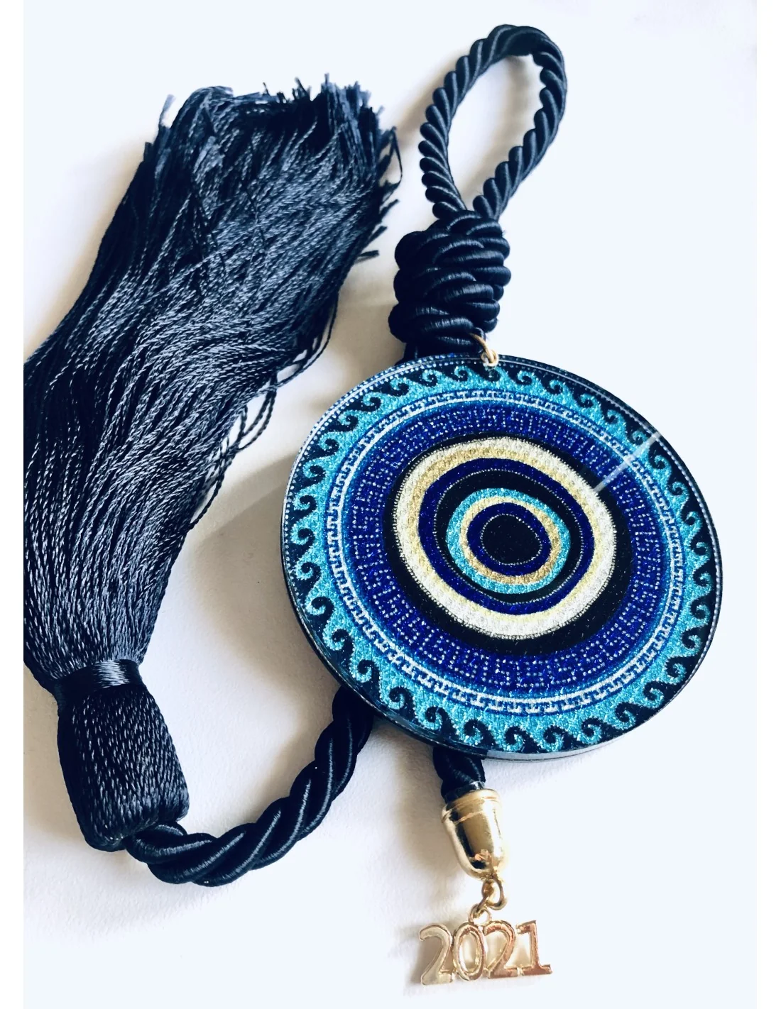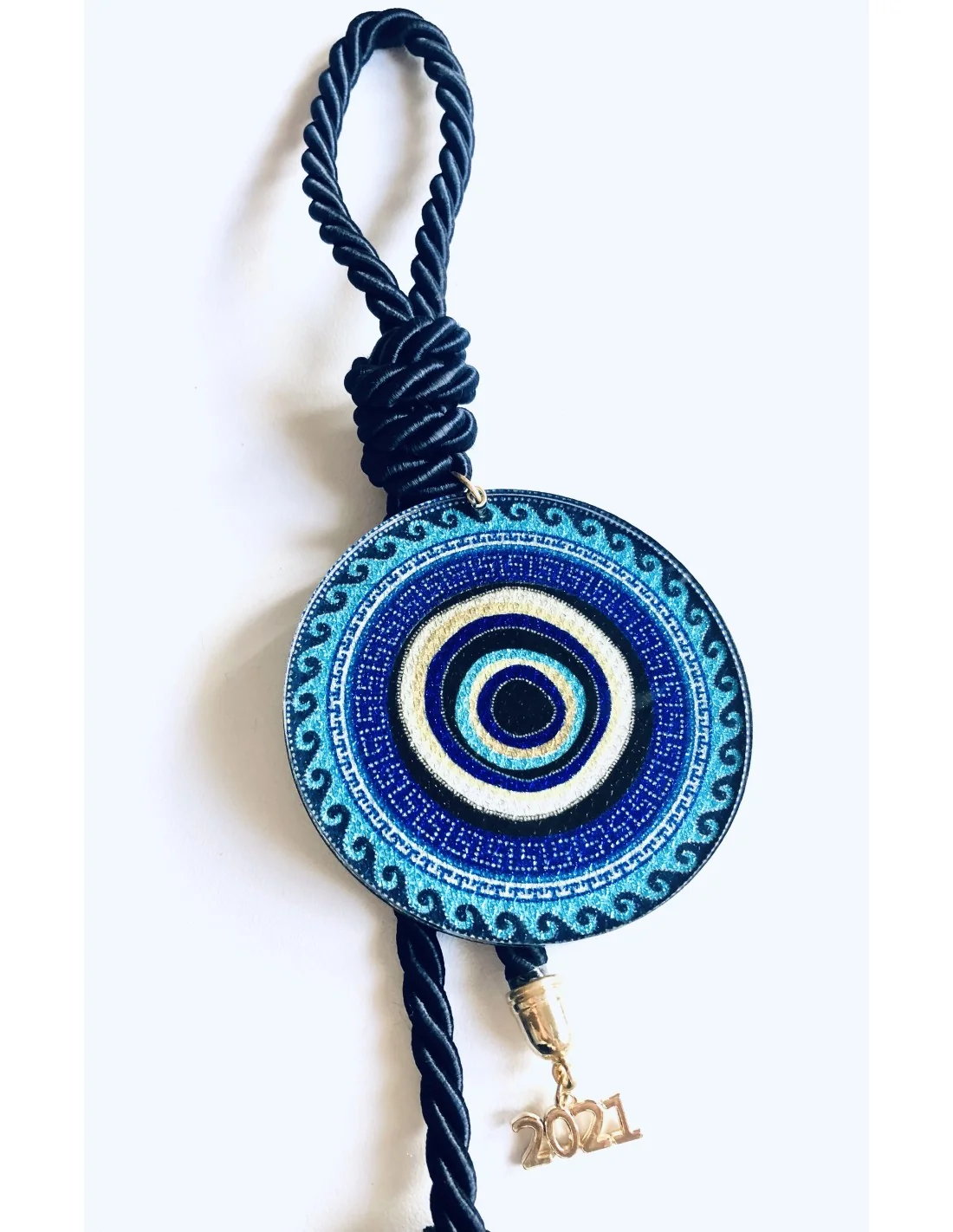 Γούρι τετράφυλλο τριφύλλι με evil eye και μακριά φούντα δεμένο σε μαύρο σκούρο κορδόνι.