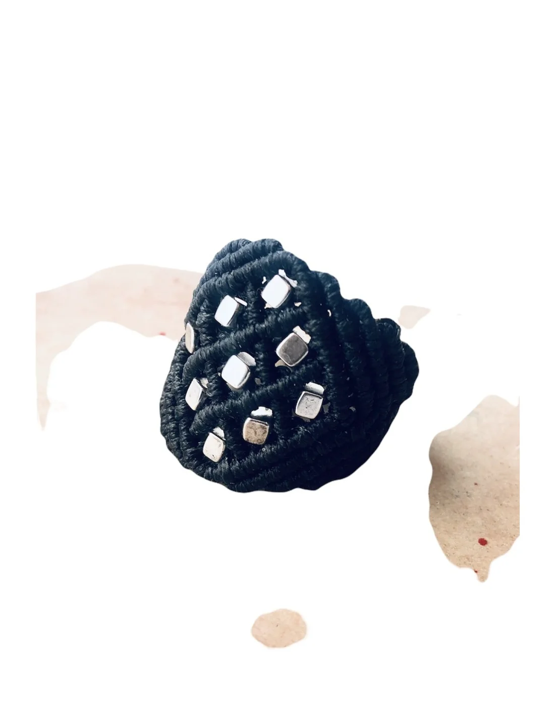 Ανακαλύψτε το χειροποίητο δαχτυλίδι μακραμέ "Dorin", μια μοναδική δημιουργία που συνδυάζει την τέχνη του μακραμέ με τις εντυπωσιακές πέτρες Αιματίτη.