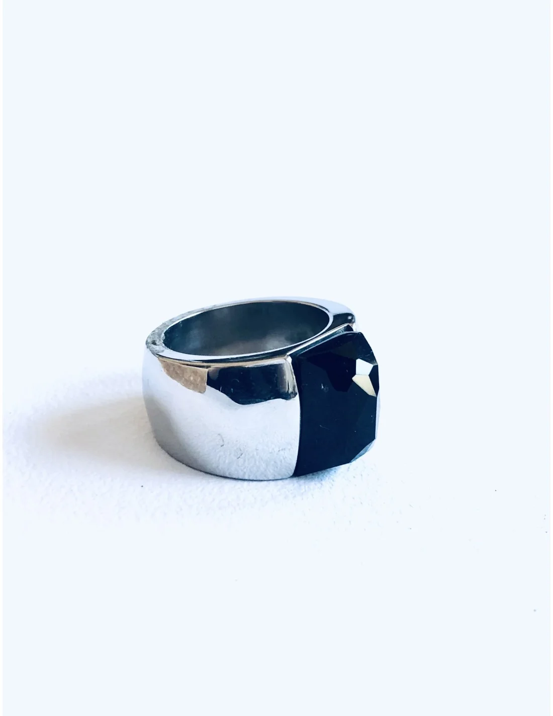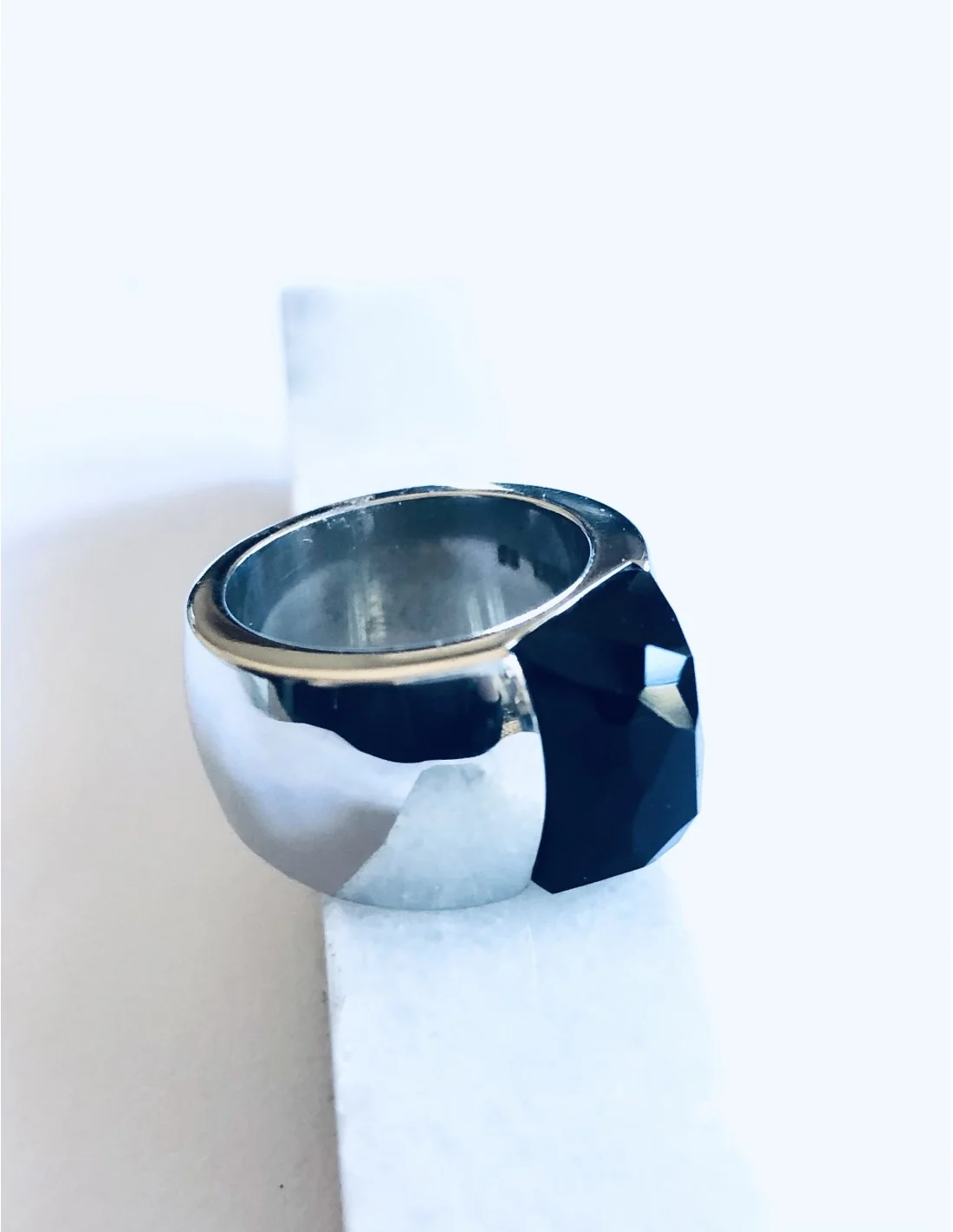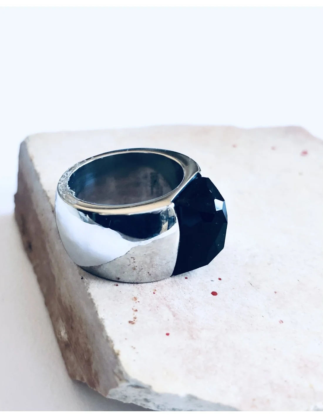 Χειροποίητο γυναικείο statement δαχτυλίδι από ατσάλι με μεγάλο μαύρο κρύσταλλο Inferno