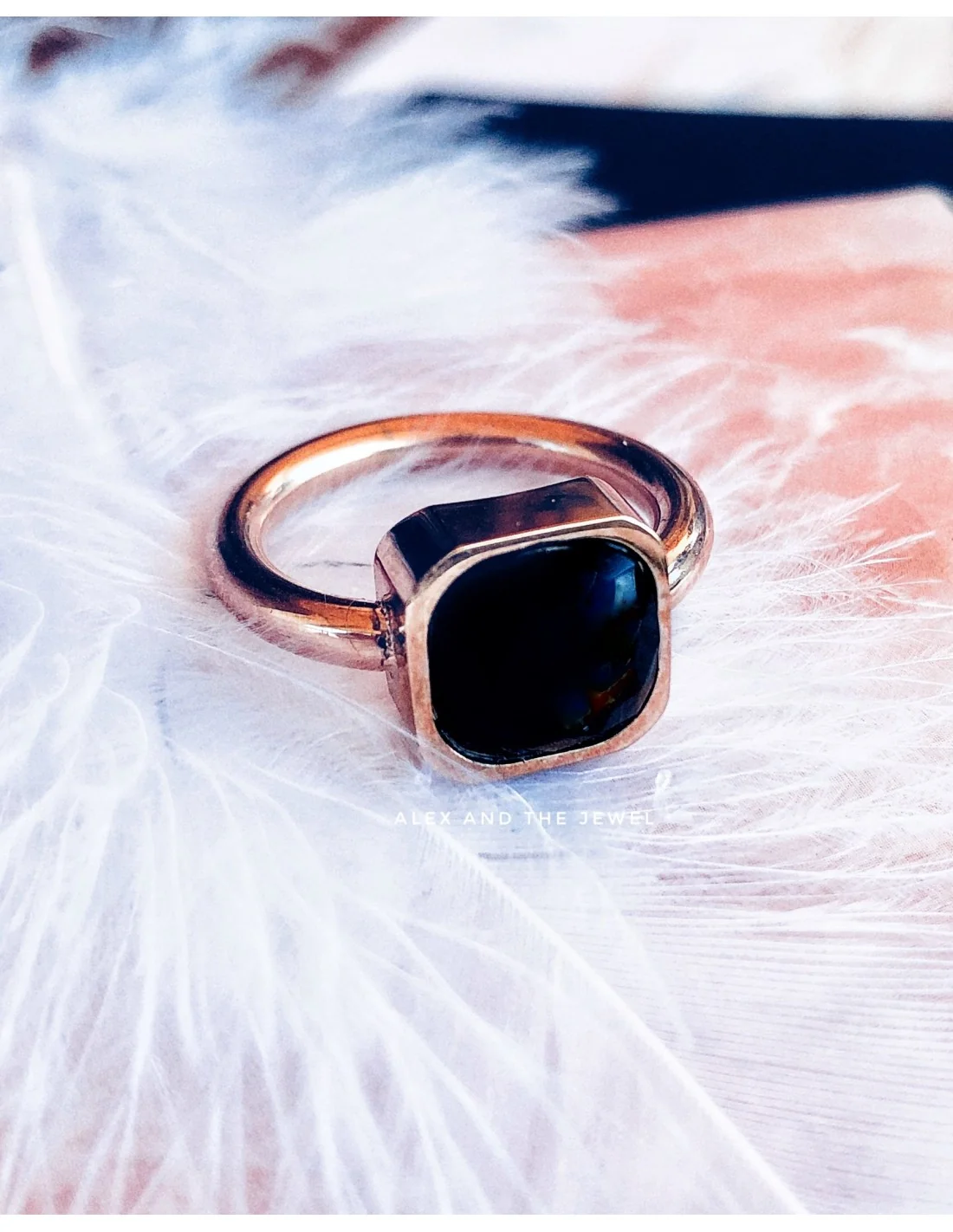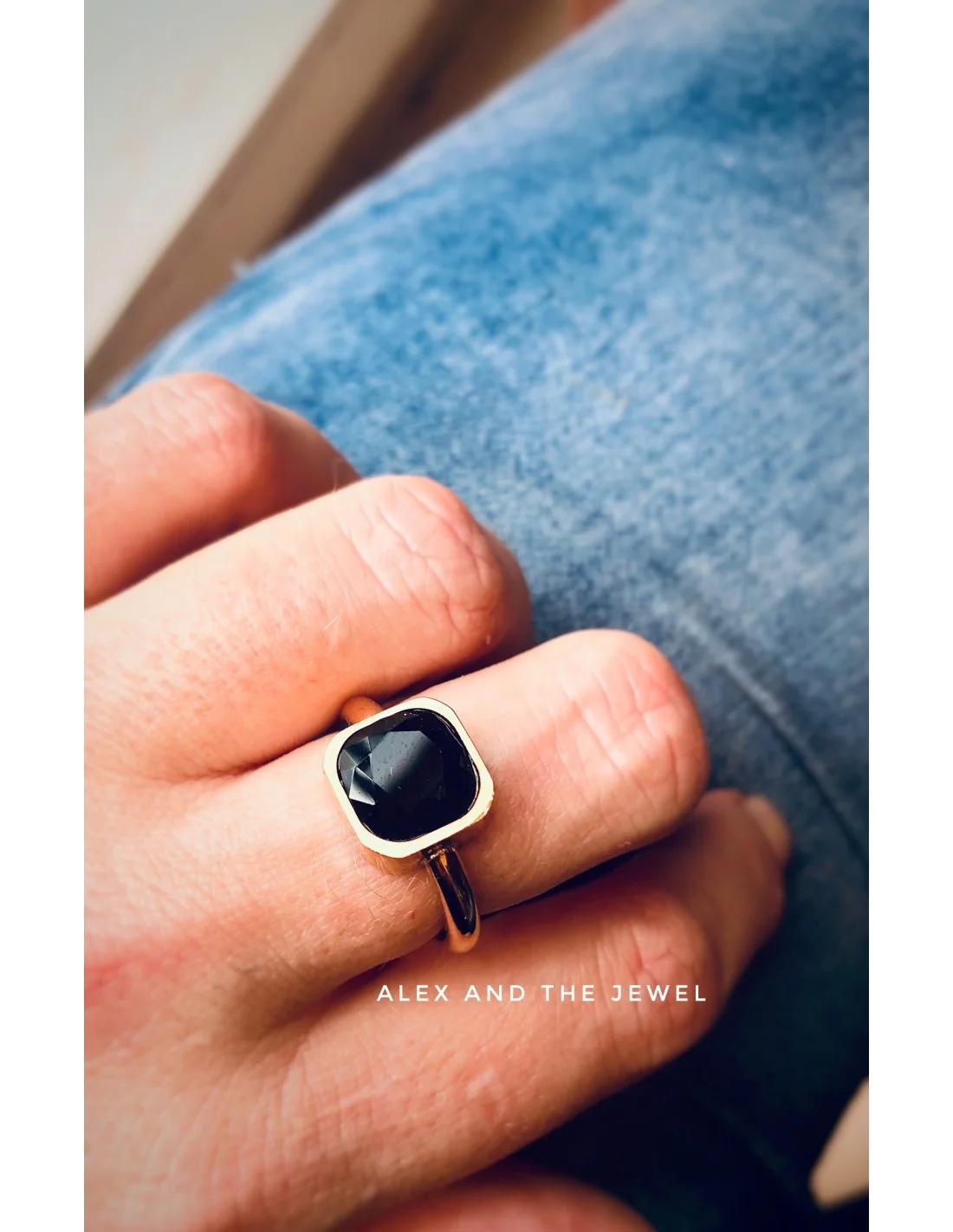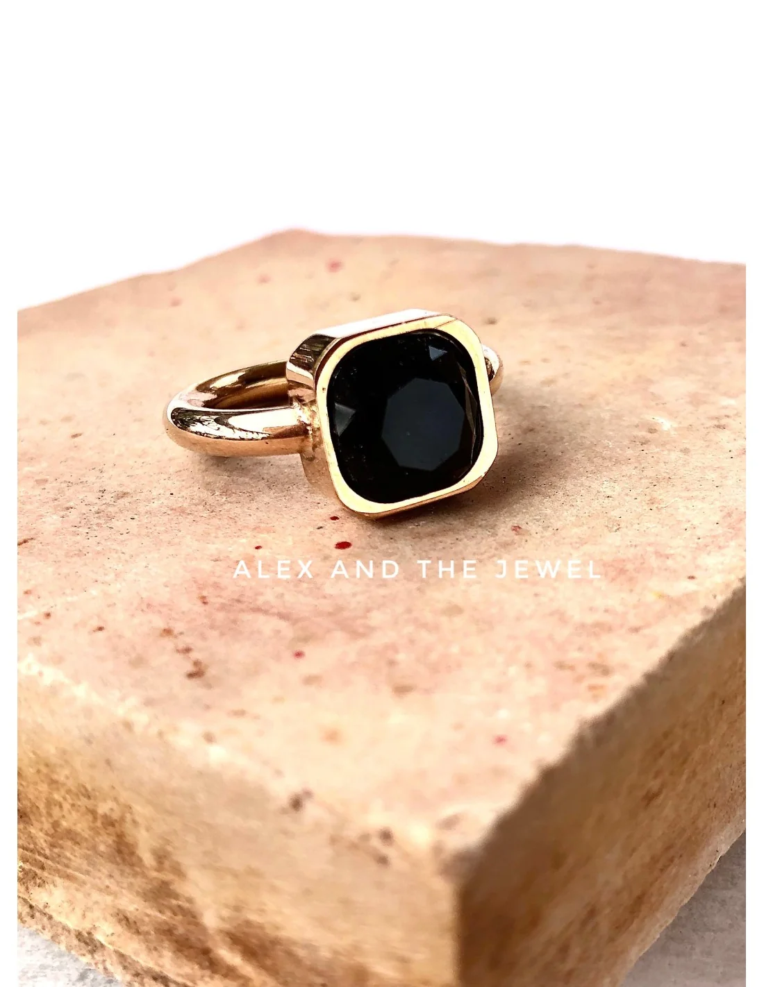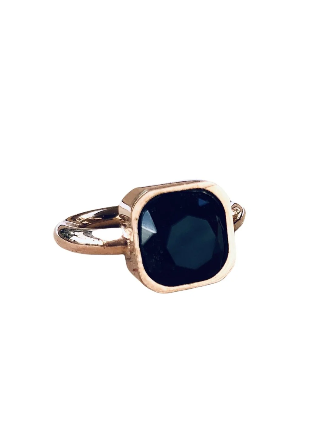 Αναβαθμίστε το στυλ σας με το γυναικείο δαχτυλίδι "Clio", κατασκευασμένο από επίχρυσο ατσάλι και διακοσμημένο με εντυπωσιακό τετράγωνο μαύρο κρύσταλλο Τσεχίας.