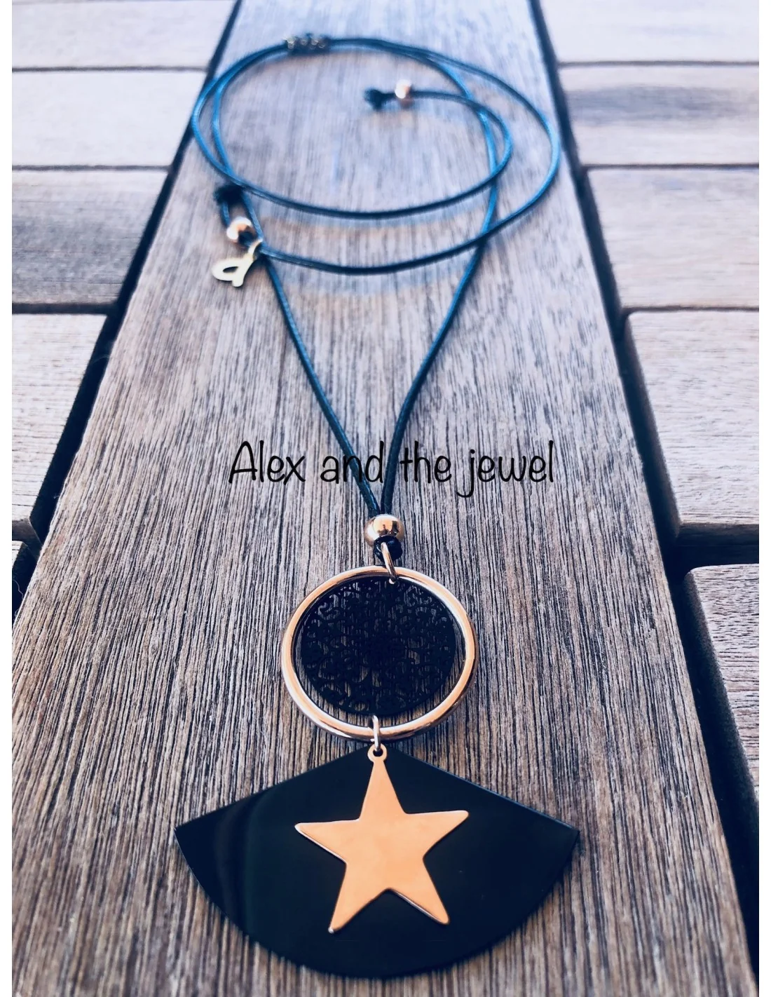 Αυτό το μοναδικό κόσμημα διαθέτει κρεμαστό στοιχείο από ατσάλι σε σχέδιο αστέρι, συνδυασμένο με έναν διακοσμητικό διάτρητο δίσκο φιλιγκρί.