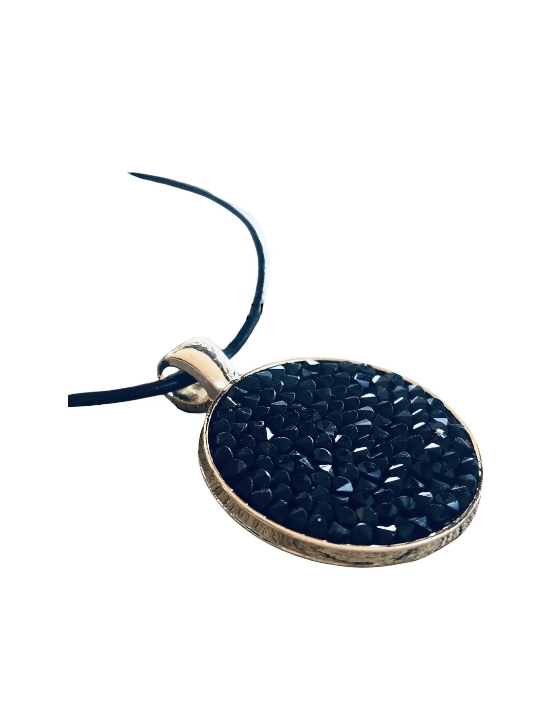 Χειροποίητο κόσμημα κολιέ με κυκλικό, επίχρυσο στοιχείο με ανάγλυφο γκλίτερ, δεμένο σε δερμάτινο κορδόνι με αυξομείωση και επίχρυσα στοιχεία στο τελείωμα "Chimera"