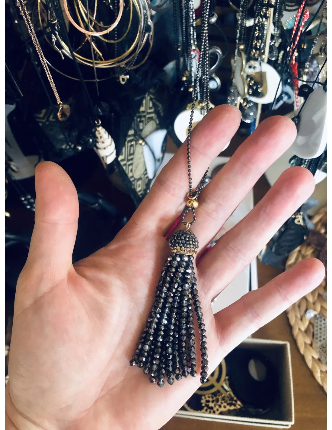 Αυτό το μακρύ κολιέ συνδυάζει την αριστοκρατία με τη μοντέρνα αισθητική, χάρη στη φούντα από κρύσταλλα και τις πέτρες Μαρκασίτη, που δημιουργούν έναν εντυπωσιακό συνδυασμό σε αποχρώσεις blue black.