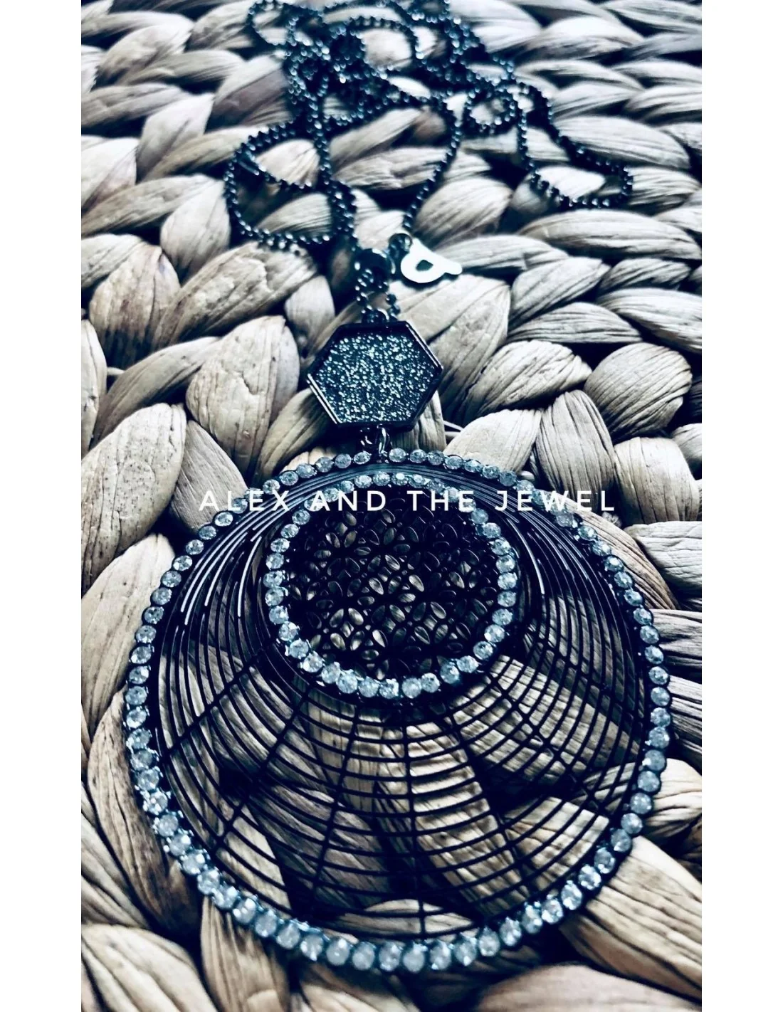 Χειροποίητο κόσμημα κολιέ με στοχείο φιλιγκρί από ατσάλι και κρύσταλλα pave και πολύγωνο στοιχείο με γκρι γκλίτερ "Epidavros"