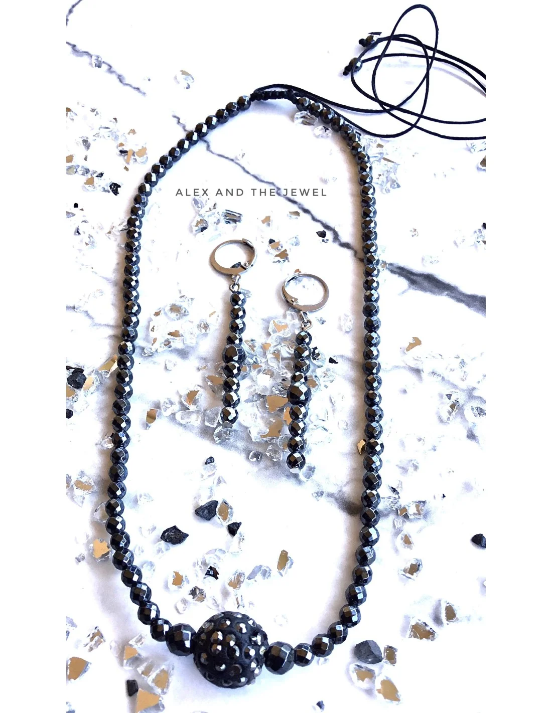 Το κεντρικό στοιχείο είναι μια μπίλια από πέτρες Μαρκασίτη, γνωστές για τη λαμπερή τους όψη και την κομψή αίσθηση που προσδίδουν, ενώ οι πέτρες Αιματίτη ενσωματώνονται για να ενισχύσουν το διαχρονικό και μινιμαλιστικό στυλ του κολιέ.