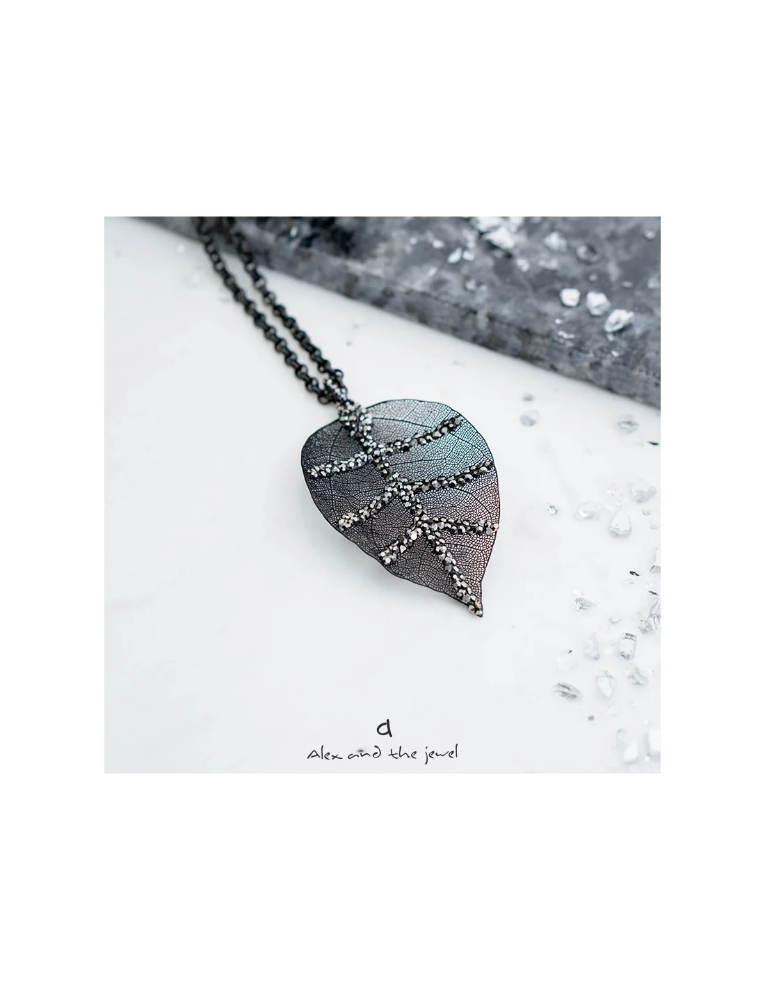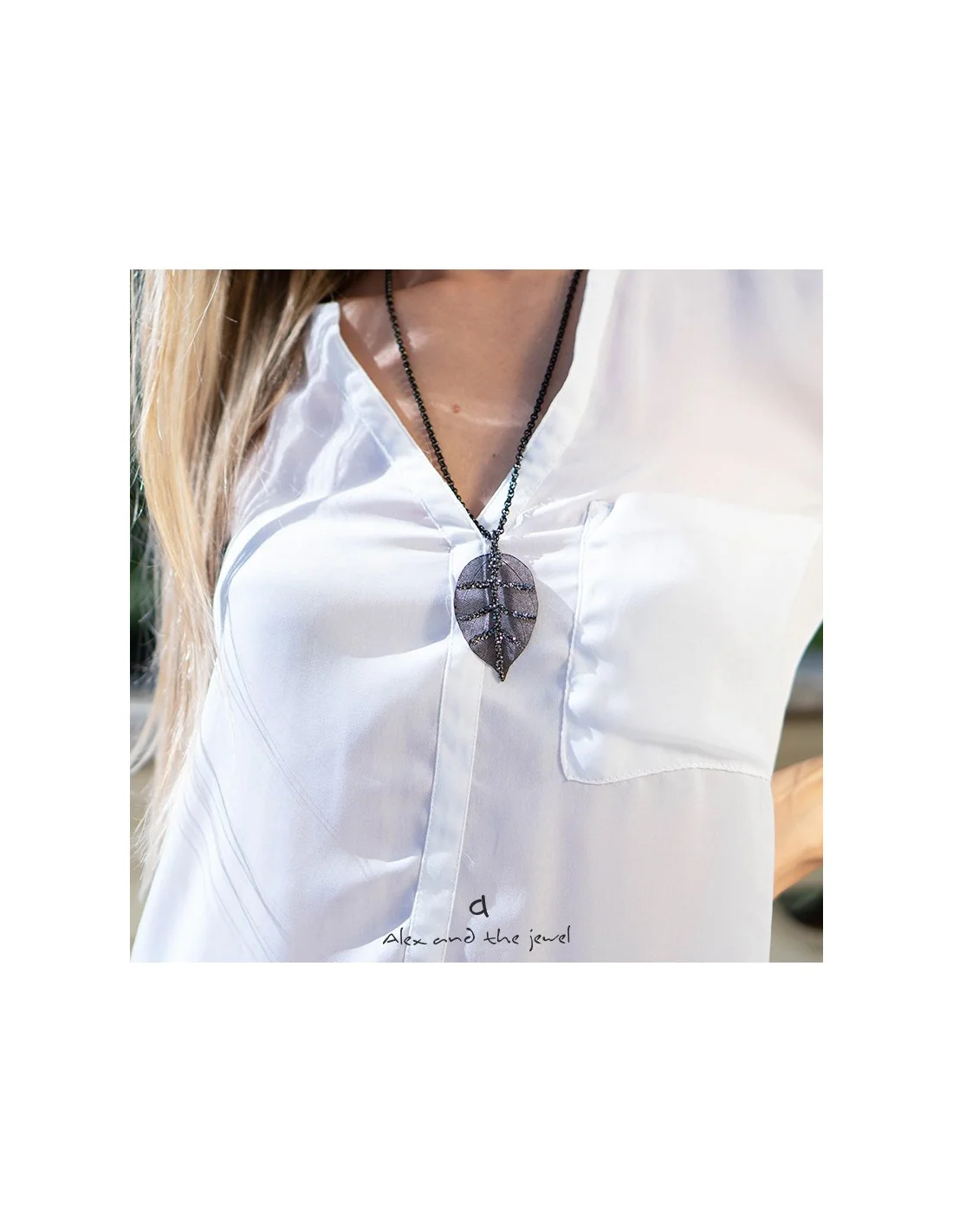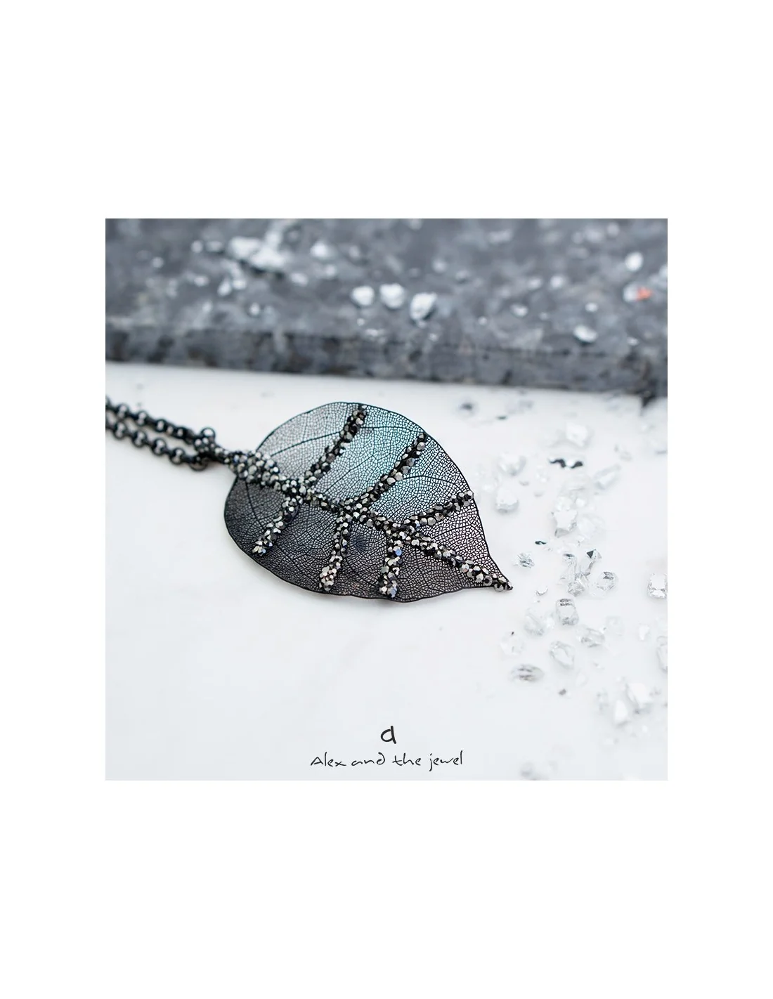 Το κεντρικό στοιχείο του κολιέ είναι ένα φυσικό φύλλο, επεξεργασμένο σε μαύρο χρώμα, που αναδεικνύει τη φυσική του ομορφιά και λεπτομέρεια.