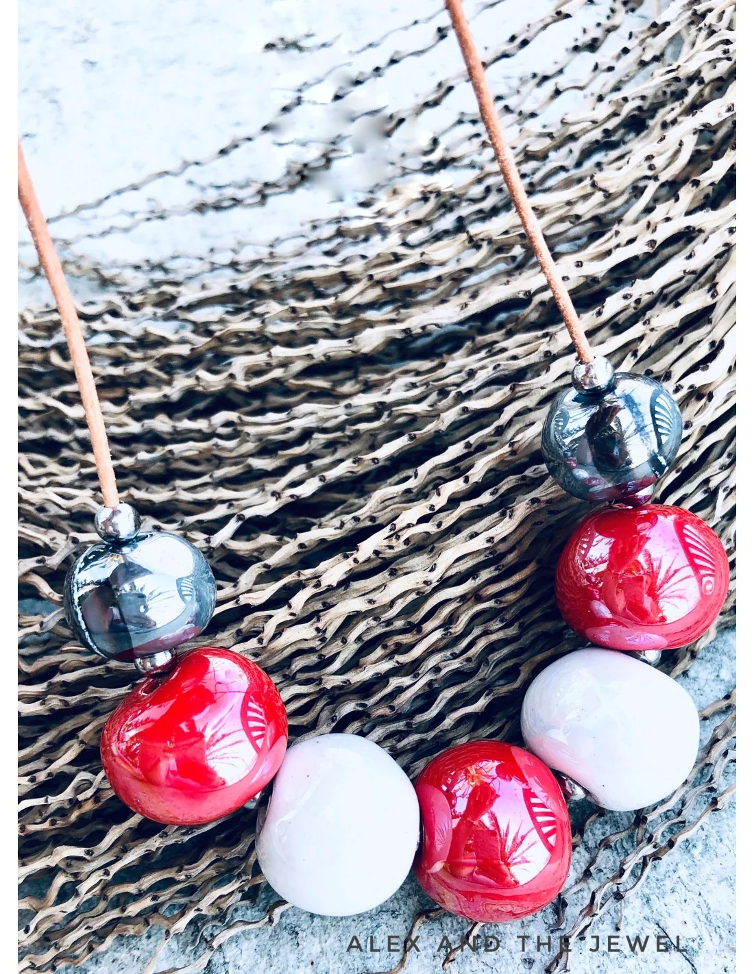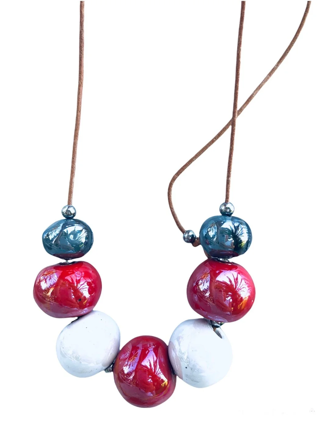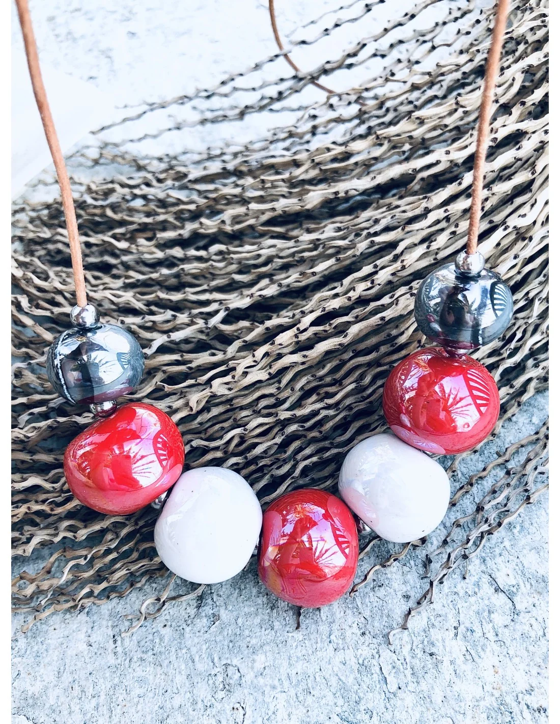 Το χειροποίητο αυτό κολιέ διαθέτει κεραμικά στοιχεία σε σχήμα μπίλιας, σε τρεις υπέροχες αποχρώσεις: λευκό, κόκκινο και μεταλλικό γκρι. Αυτοί οι χρωματικοί συνδυασμοί προσθέτουν μοντέρνο χαρακτήρα και εκλεπτυσμένο στυλ στο ντύσιμό σας, καθιστώντας το ιδανικό για γυναίκες που θέλουν να ξεχωρίζουν με τα αξεσουάρ τους.