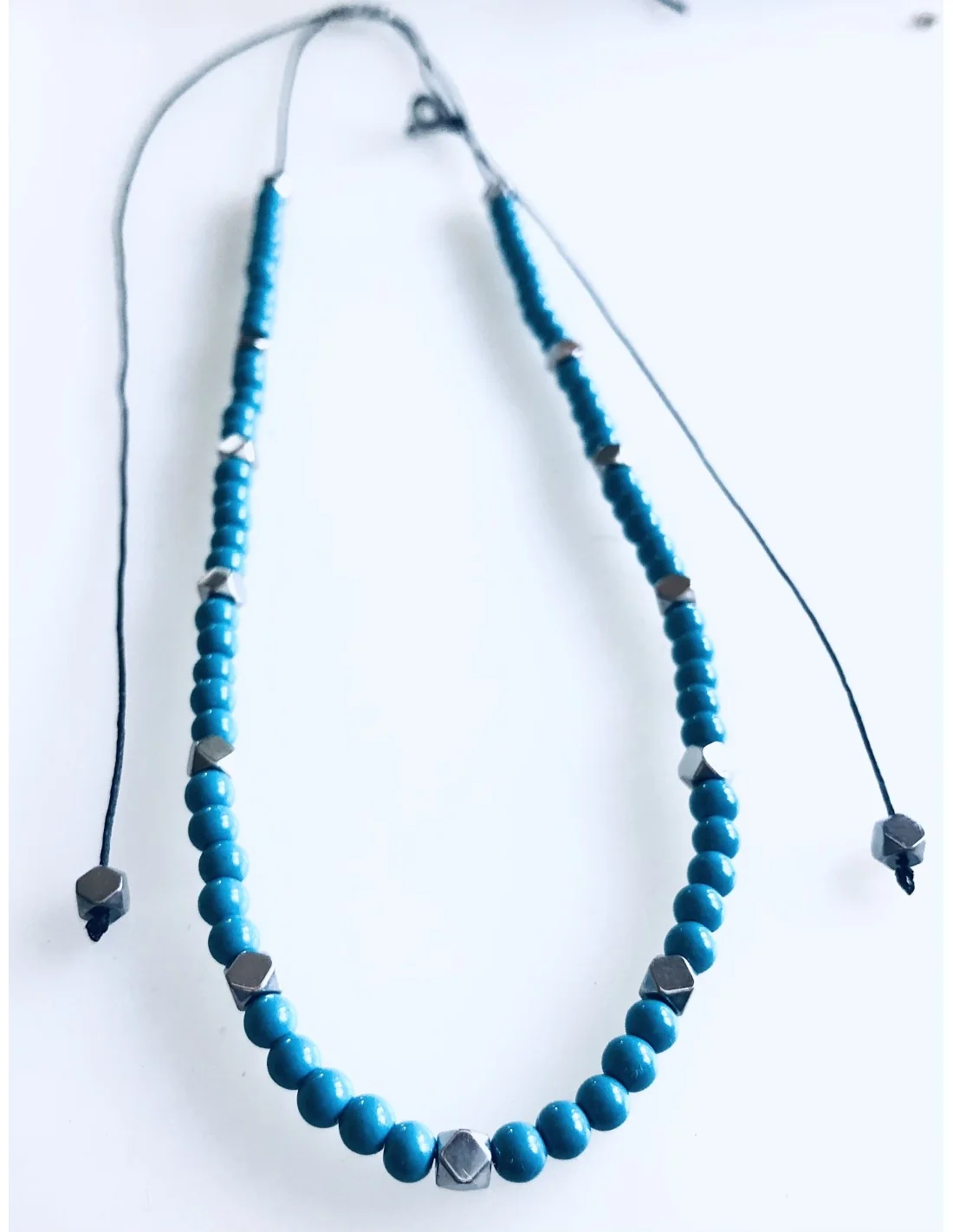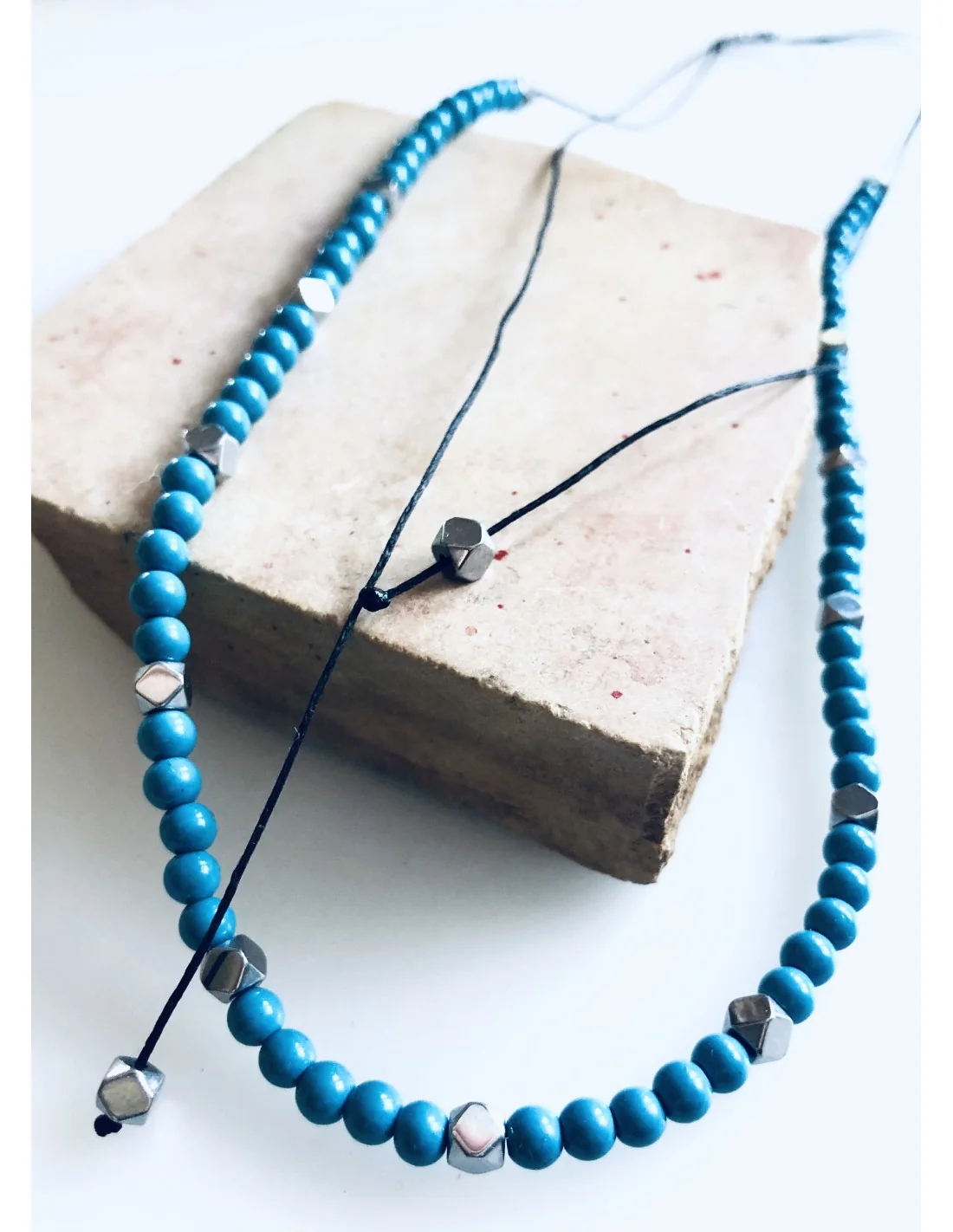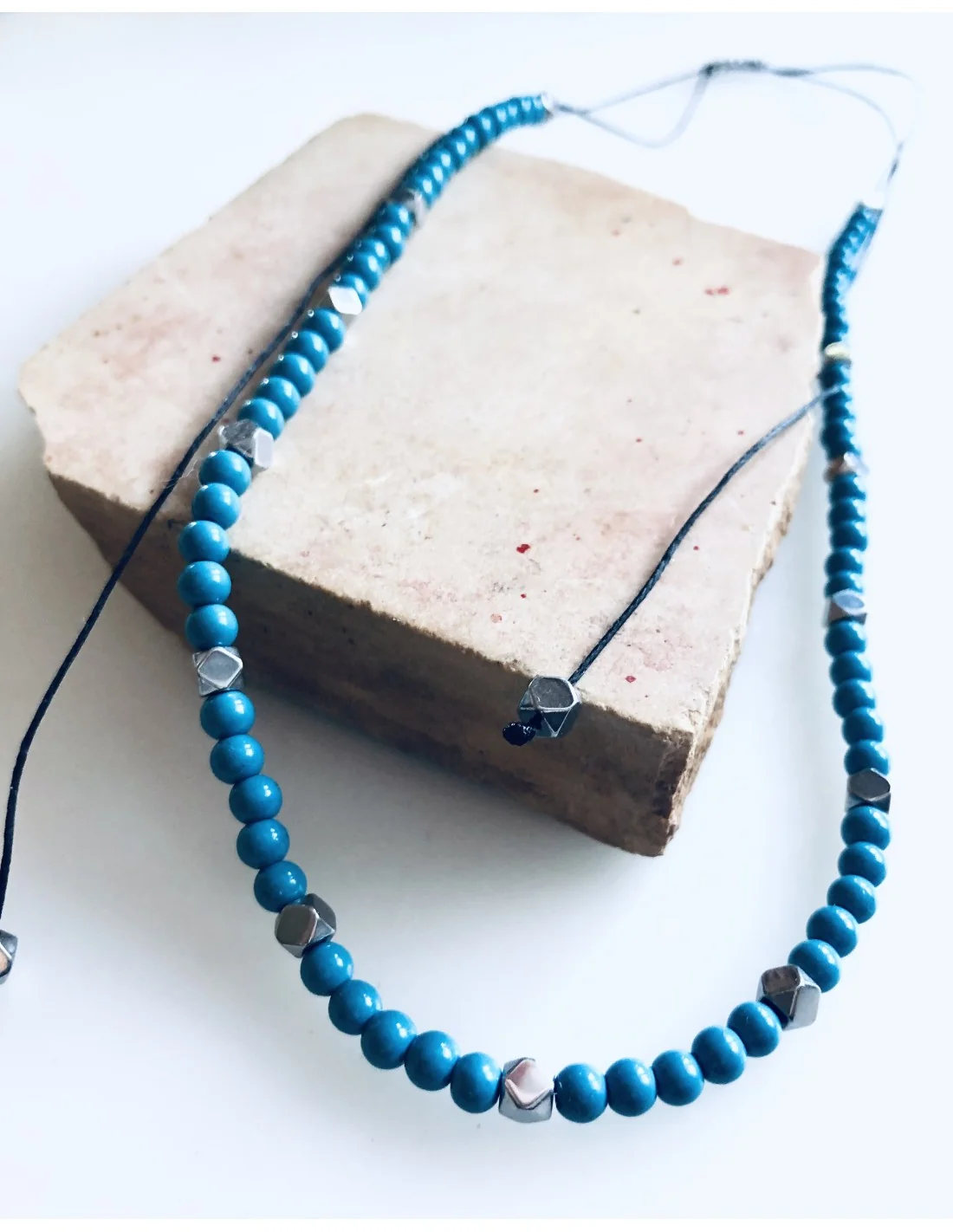 Χειροποίητο γυναικείο κολιέ με πέτρες Αχάτη σε γαλάζιο και πέτρες Αιματίτη ενδιάμεσα "Kalla"