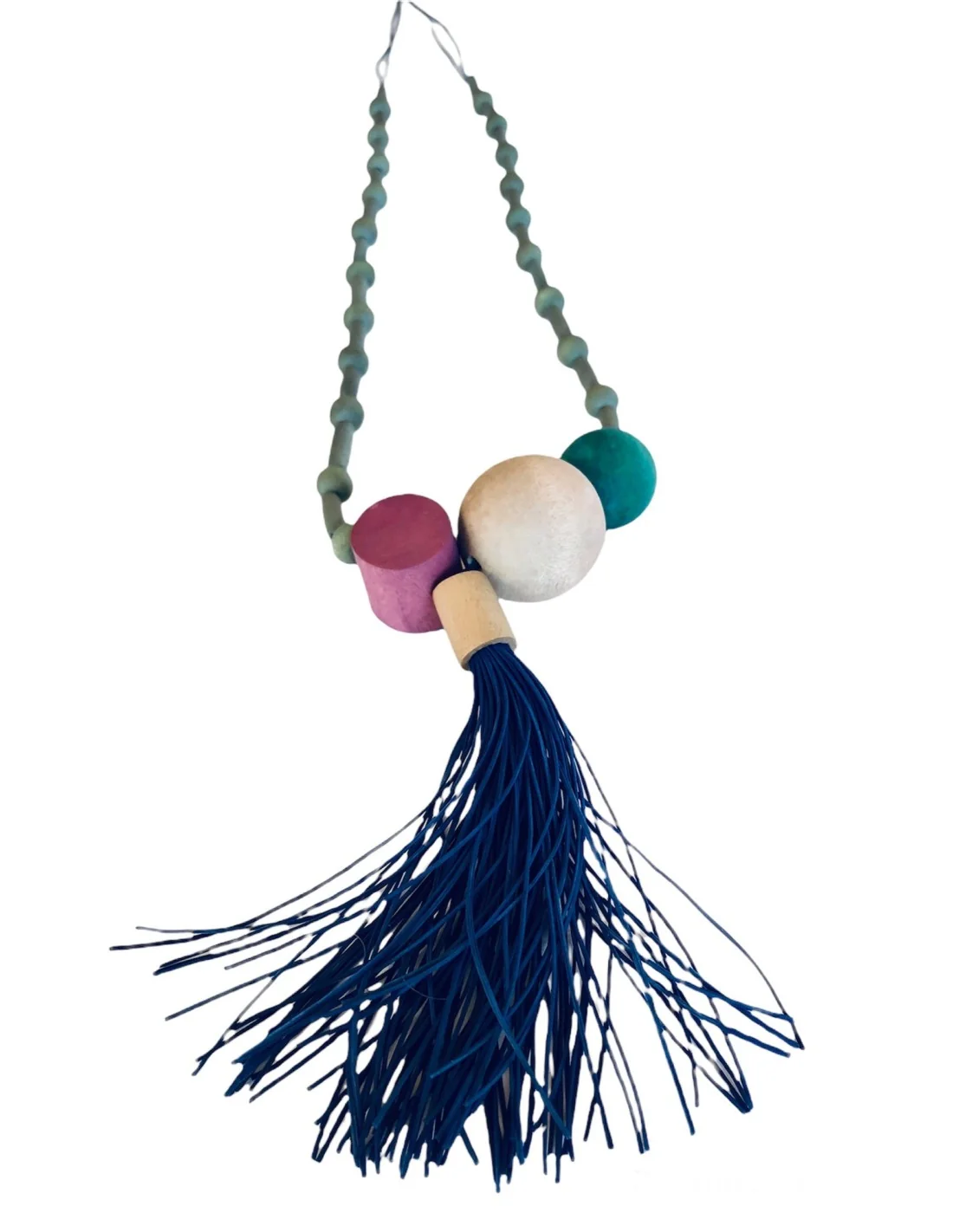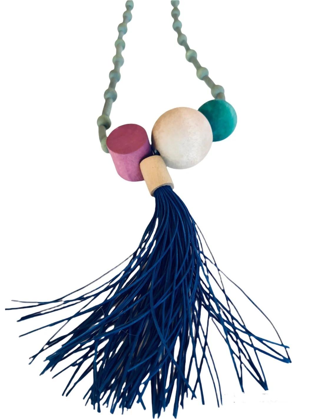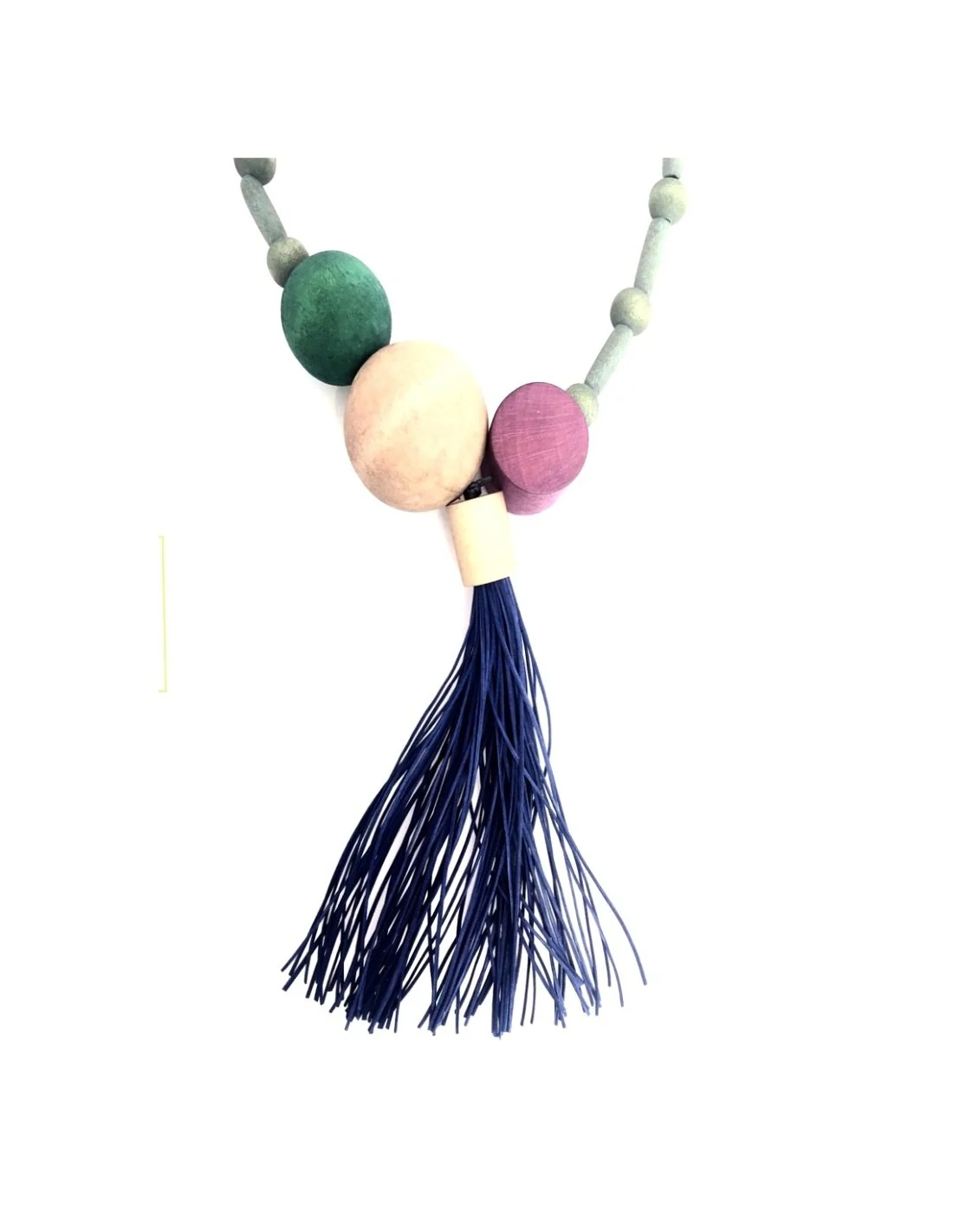 Το κολιέ "Fun" αποτελεί μια παιχνιδιάρικη επιλογή με κομψό χαρακτήρα, συνδυάζοντας το φυσικό ξύλο με φούντα σε μπλε σκούρο και μοντέρνες λεπτομέρειες από καουτσούκ.