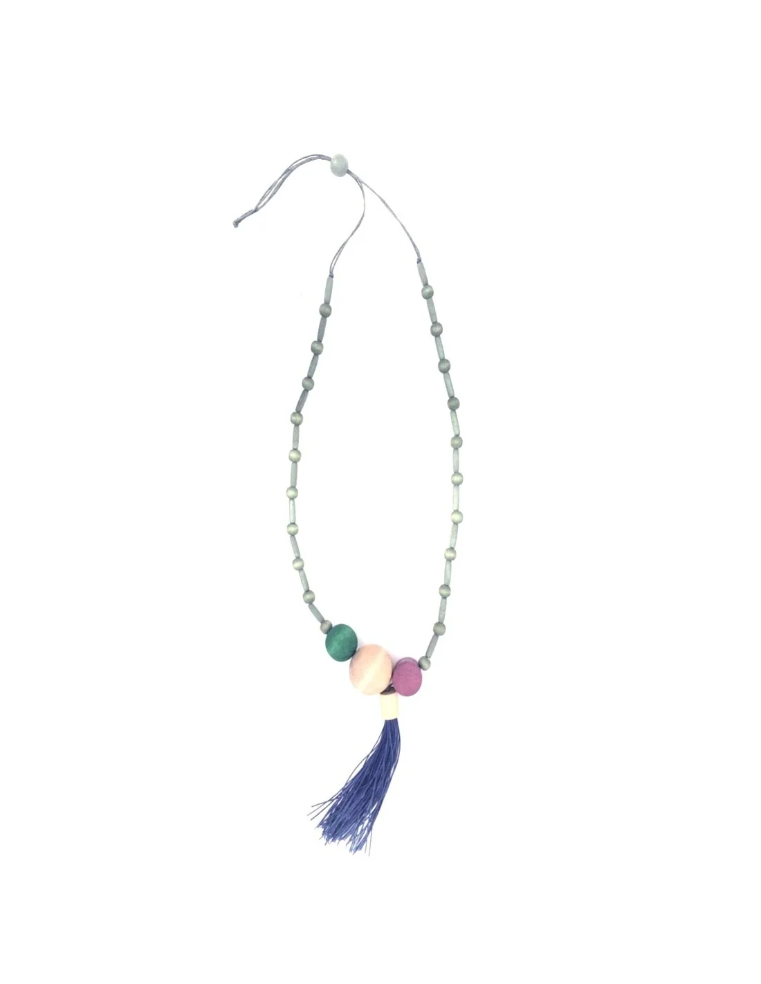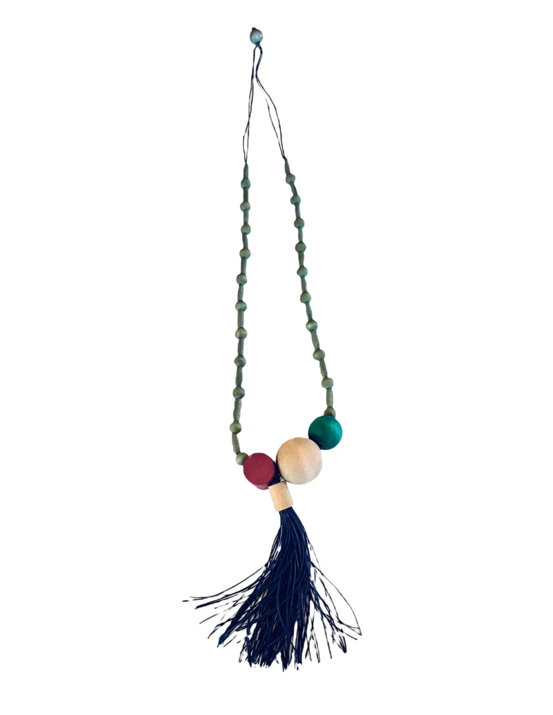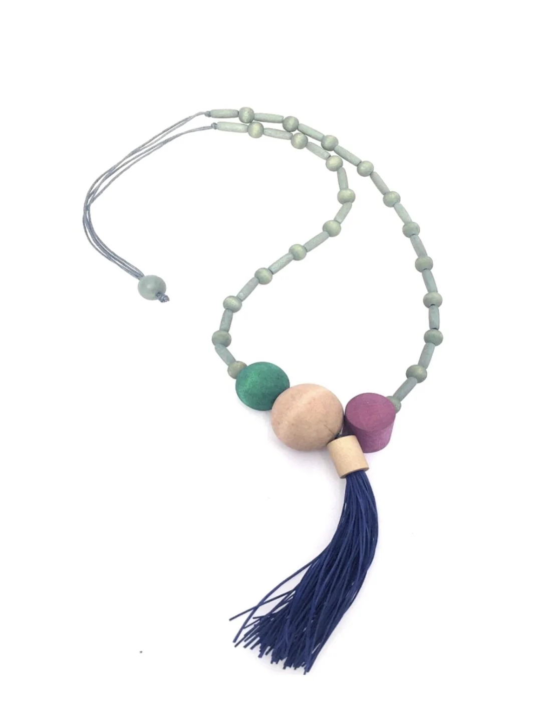 Το κολιέ "Fun" αποτελεί μια παιχνιδιάρικη επιλογή με κομψό χαρακτήρα, συνδυάζοντας το φυσικό ξύλο με φούντα σε μπλε σκούρο και μοντέρνες λεπτομέρειες από καουτσούκ.