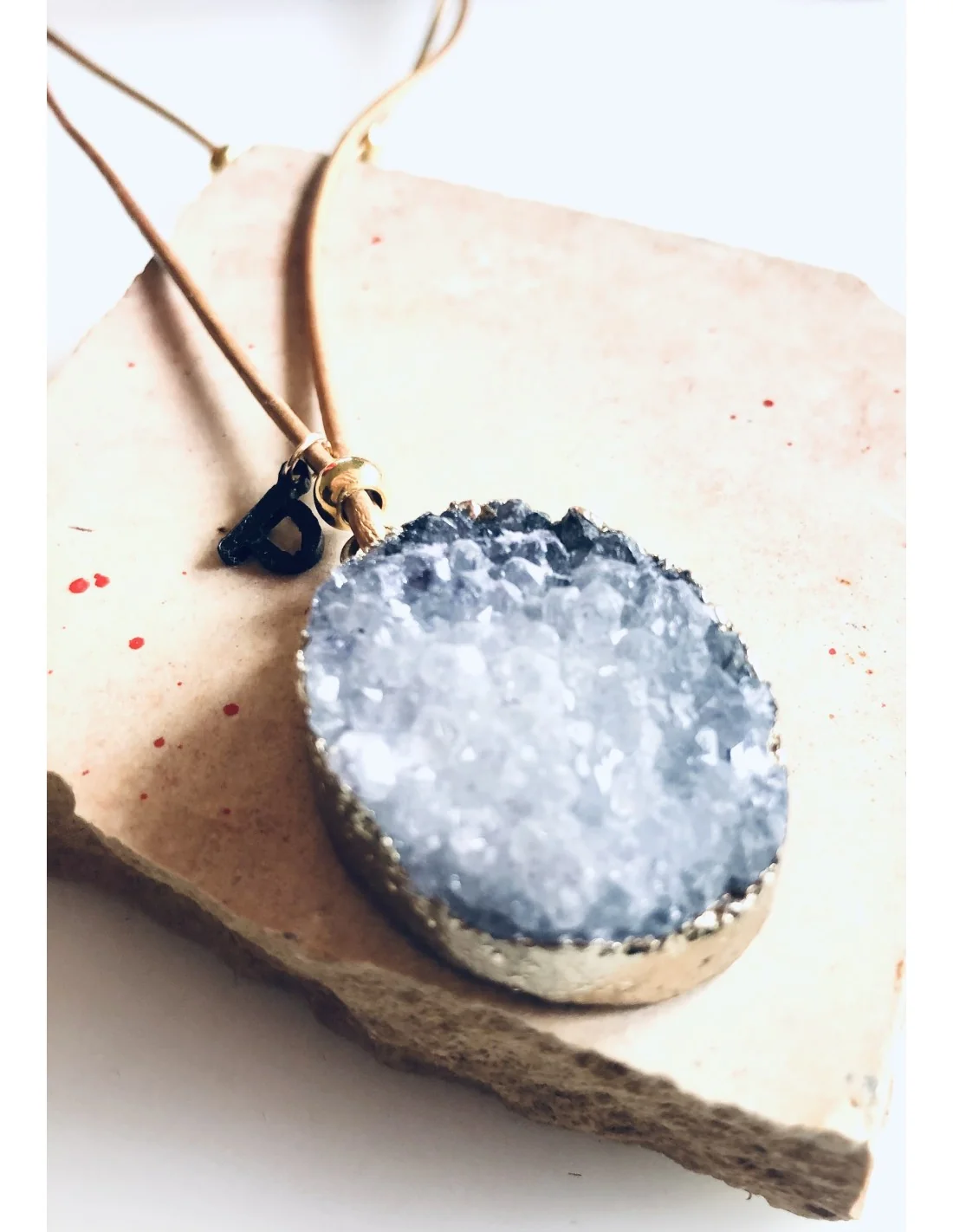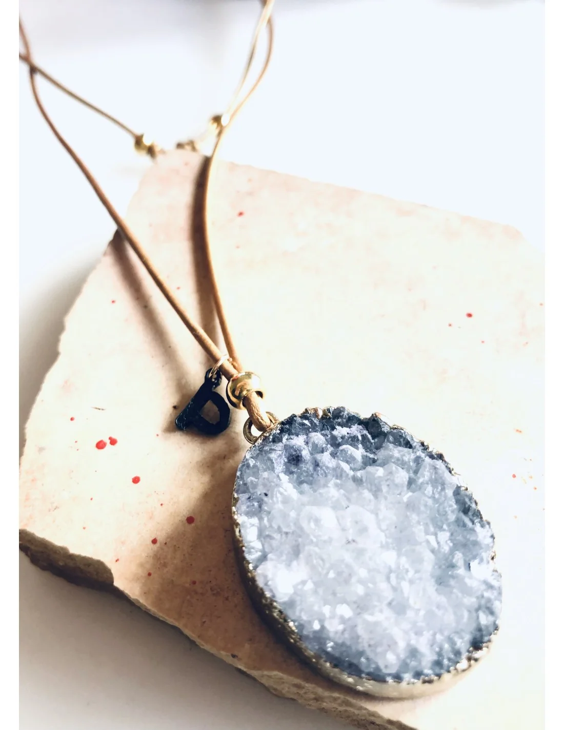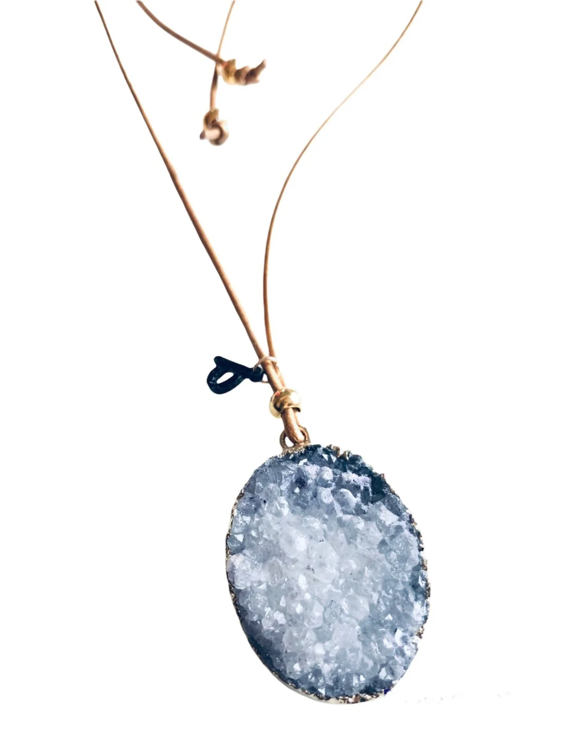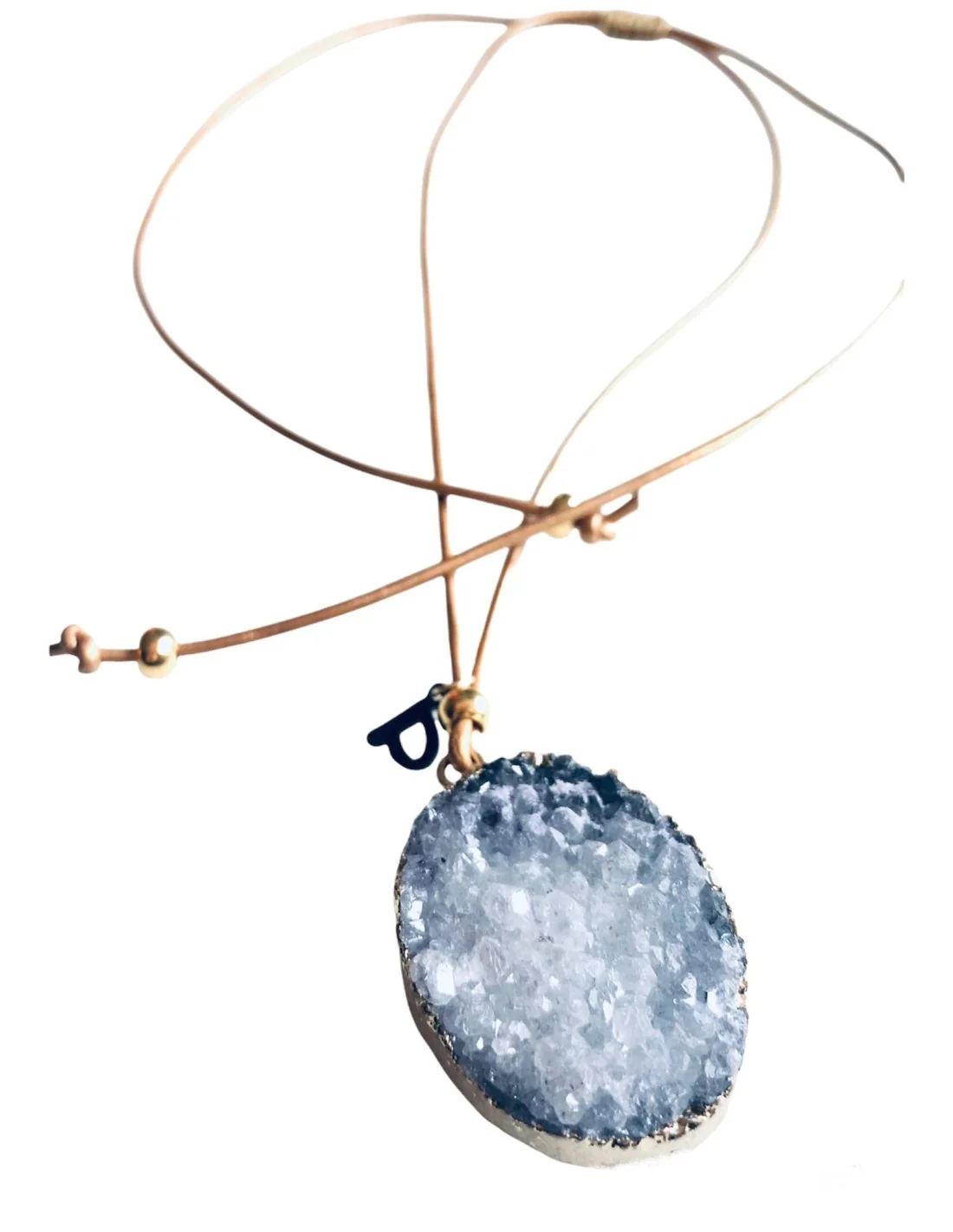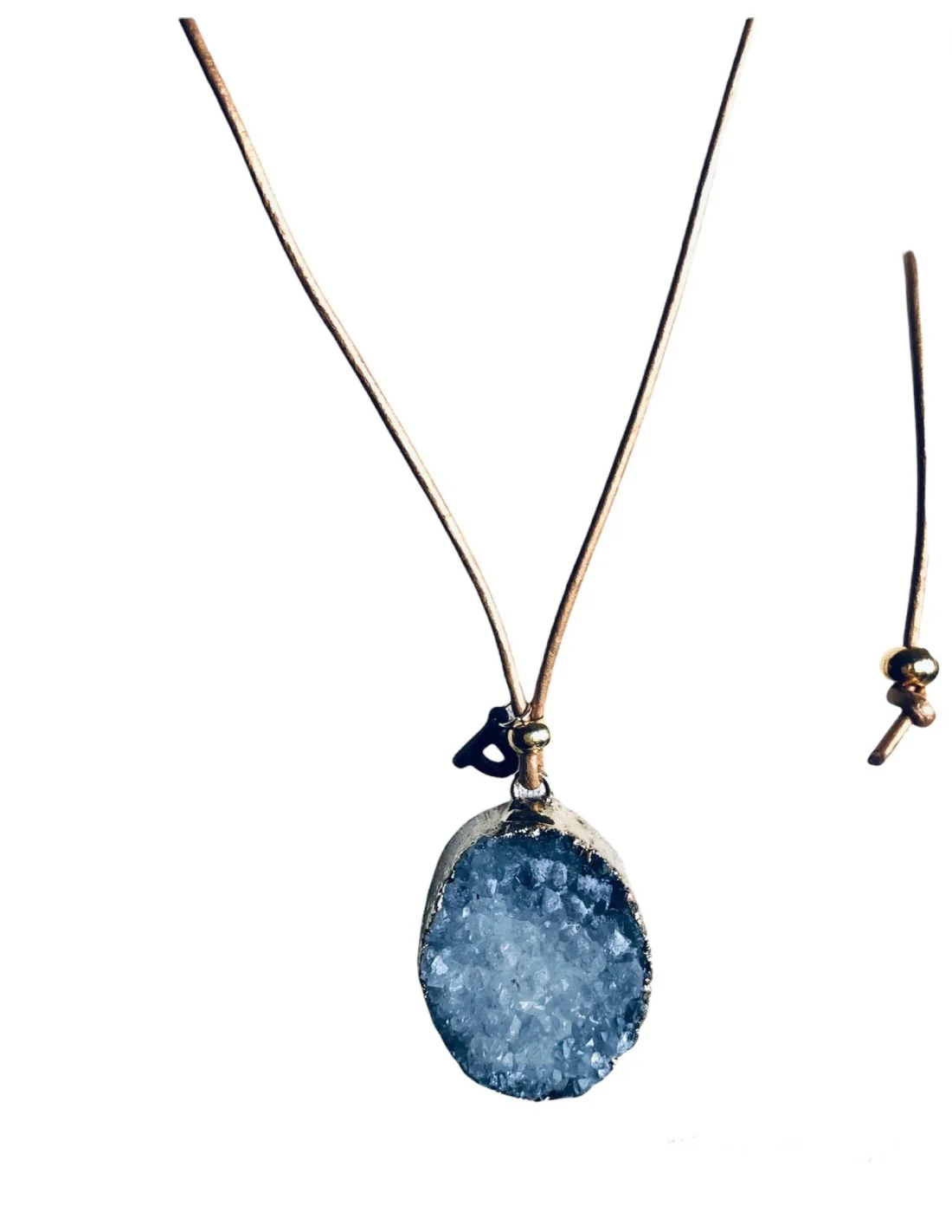 Αναδείξτε την κομψότητά σας με το χειροποίητο κολιέ "Jodi", το οποίο συνδυάζει τη φυσική ομορφιά της ημιπολύτιμης πέτρας Αχάτη σε γκρι απόχρωση με ένα κομψό δερμάτινο κορδόνι.