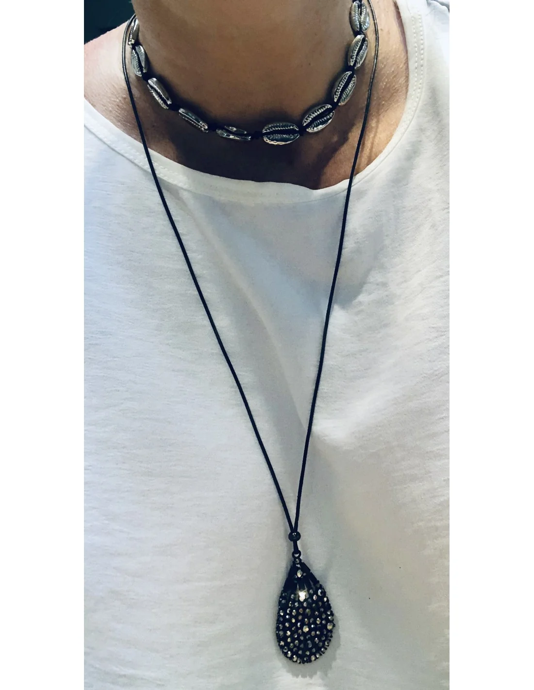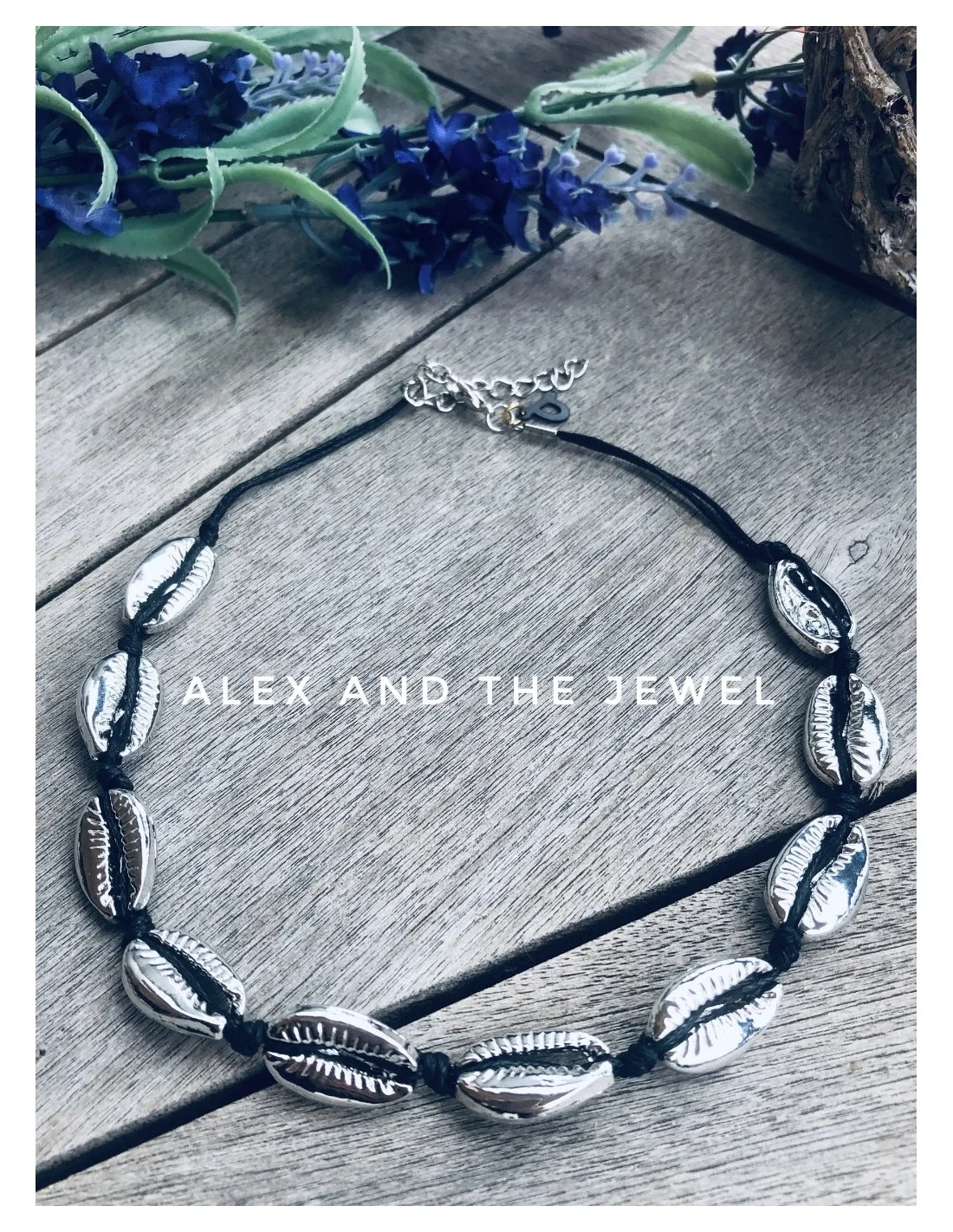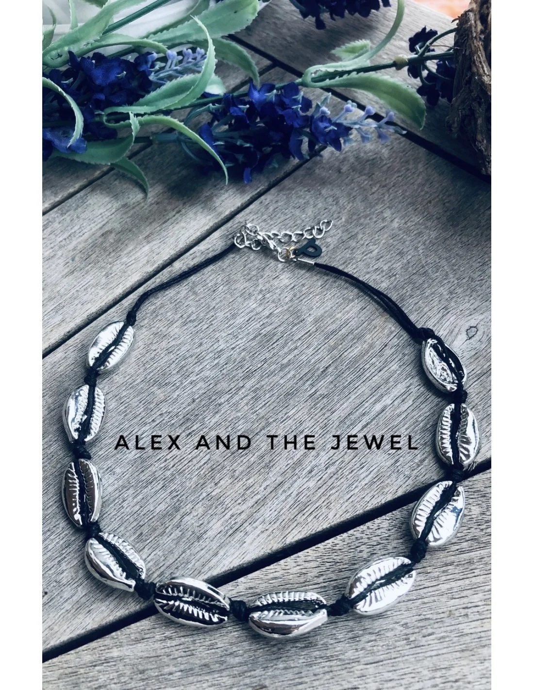 Τα ασημί κοχύλια προσθέτουν μια γοητευτική θαλασσινή αίσθηση, ενώ το μαύρο κορδόνι ολοκληρώνει το σχέδιο με κομψότητα. Αυτό το κόσμημα είναι ιδανικό για να σας συνοδεύσει από τις καλοκαιρινές σας βόλτες έως τις νυχτερινές σας εξόδους.