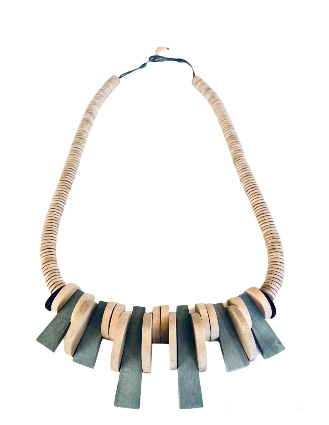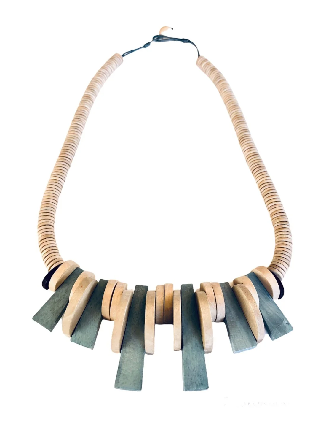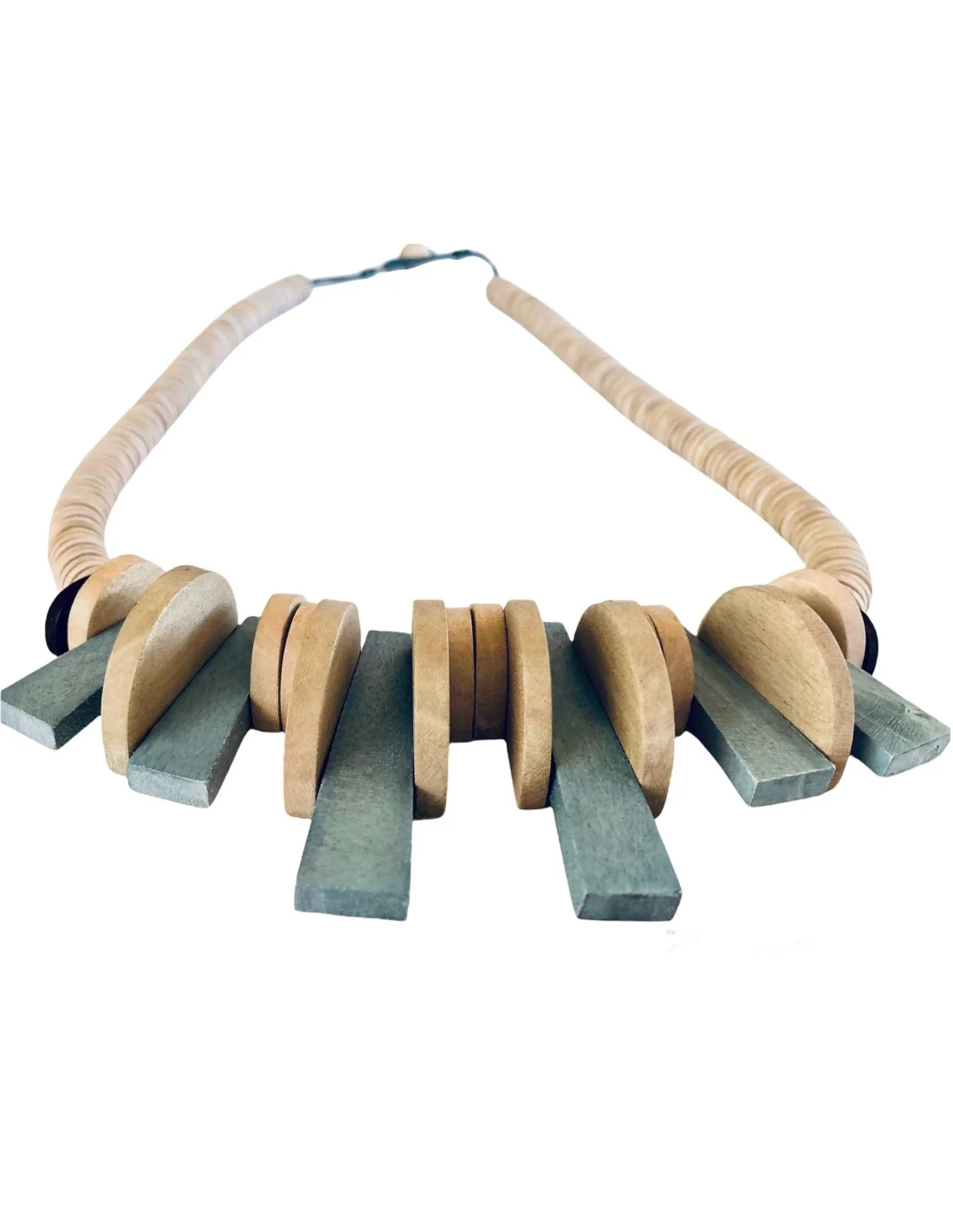 Αναδείξτε τη φυσική σας ομορφιά με το χειροποίητο κολιέ "Mohican", φτιαγμένο από υψηλής ποιότητας ξύλο σε αποχρώσεις μπεζ και χακί.