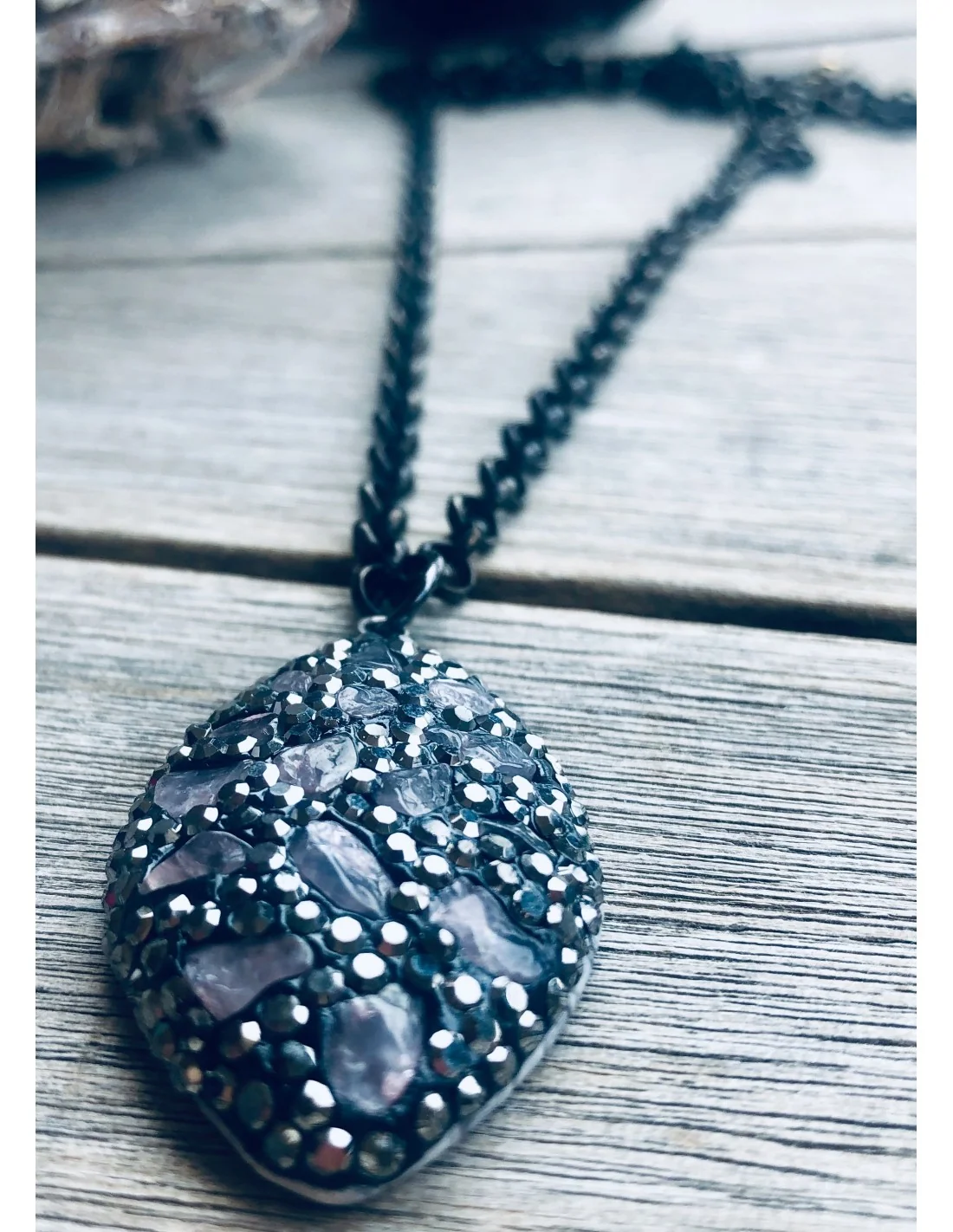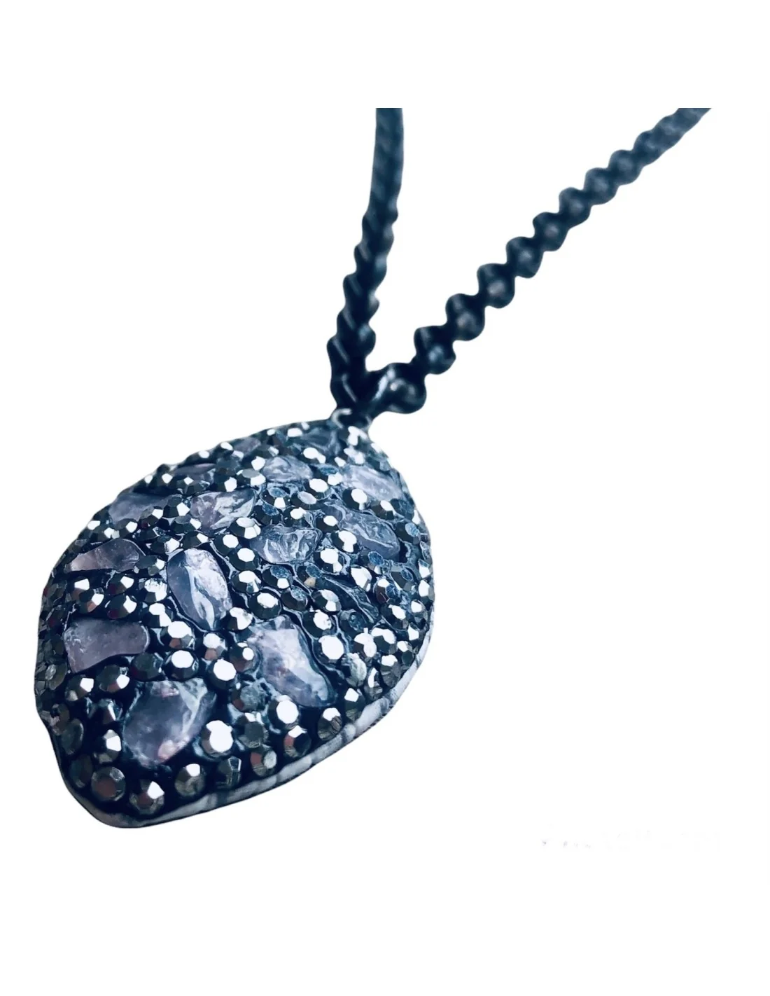 Χειροποίητο κόσμημα κολιέ με κρεμαστό στοιχείο με πέτρες Μαρκασίτη και Αμέθυστου με επένδυση πλάτης από φίδι σε μαύρη αλυσίδα "Gkiza"