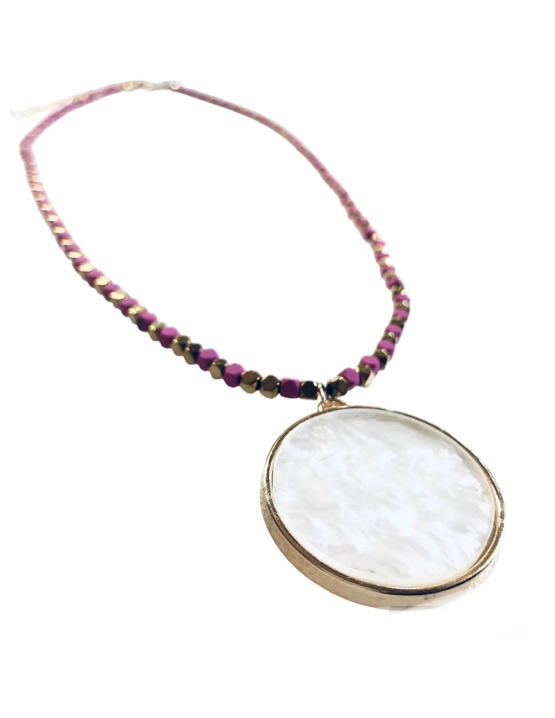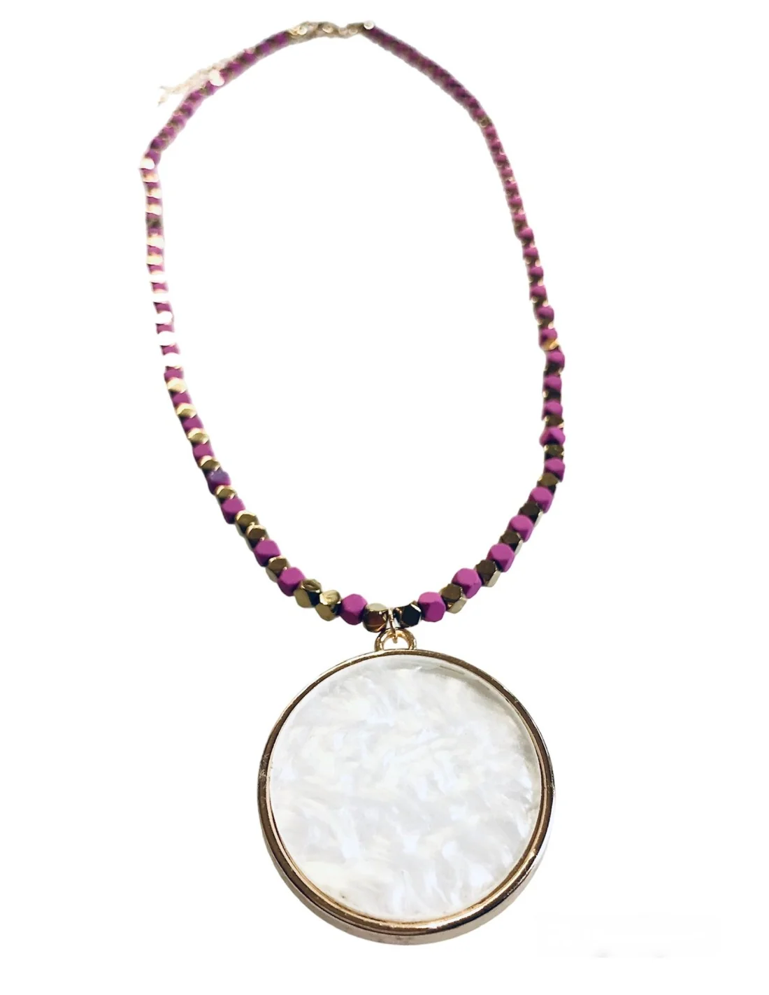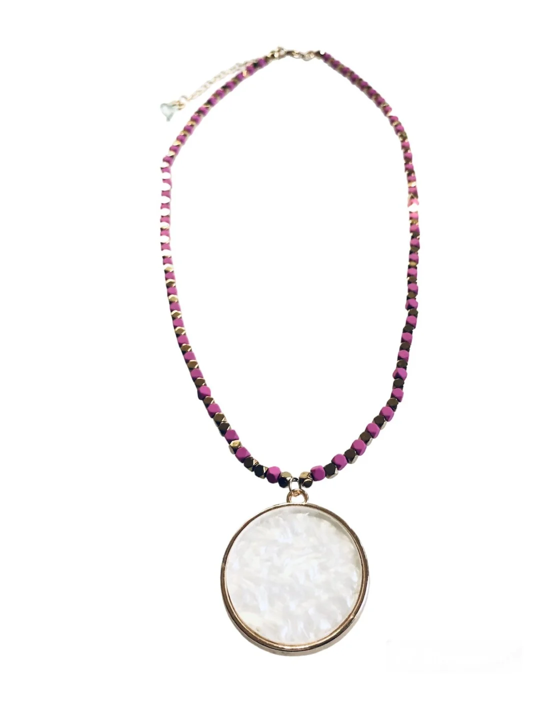 Χειροποίητο κοραλί κολιέ με πέτρες Αχάτη και Αιματίτη και κεντρικό στοιχείο κύκλος με φίλντισι "Fira"