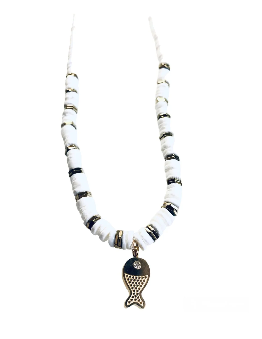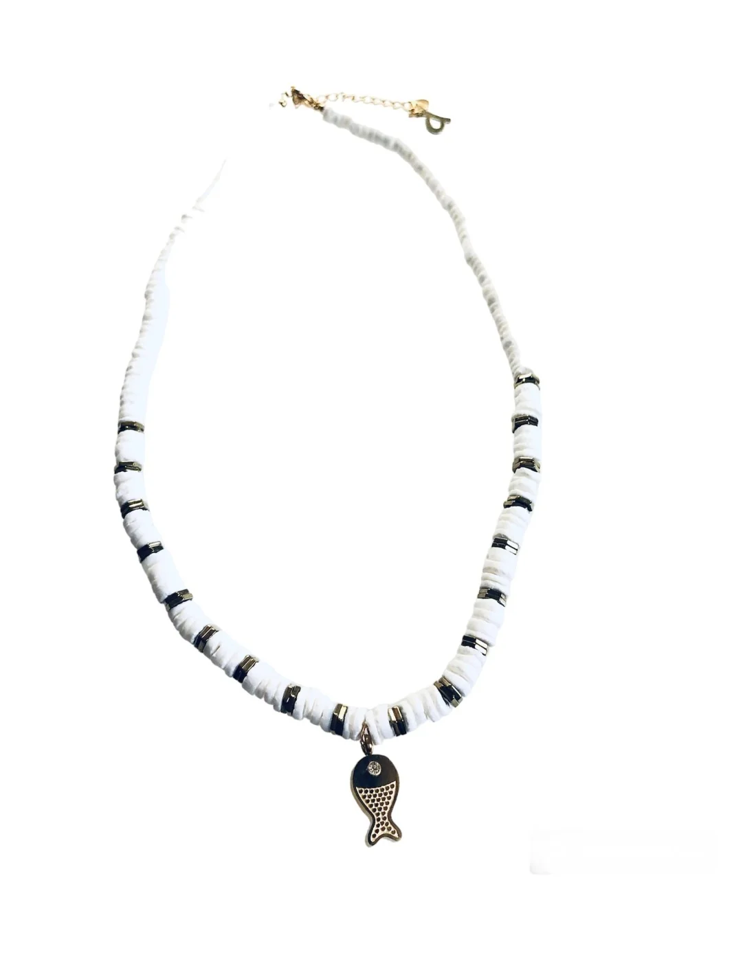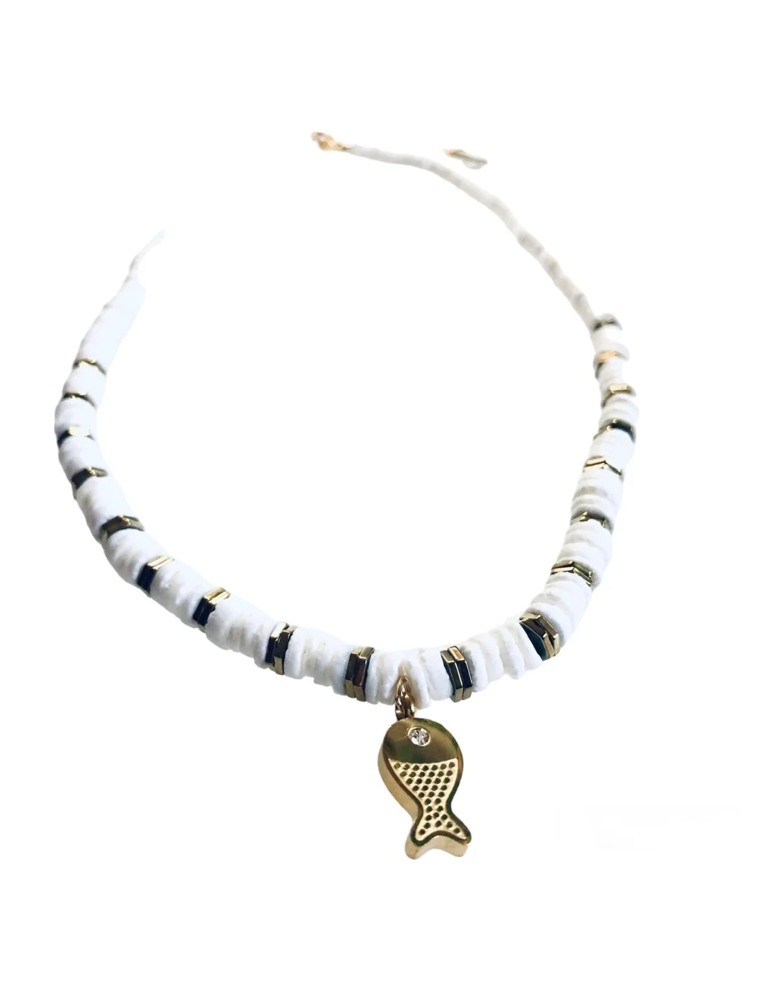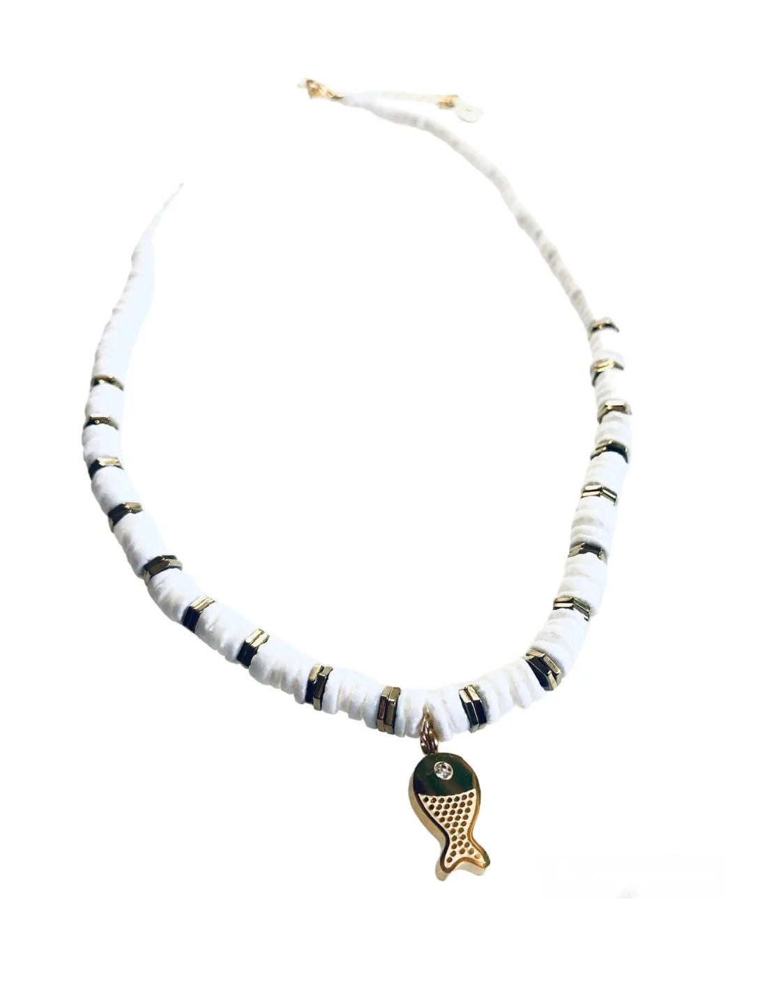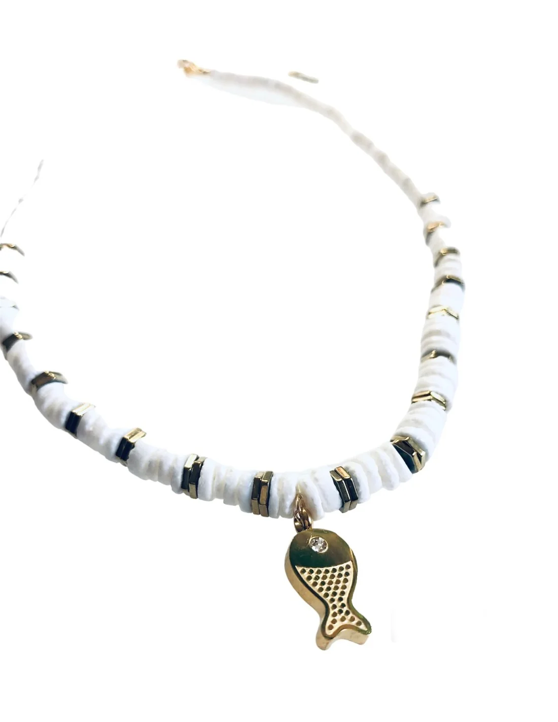 Χειροποίητο κολιέ με πέτρες σε λευκό και χρυσό με κρεμαστό στοιχείο ψαράκι "Fishy Fishy"