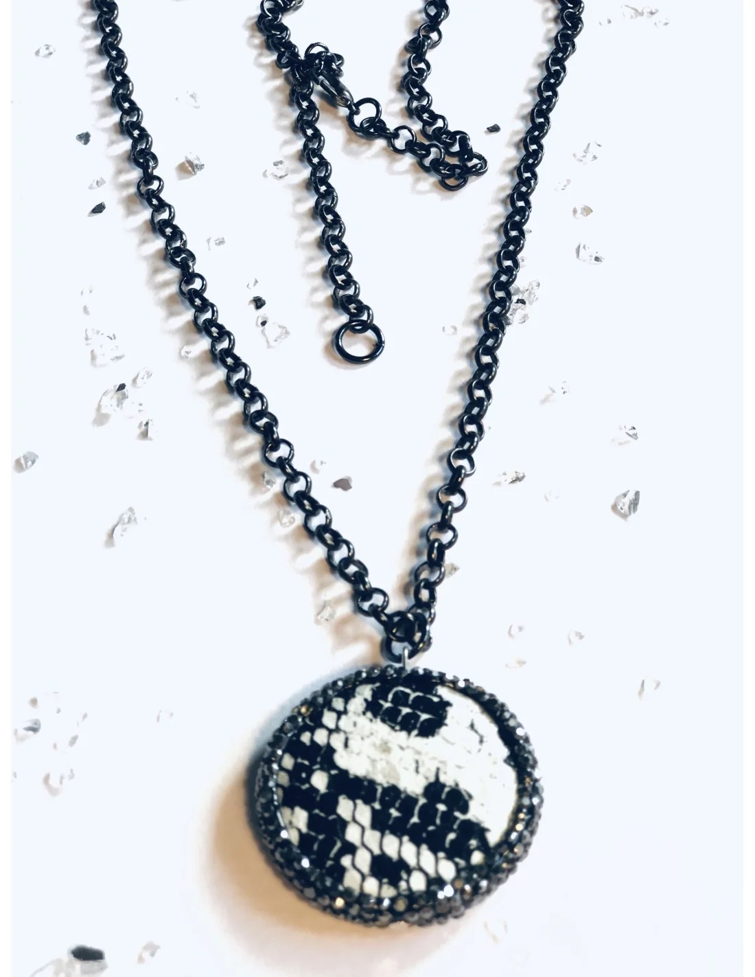Χειροποίητο γυναικείο κολιέ με κεντρικό στοιχείο από τεχνόδερμα σε animal print και πέτρες Μαρκασίτη σε μαύρη αλυσίδα "Budapest"
