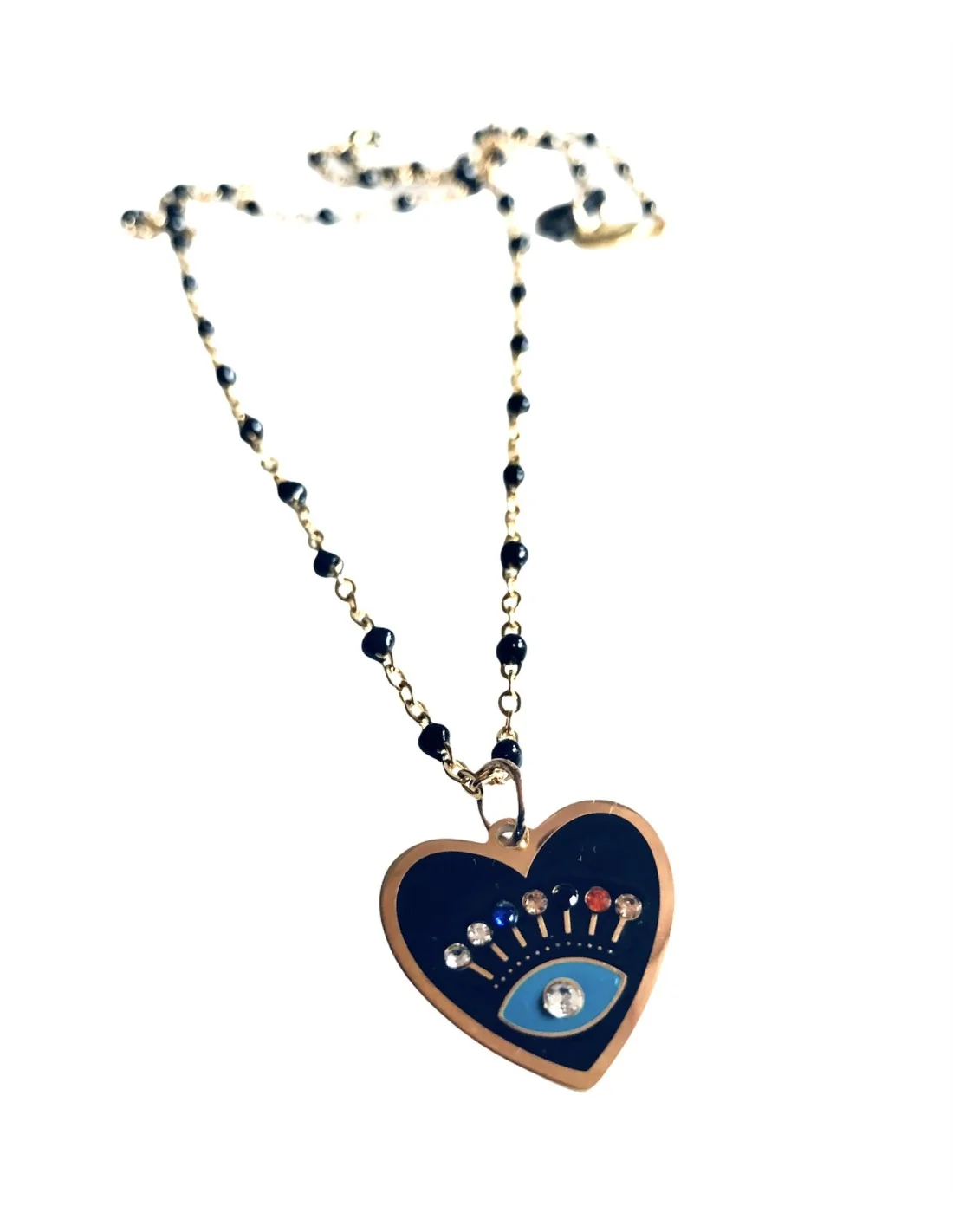 Το κολιέ "Love Me" συνδυάζει την κομψότητα του επιχρυσωμένου ατσαλιού με την μυστικιστική γοητεία του ματιού, δημιουργώντας ένα μοναδικό κόσμημα που ξεχωρίζει.