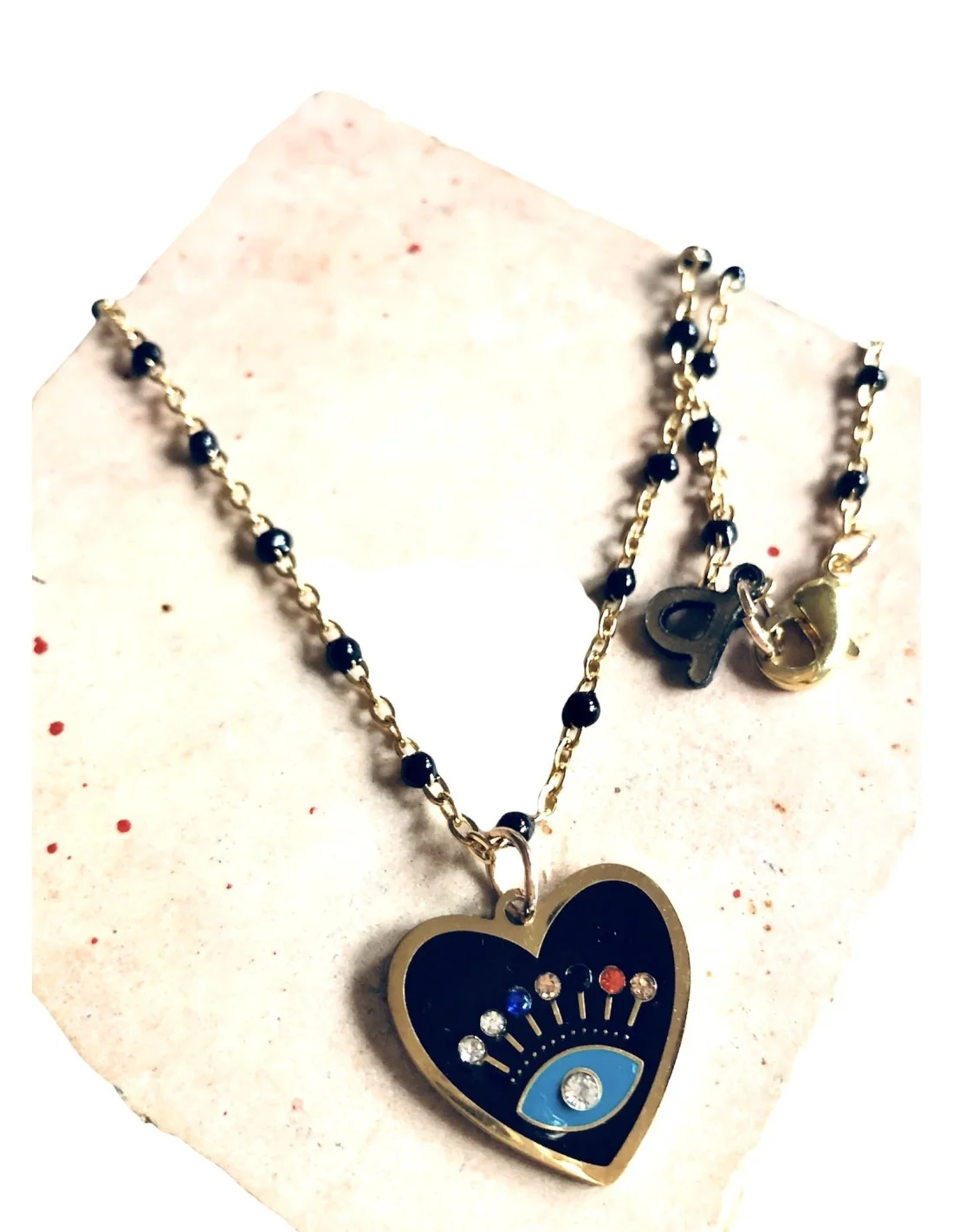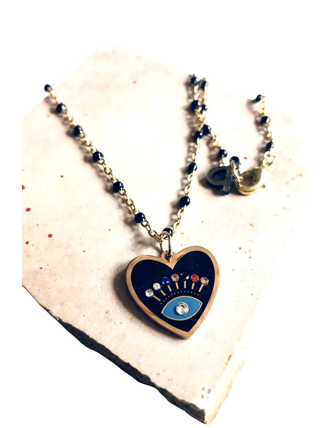 Χειροποίητο γυναικείο κολιέ με κρεμαστό στοιχείο μάτι από ατσάλι σε επίχρυσο ατσάλινο ροζάριο με μαύρα κρύσταλλα Love Me
