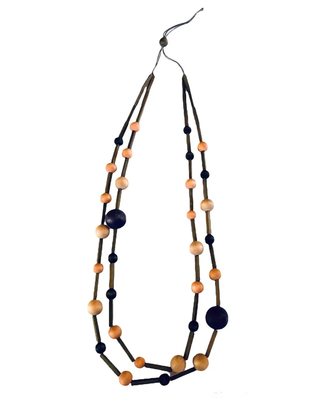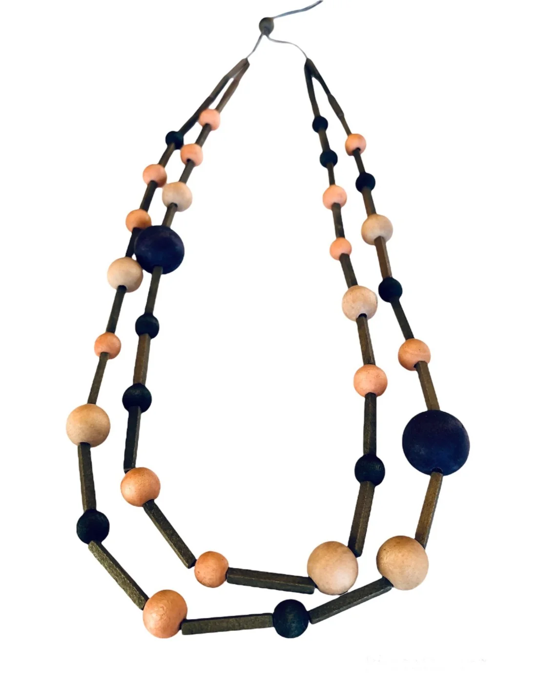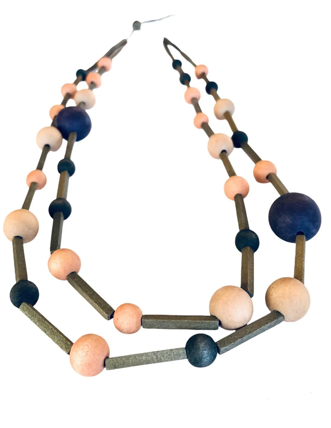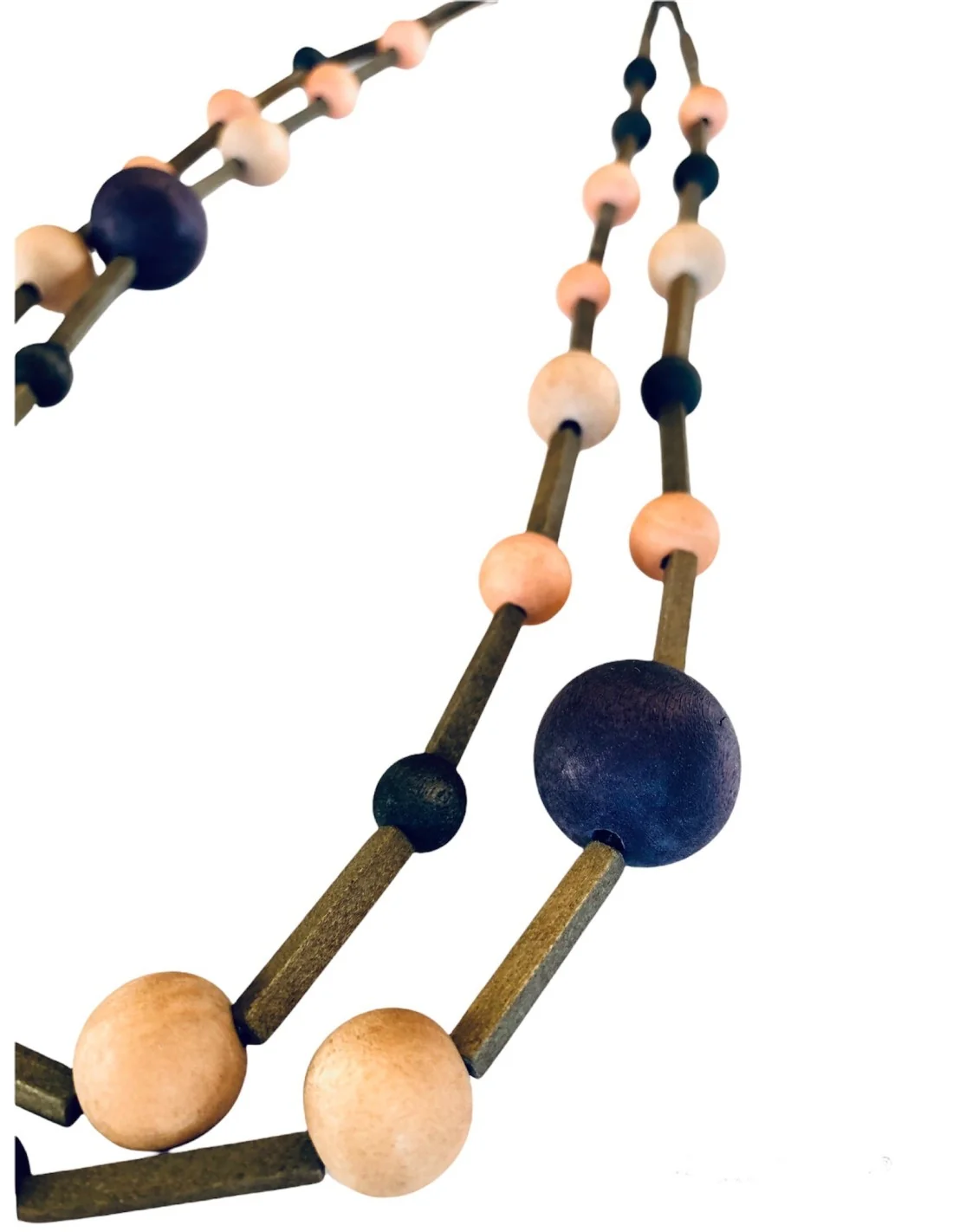 Χειροποίητο γυναικείο ξύλινο κολιέ σε μπεζ, λαδί και μπλε σκούρο Space