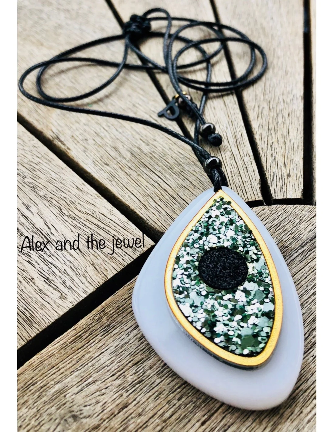 Χειροποίητο κολιέ μάτι σε λευκό, σμαραγδί και χρυσό σε κορδόνι με αυξομείωση Alkyoni