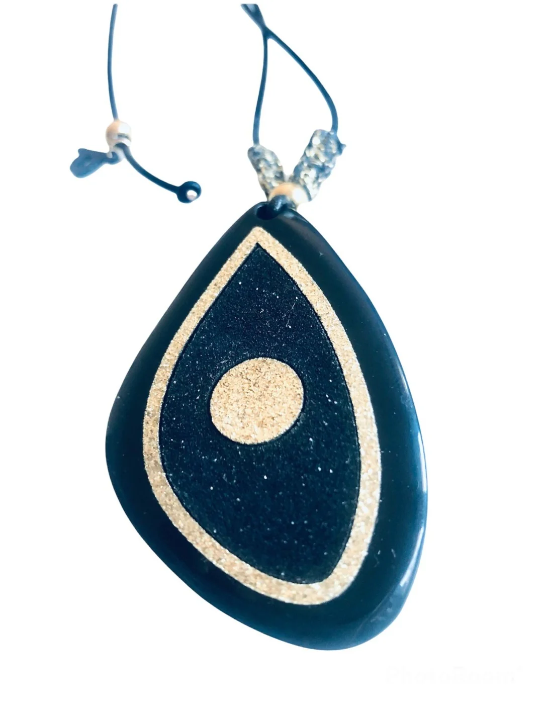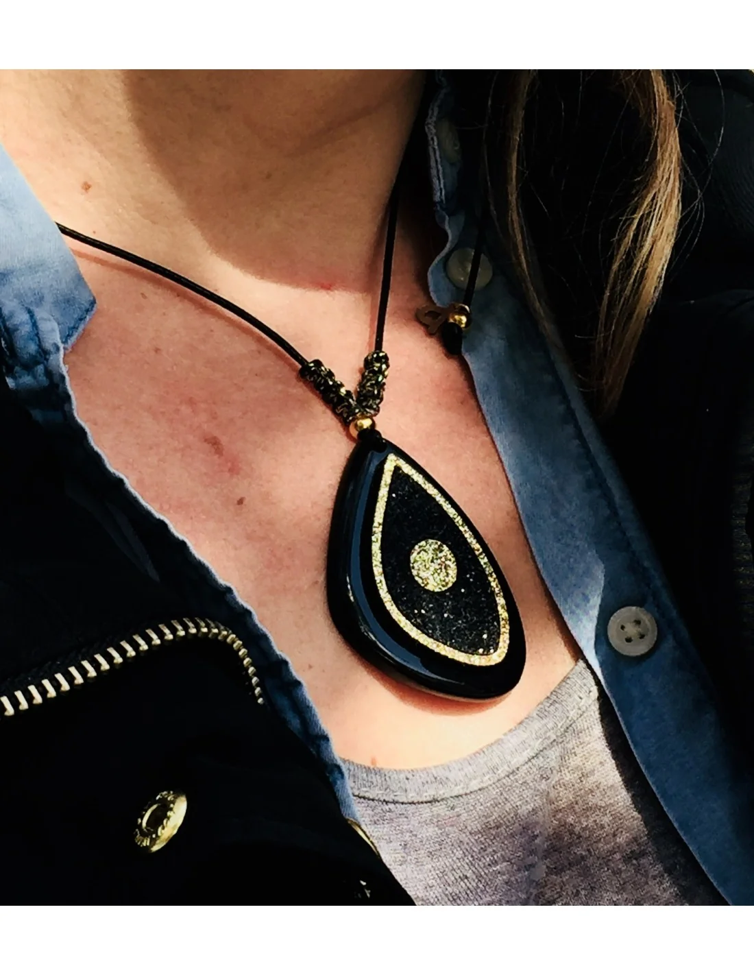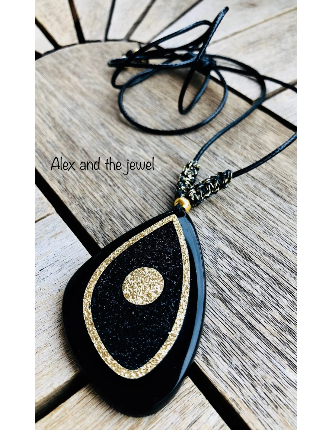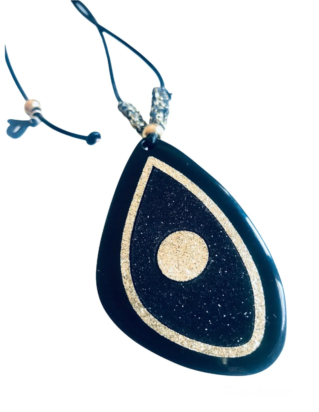 Χειροποίητο κόσμημα κολιέ με στοιχείο μάτι σε τριγωνικό ακανόνιστο σχήμα σε μαύρο και χρυσό γκλίτερ σε κορδόνι Noir