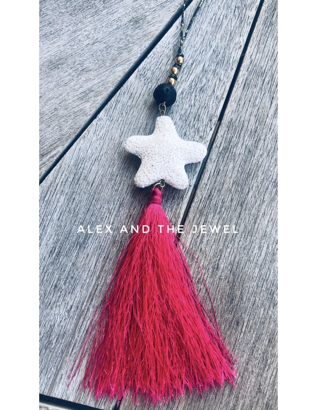 Χειροποίητο μακρύ κόσμημα κολιέ με λευκή Λάβα σε σχέδιο αστερία, μαύρη πέτρα Λάβας και πέτρες Αιματίτη στο κορδόνι Starfish