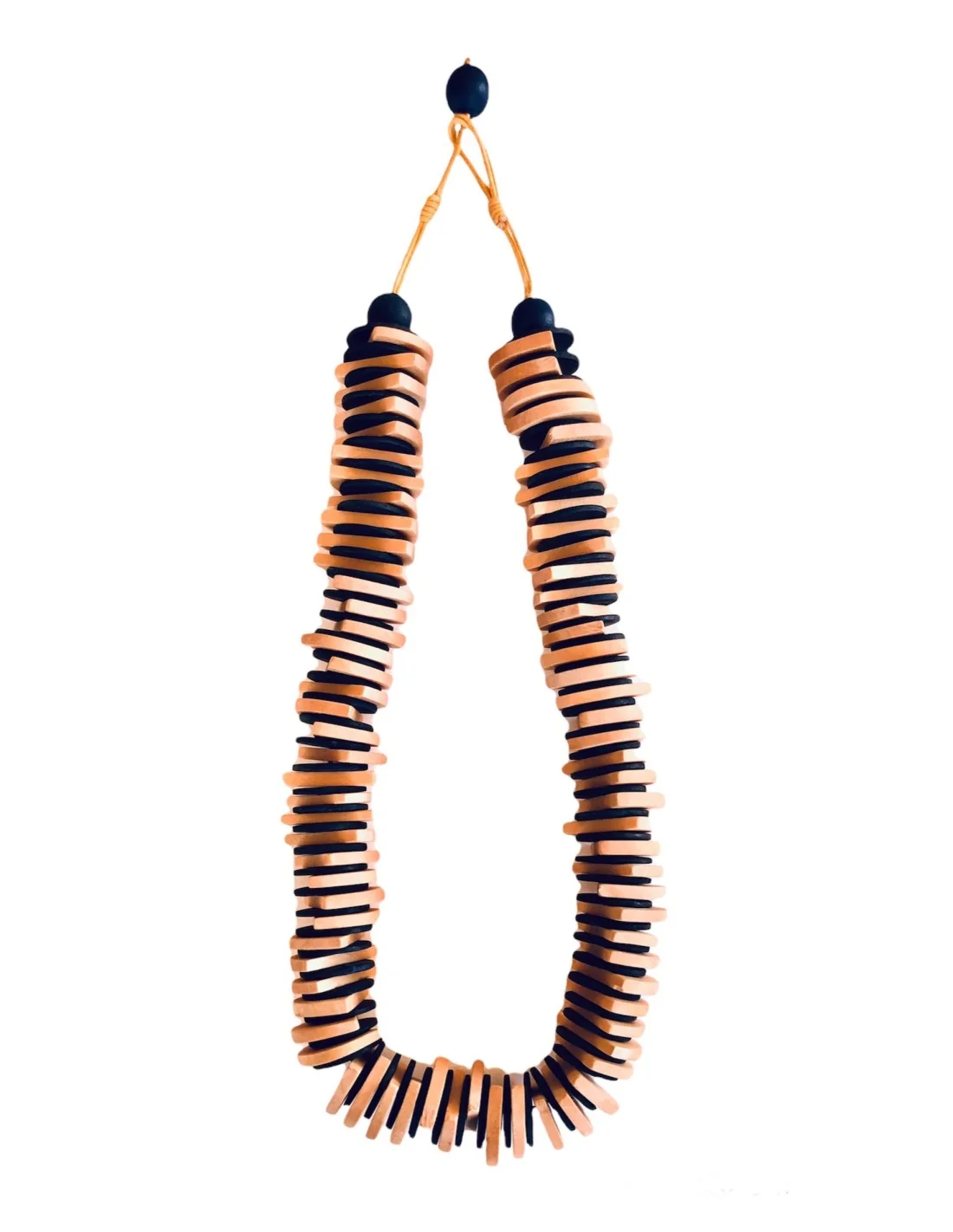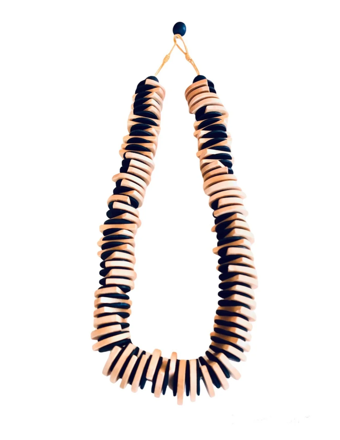 Το κολιέ "Aenaon" είναι ένα μοναδικό χειροποίητο κόσμημα, κατασκευασμένο από τρισδιάστατα ξύλινα στοιχεία σε τέσσερις κομψές αποχρώσεις.