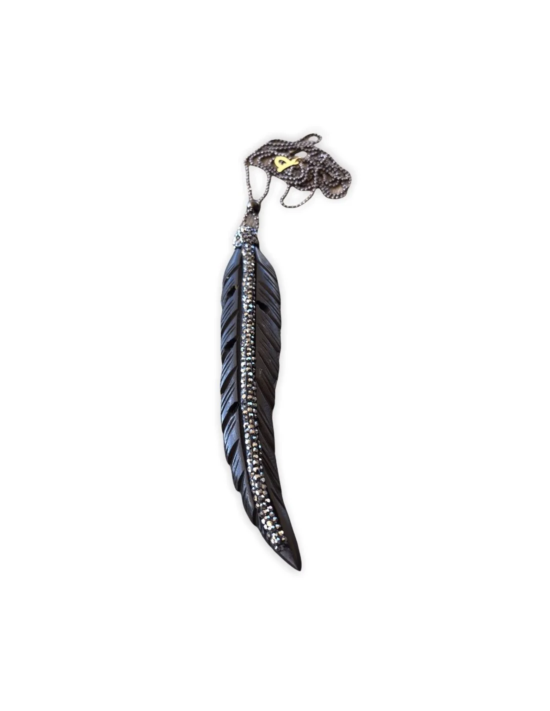 Αναδείξτε τη μοναδικότητά σας με το εντυπωσιακό χειροποίητο κολιέ "Feather". Το κρεμαστό στοιχείο σε σχέδιο μαύρου φτερού από κόκκαλο είναι συμβολικό της ελευθερίας και της δύναμης.