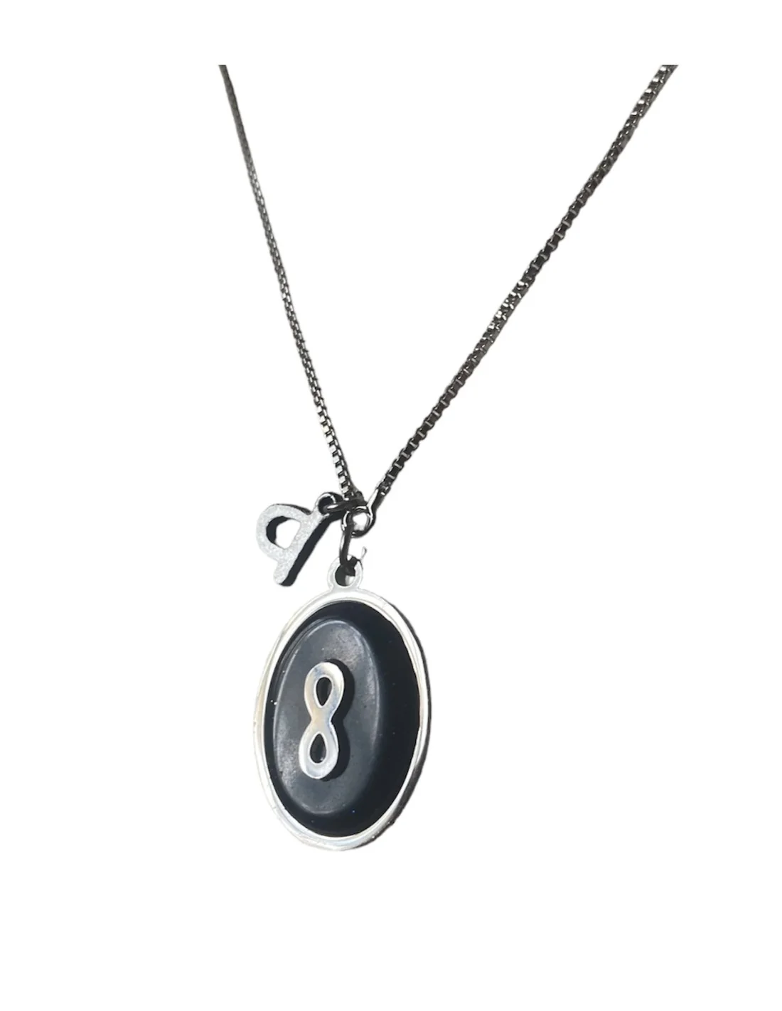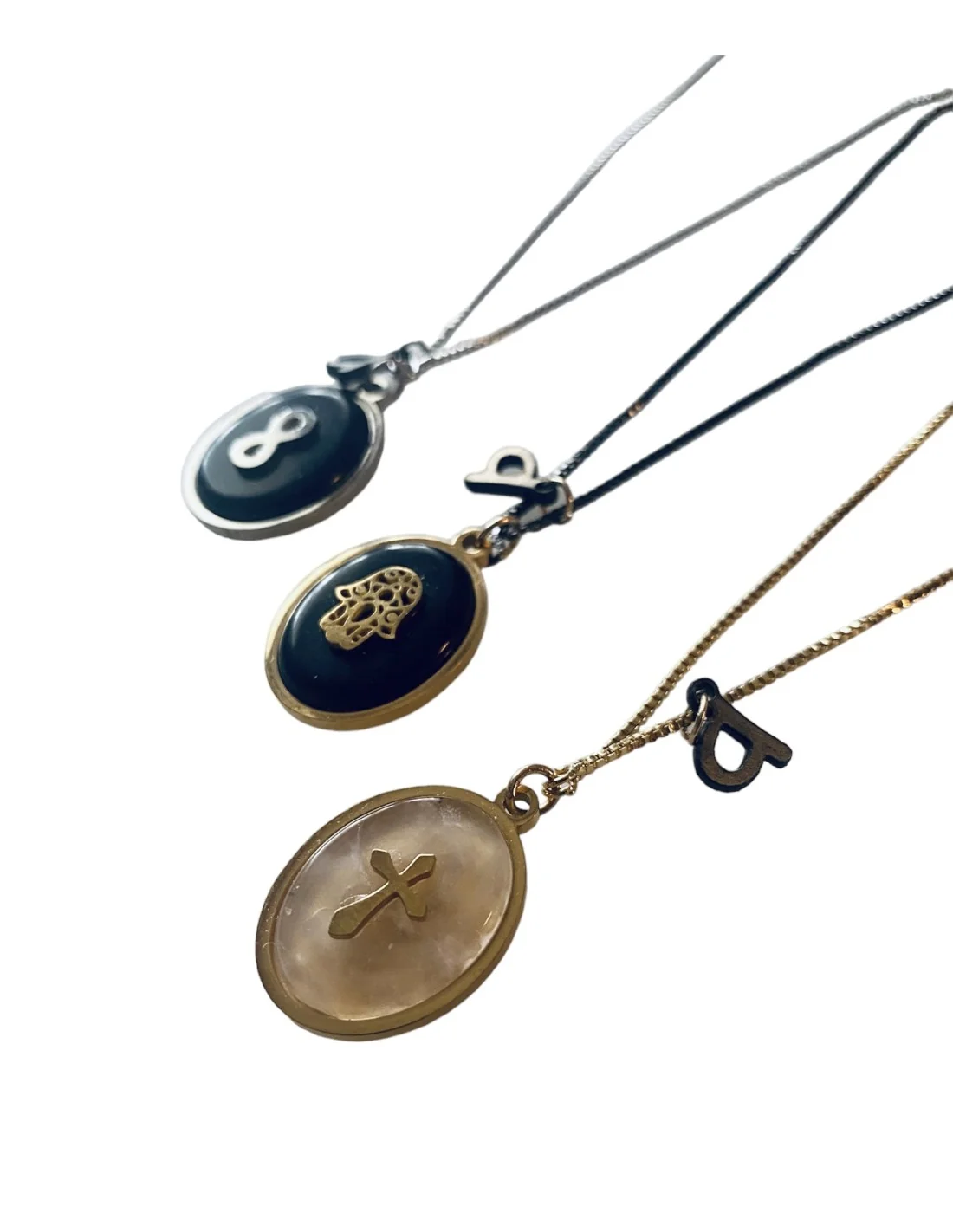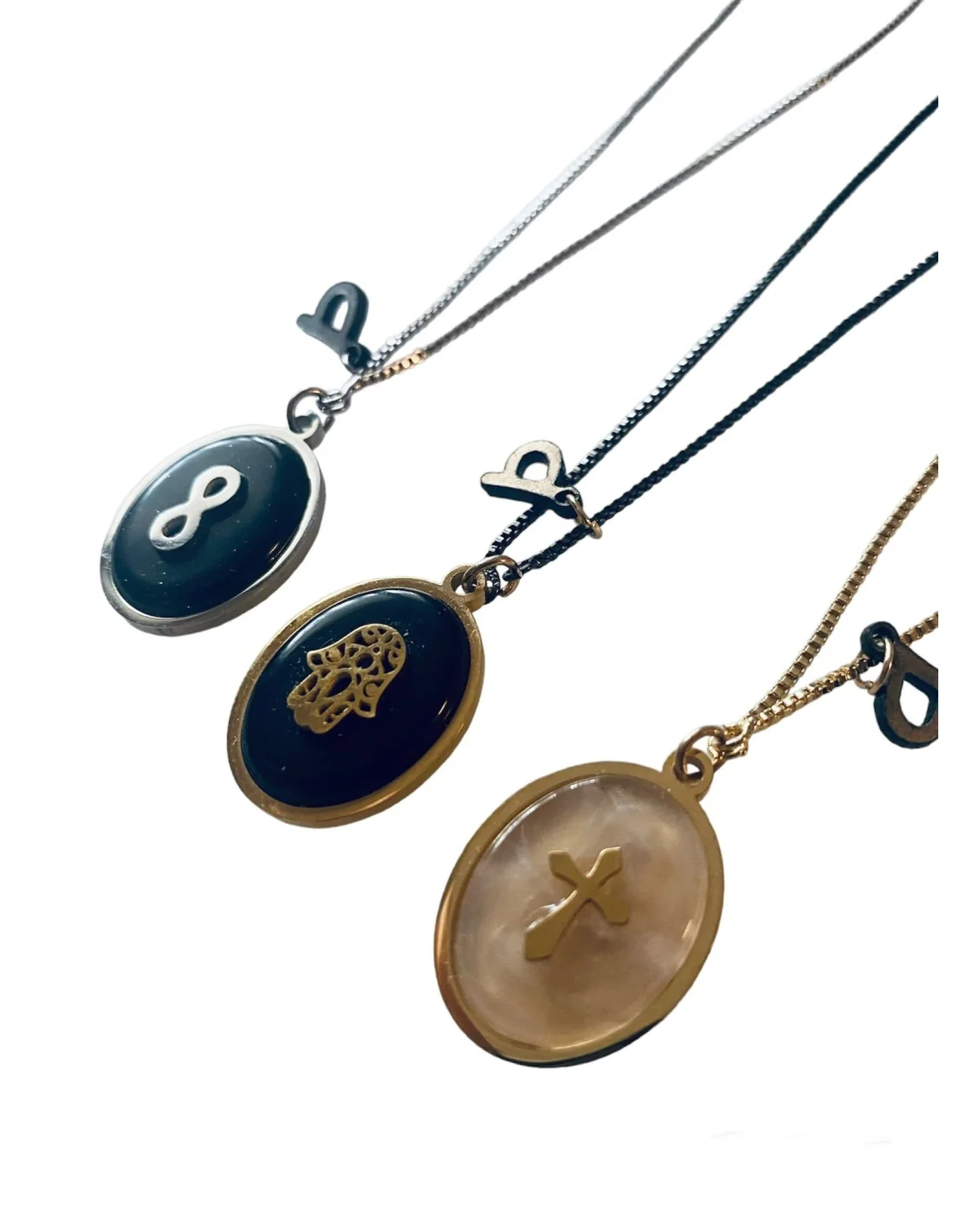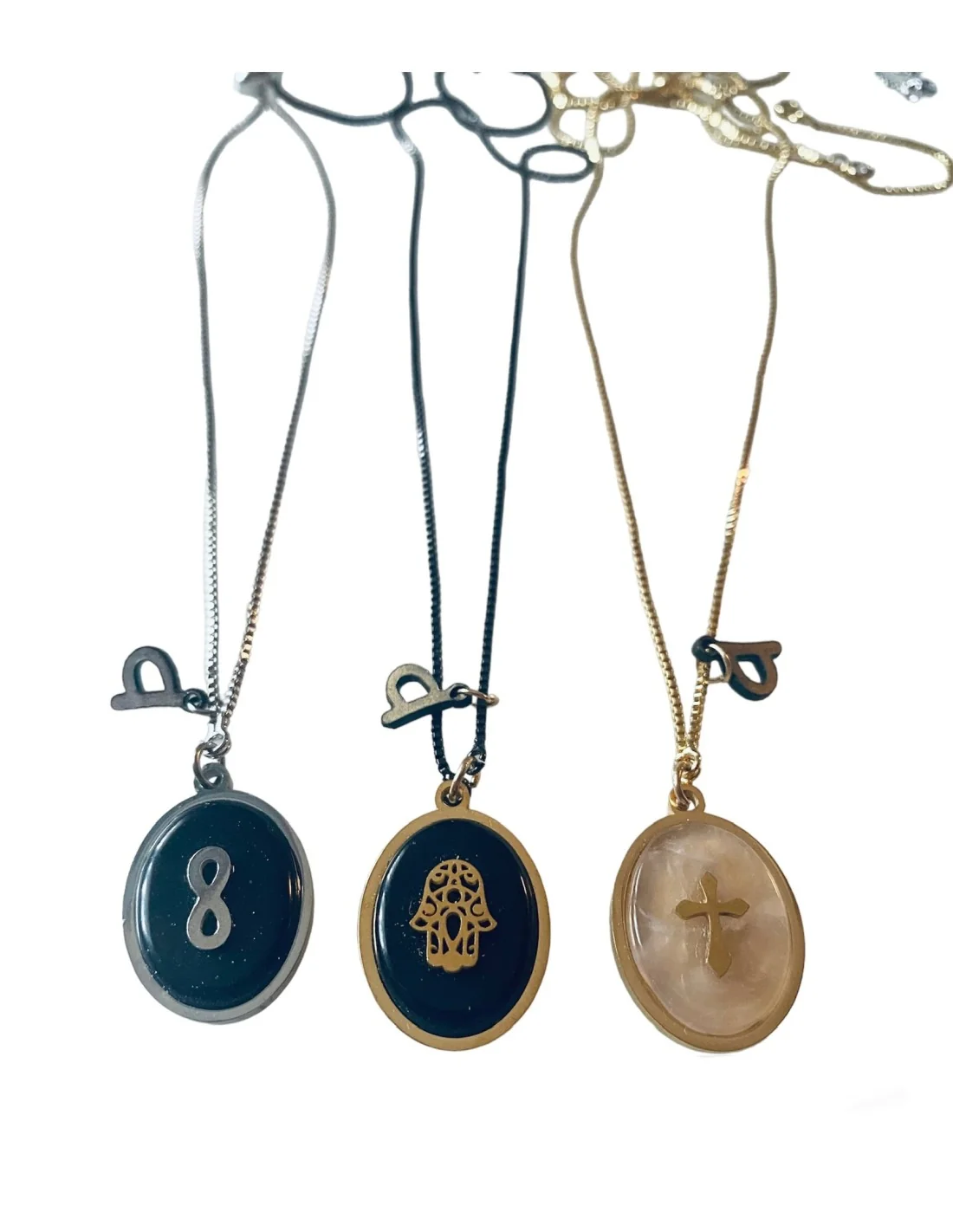 Αναδείξτε την προσωπικότητά σας με το μοναδικό χειροποίητο κολιέ, το οποίο διαθέτει τρία κρεμαστά στοιχεία: το τυχερό χέρι Χάμσα, το σύμβολο του Άπειρου και τον Σταυρό.