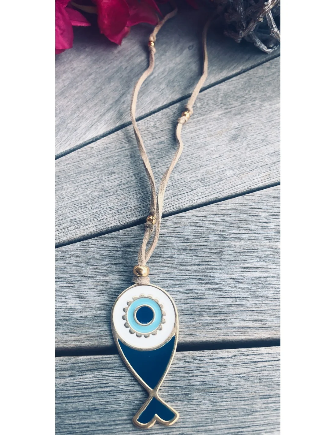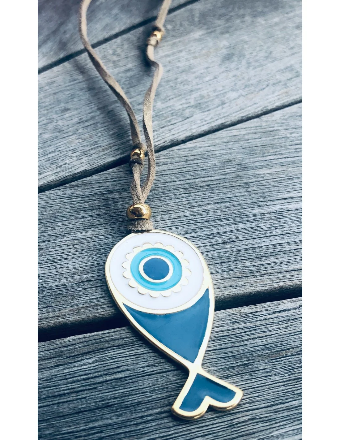 Χειροποίητο γυναικείο κόσμημα κολιέ ψαράκι σε μπλε και λευκό σε σουέτ πλακέ κορδόνι Kythira