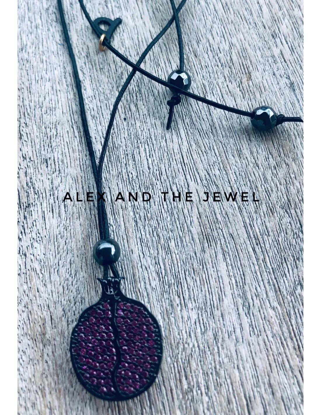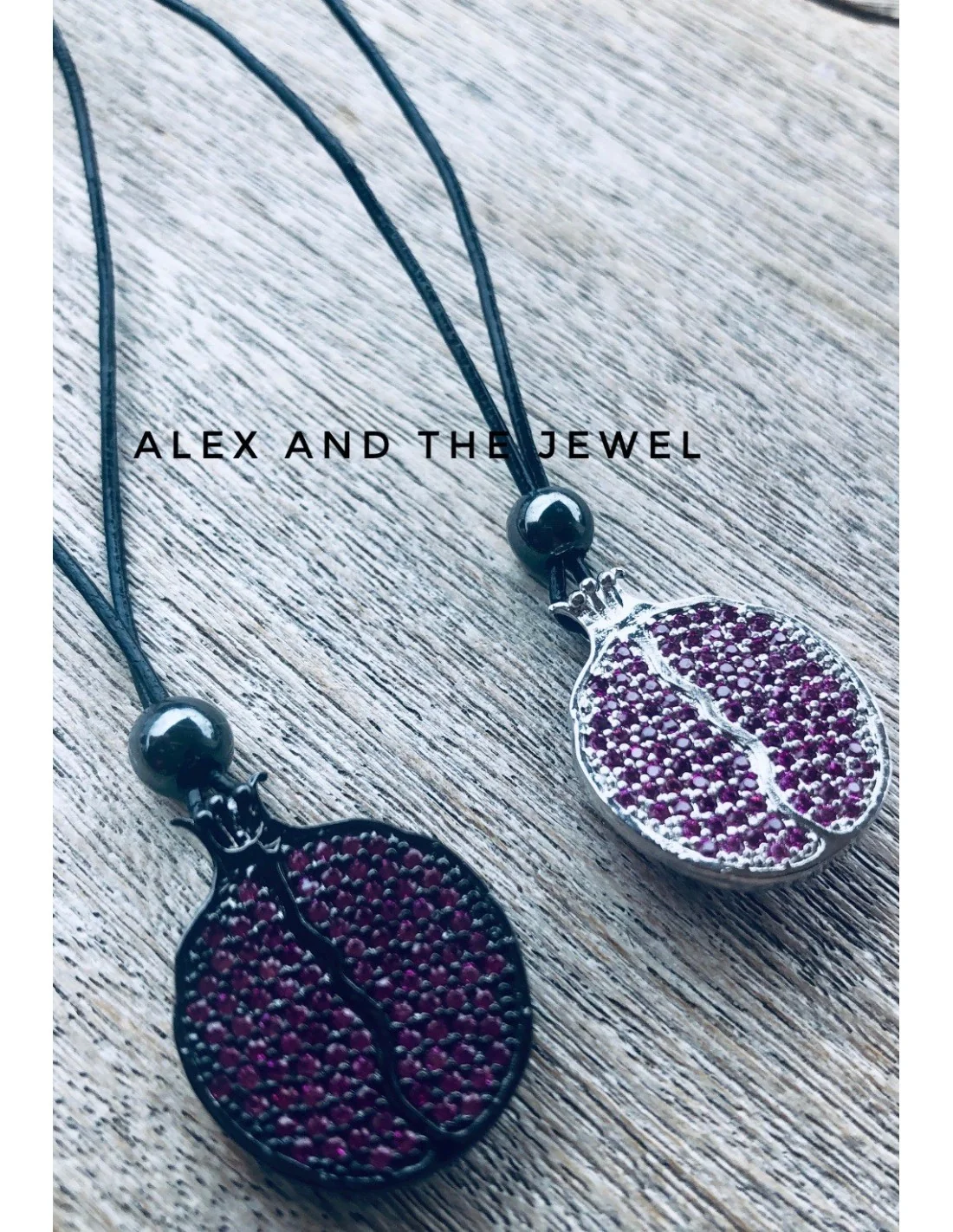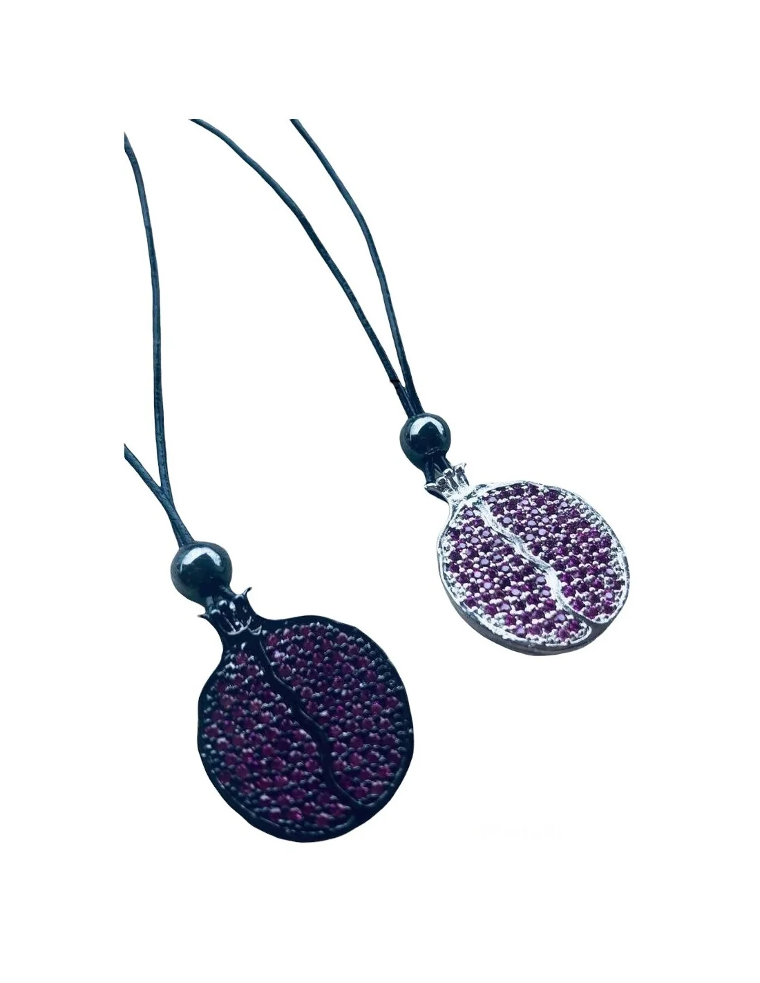 Χειροποίητο κόσμημα κολιέ με κρεμαστό ρόδι σε ασημί ή μαύρο, με καρφωτά ζιργκόν σε μωβ χρώμα, δέμενο σε μαύρο δέρμα Pomegranate