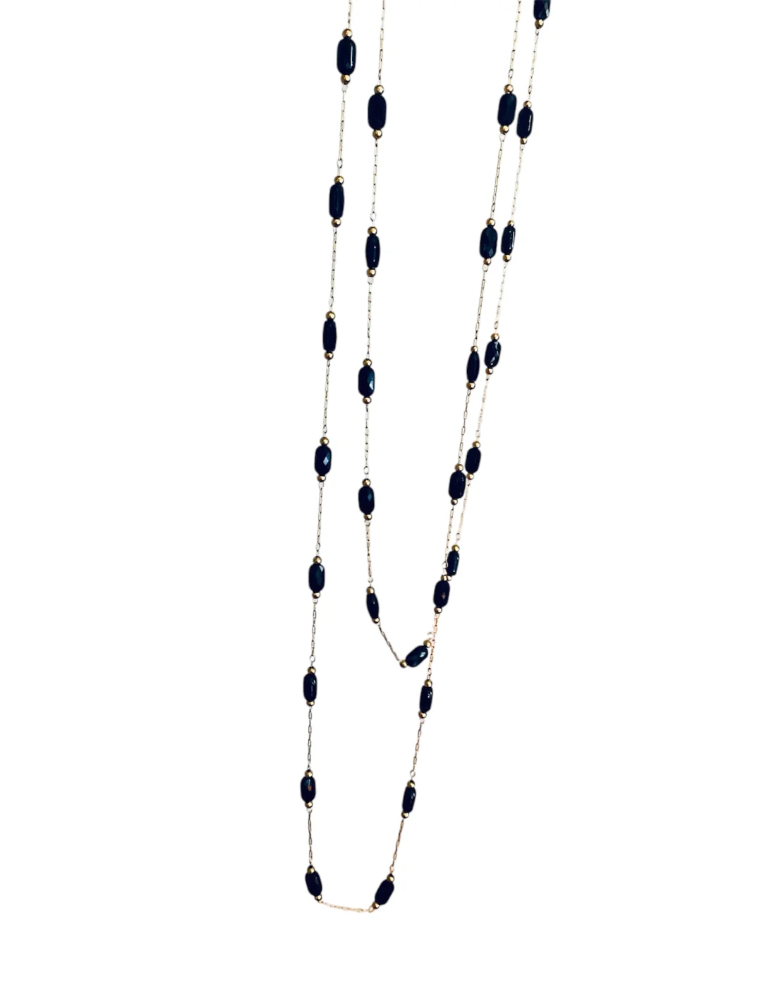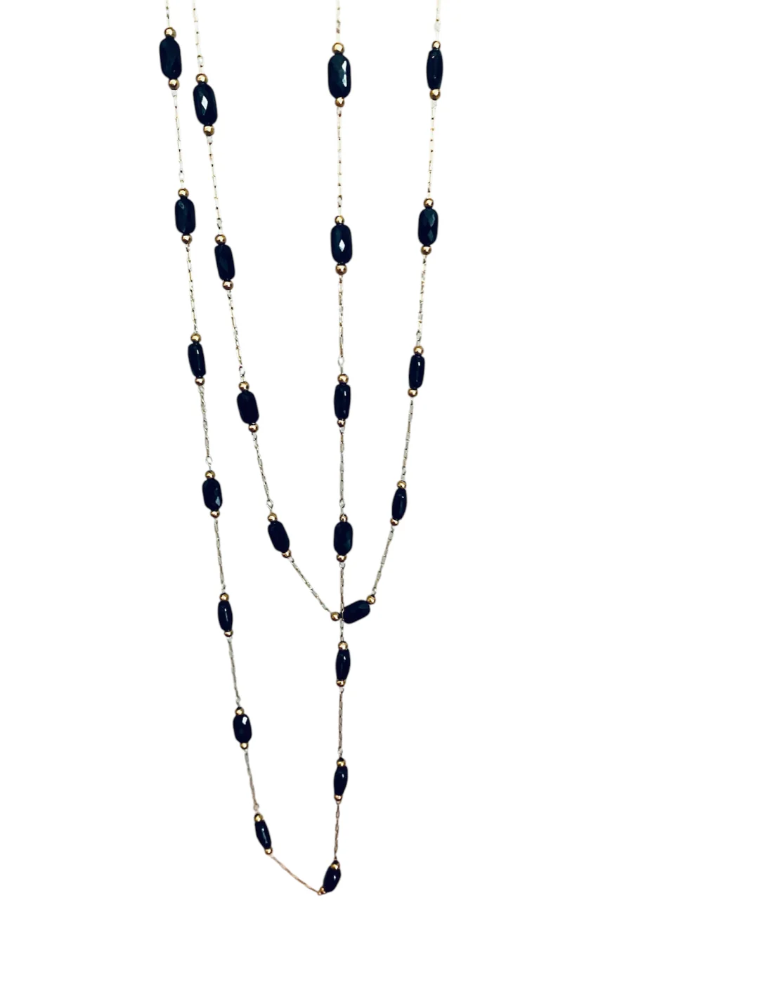 Προσθέστε μία δόση κομψότητας και λάμψης στις εμφανίσεις σας με αυτό το χειροποίητο κολιέ ροζάριο, διακοσμημένο με εντυπωσιακά μαύρα οβάλ κρύσταλλα Τσεχίας και επίχρυση αλυσίδα από ατσάλι. Το μοναδικό του σχέδιο και οι εκλεπτυσμένες λεπτομέρειες το καθιστούν ιδανικό για να αναβαθμίσετε κάθε outfit, από casual μέχρι και πιο επίσημο.