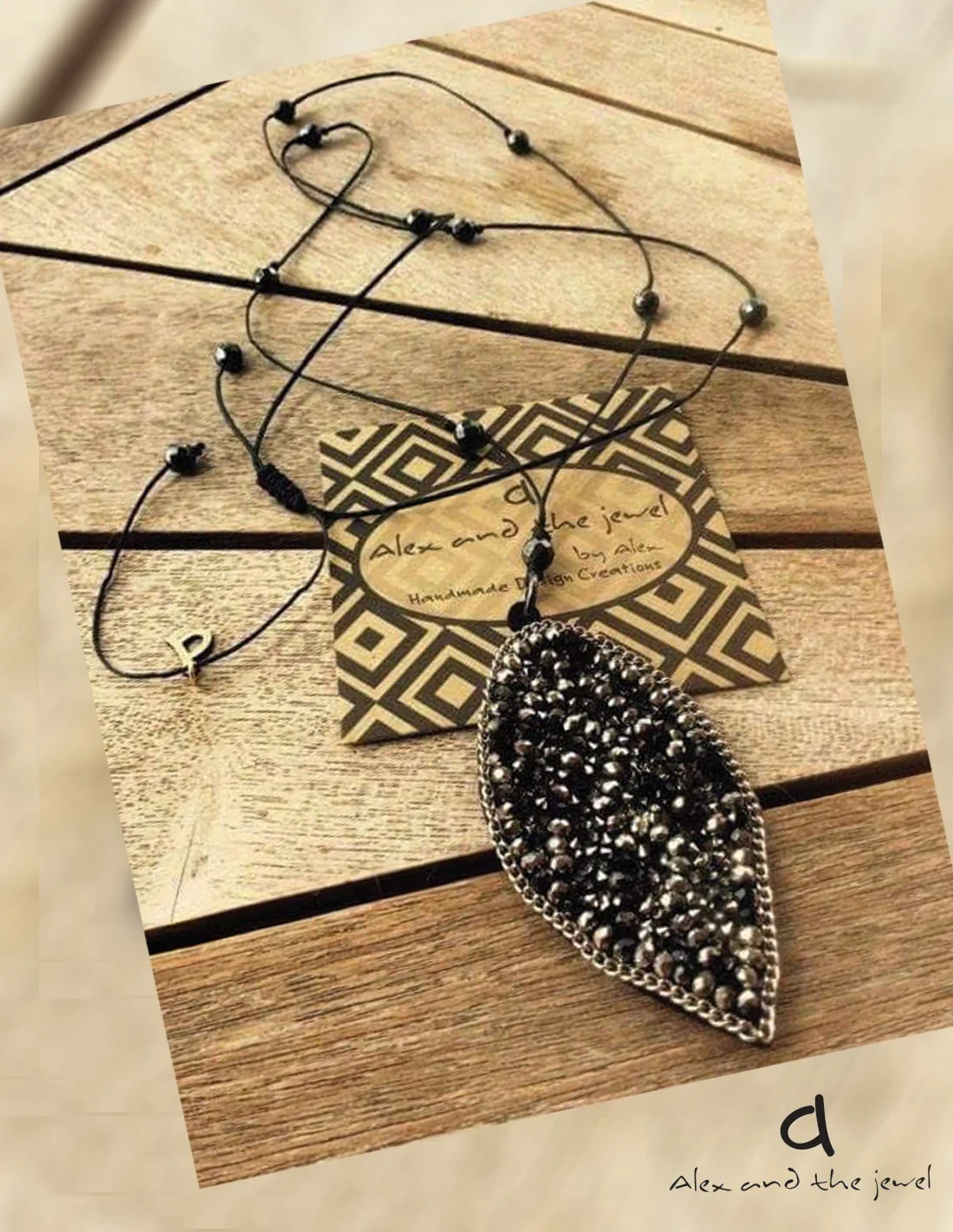 Χειροποίητο κολιέ με φύλλο, στρας και πέτρες Αιματίτη | Alex and the jewel