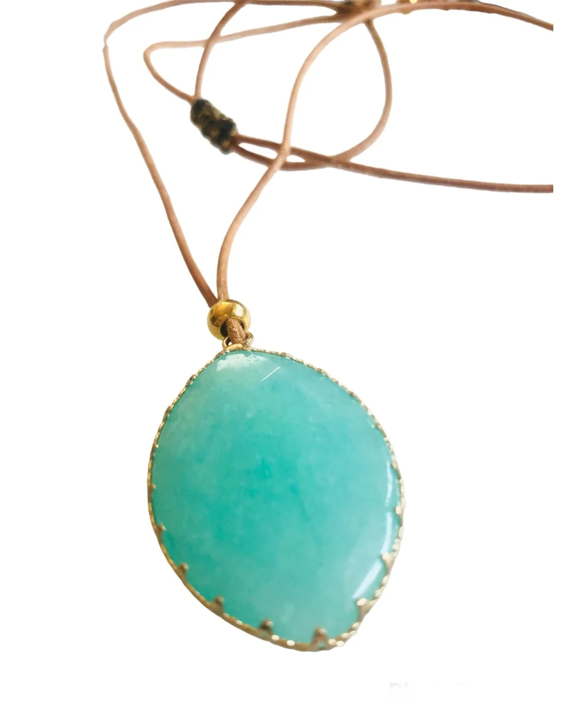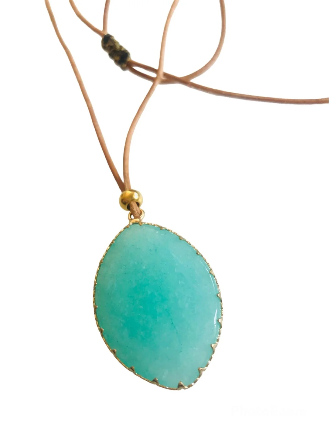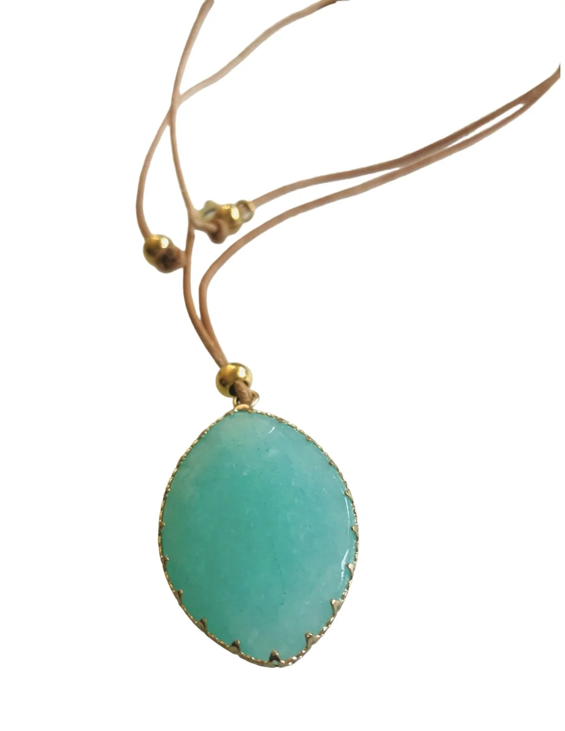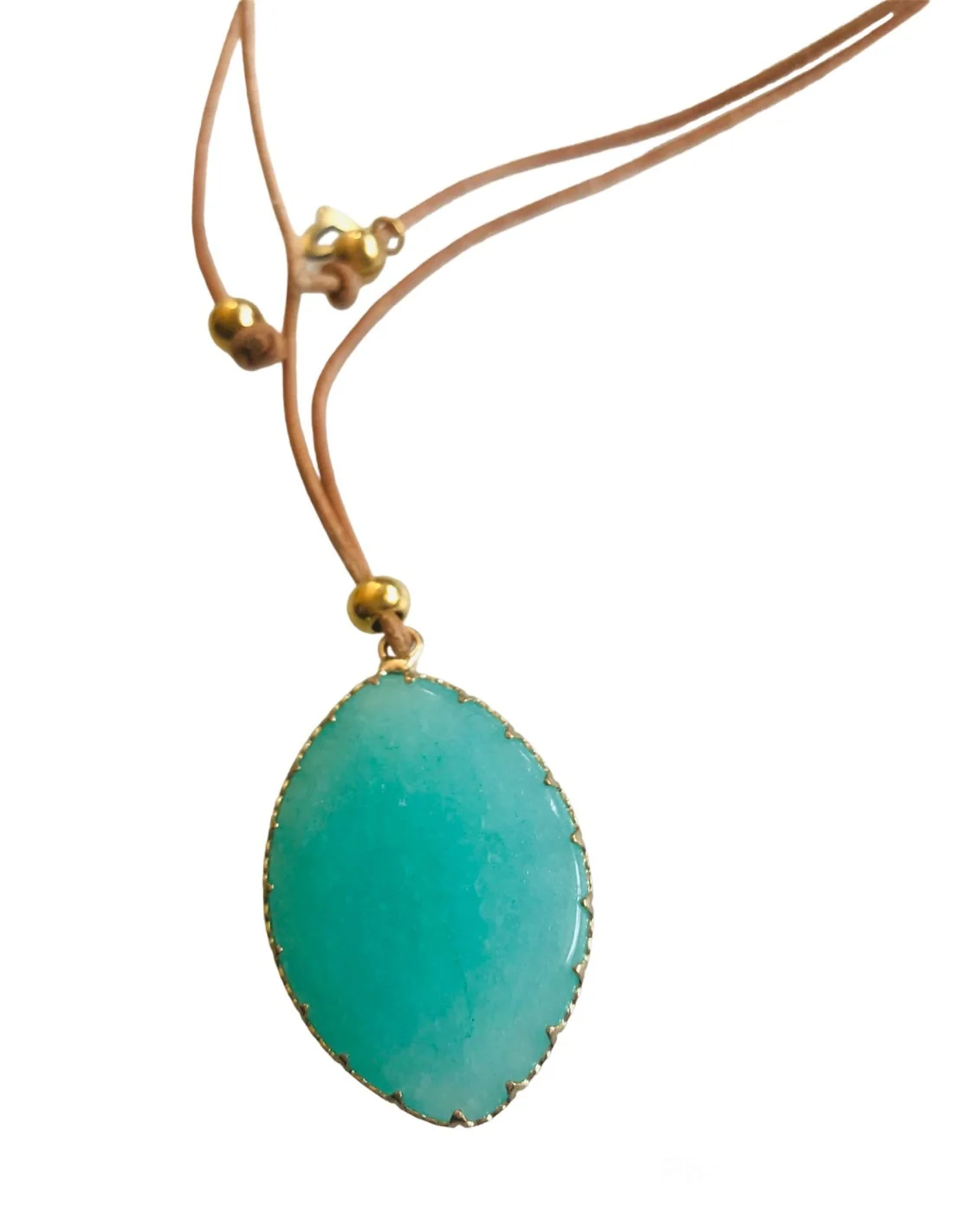 Χειροποίητο γυναικείο κόσμημα κολιέ με βεραμάν πέτρα Νεφρίτη σε δερμάτινο κορδόνι Sxoinousa