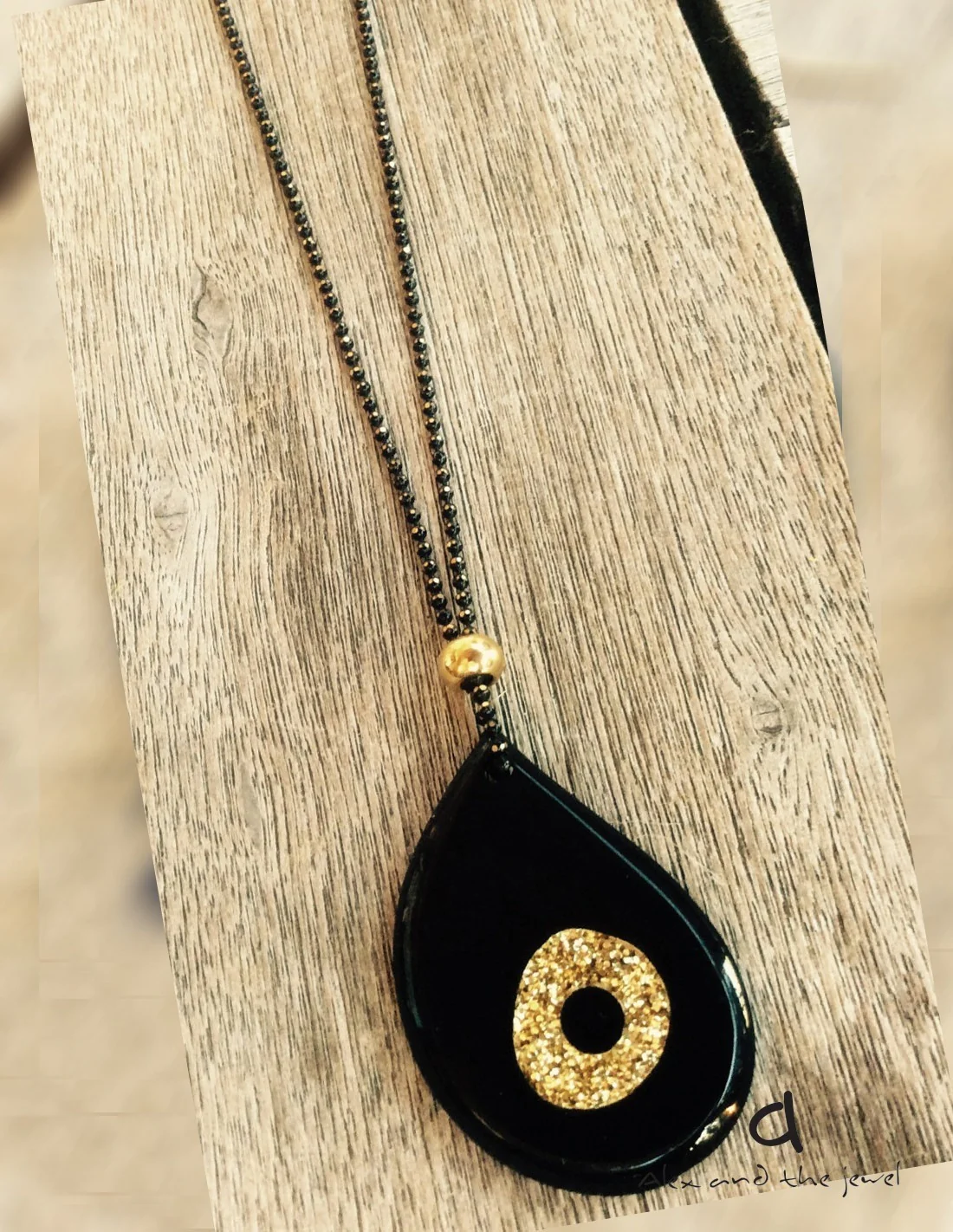 Κρεμαστό κολιέ με κρεμαστό μοτίφ μάτι σε σχήμα σταγόνας, σε μαύρη militaire αλυσίδα και επίχρυση διακοσμητική μπίλια The Eye
