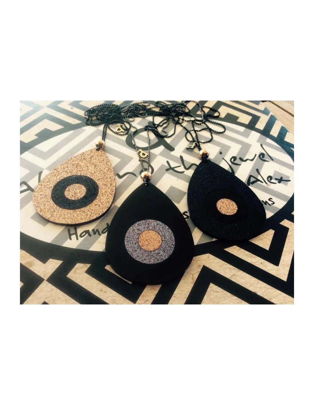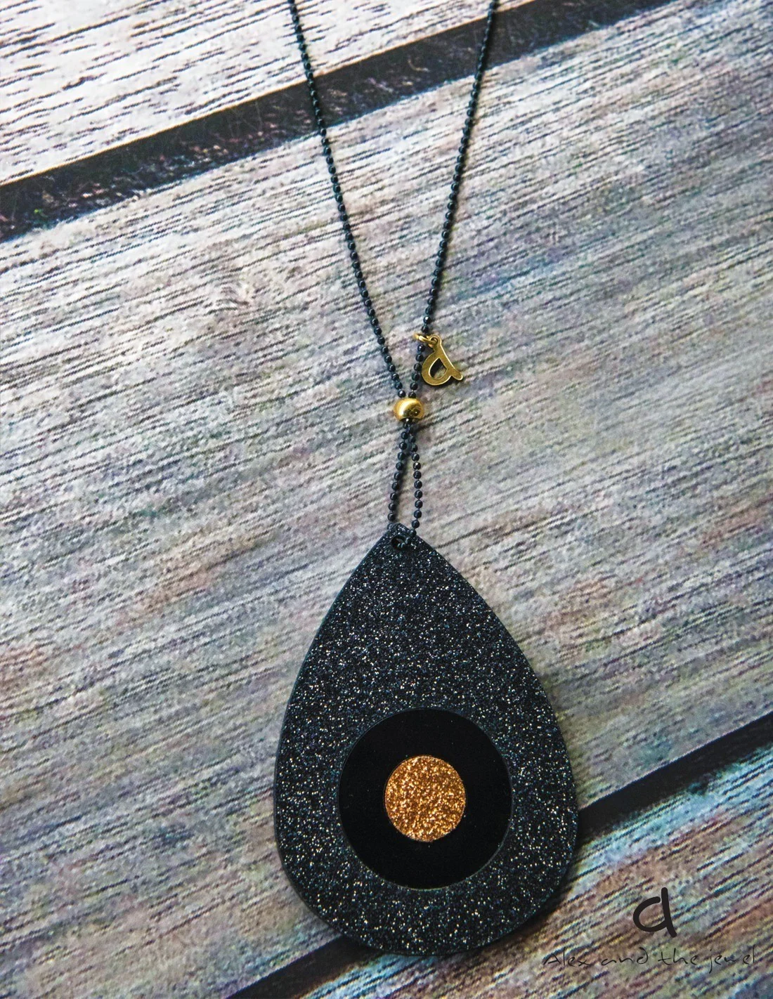 Χειροποίητο κόσμημα κολιέ με κρεμαστό στοιχείο μάτι σε αλυσίδα διαμαντοκοπής από plexiglass σε μαύρο και χρυσό Bedazzle