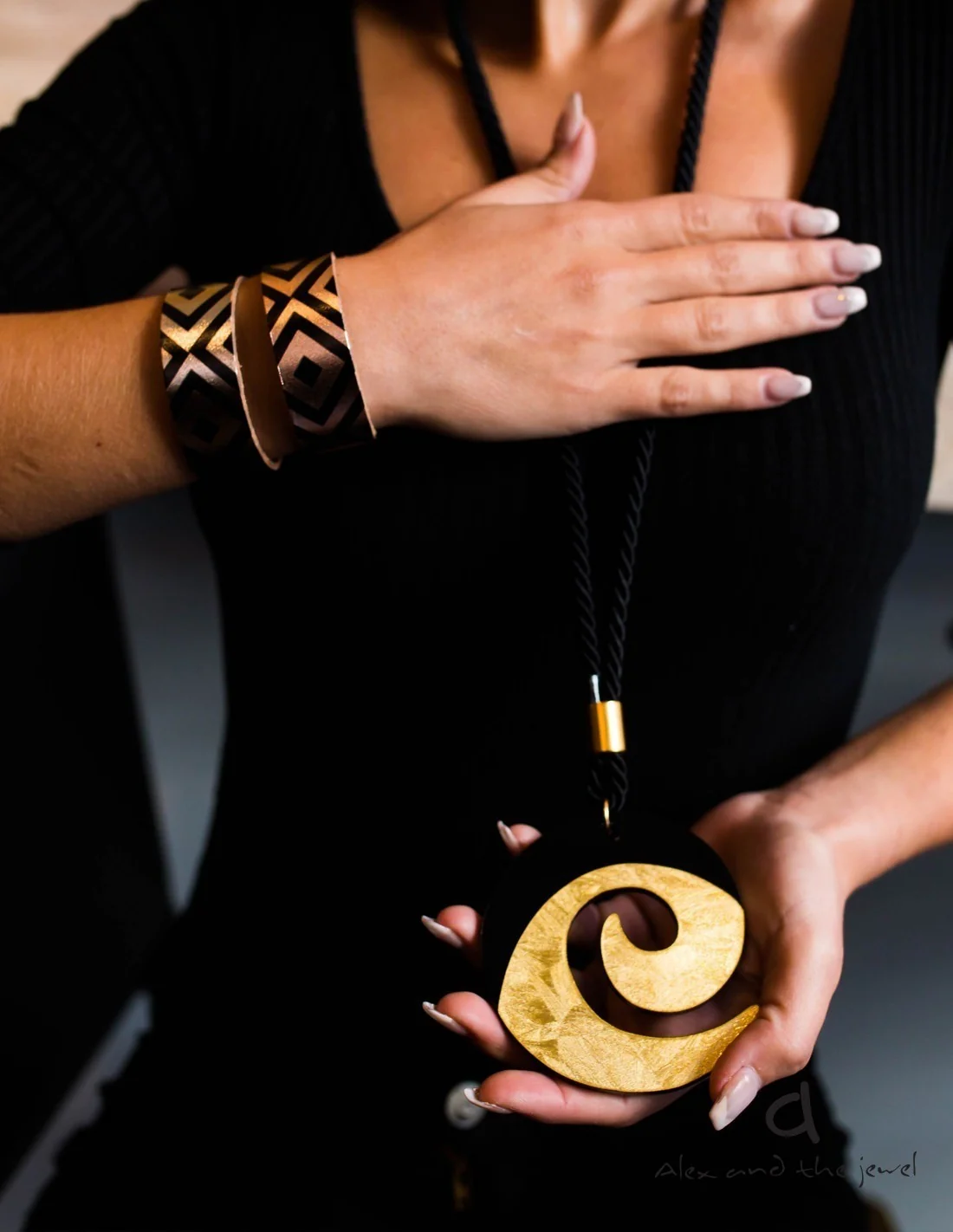 Το χειροποίητο statement κολιέ "Euphoria Pendant" είναι μια μοναδική δημιουργία που ξεχωρίζει για τον εντυπωσιακό συνδυασμό του ξύλου σε μαύρο και χρυσό χρώμα.