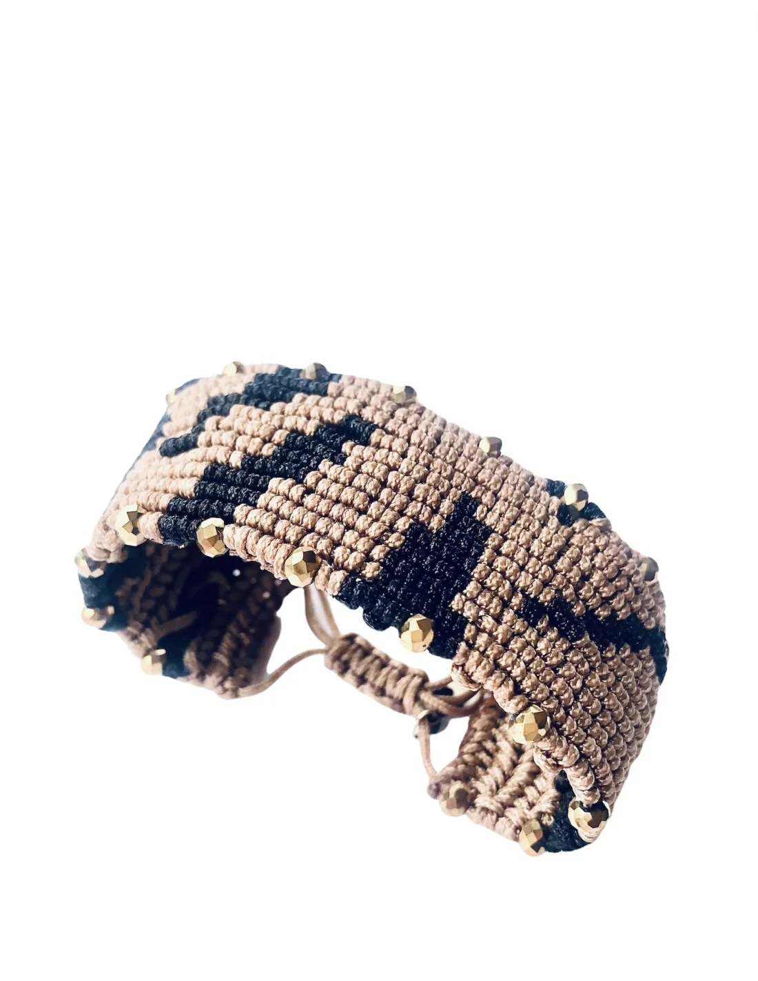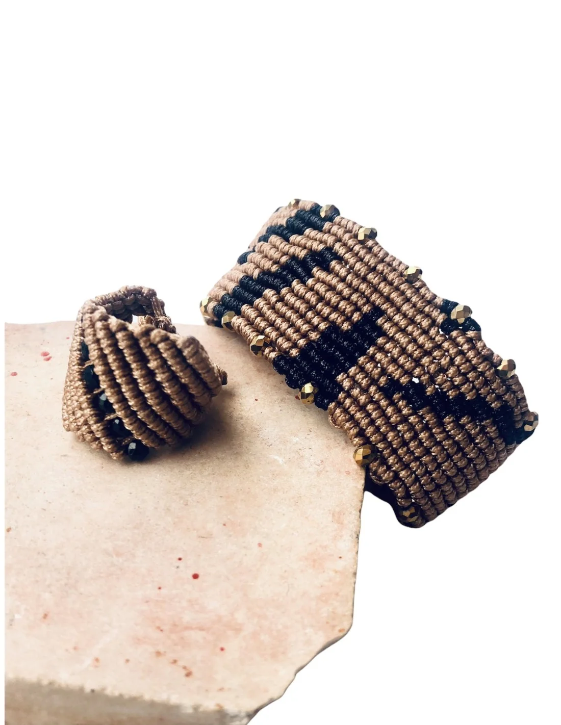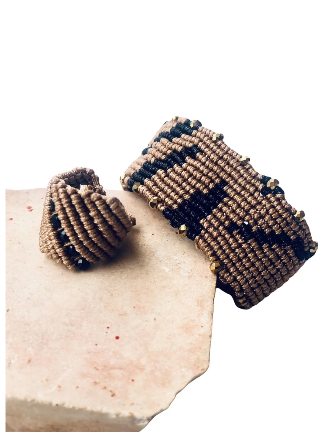 Κόσμημα χειροποίητο γυναικείο σετ μακραμέ βραχιόλι και δαχτυλίδι σε μπεζ και μαύρο Jungle