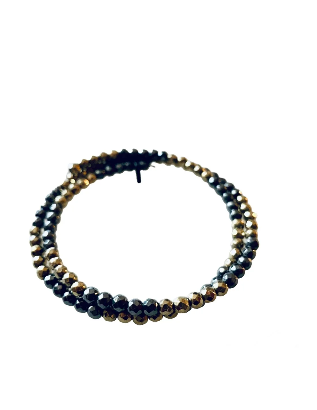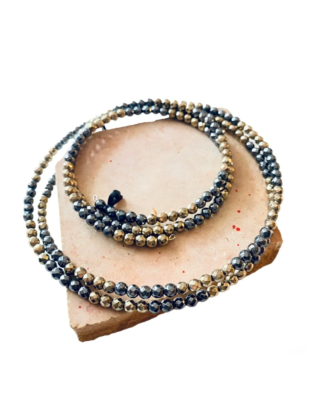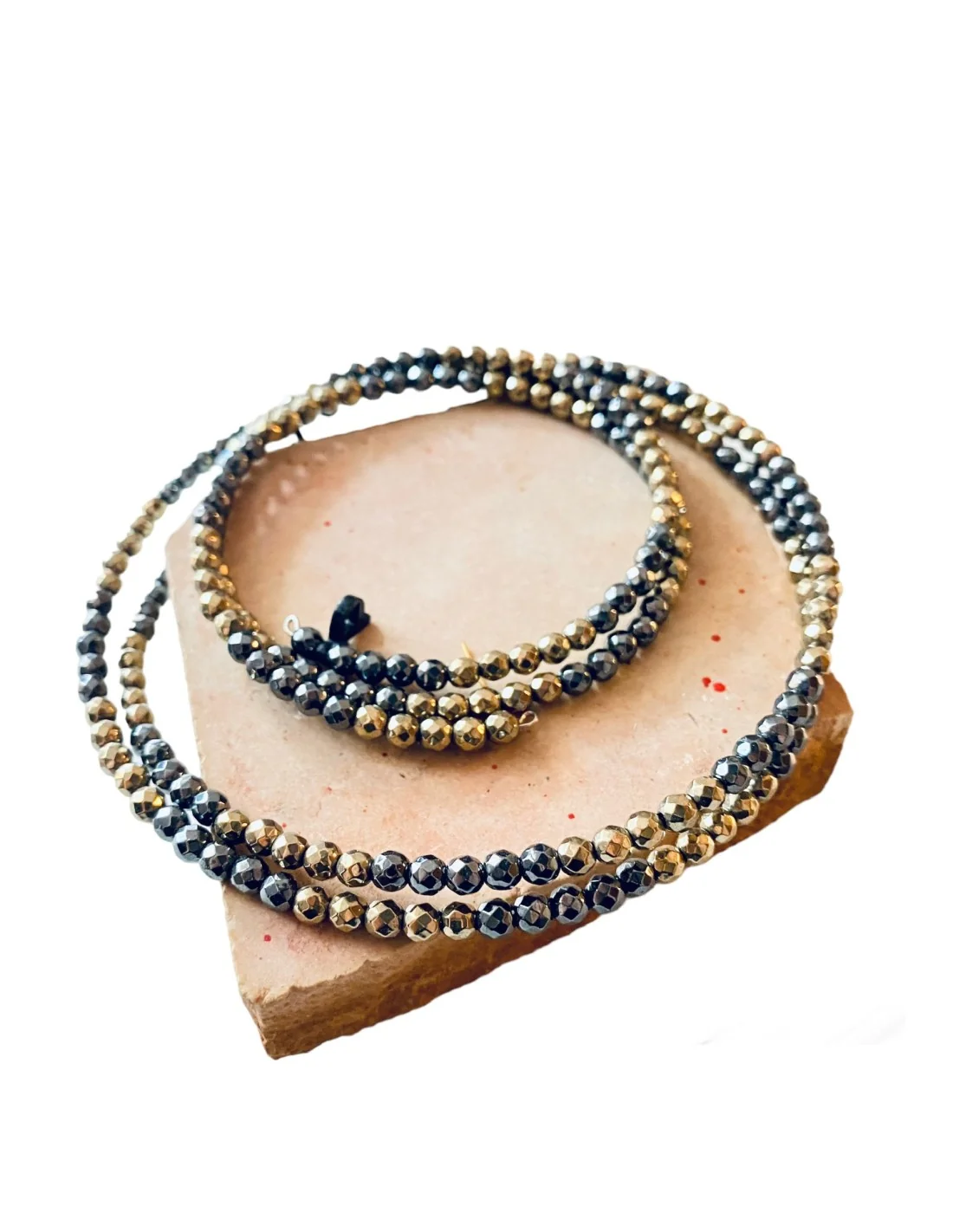 Χειροποίητο σετ από κολιέ choker και βραχιόλι από ημιπολύτιμες πέτρες Αιματίτη σε χρυσό και ανθρακί σε σχήμα πολυεδρικής μπίλιας, περασμένα σε μέταλλο που αγκαλιάζει τον καρπό και τον λαιμό χωρίς να χρειάζεται κούμπωμα.