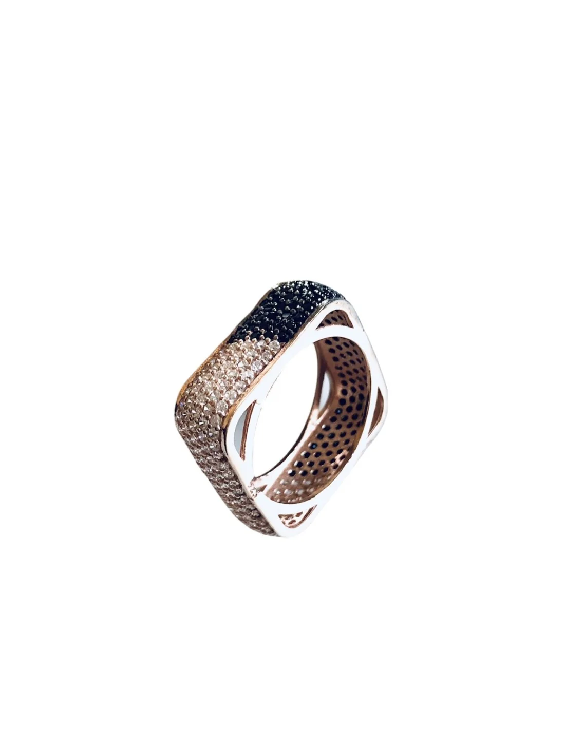 Αναδείξτε την κομψότητά σας με το χειροποίητο τετράγωνο γυναικείο δαχτυλίδι "Mirketa", φτιαγμένο από υψηλής ποιότητας ασήμι 925 και διακοσμημένο με λαμπερά ζιργκόν σε μαύρο και ροζ χρυσό.