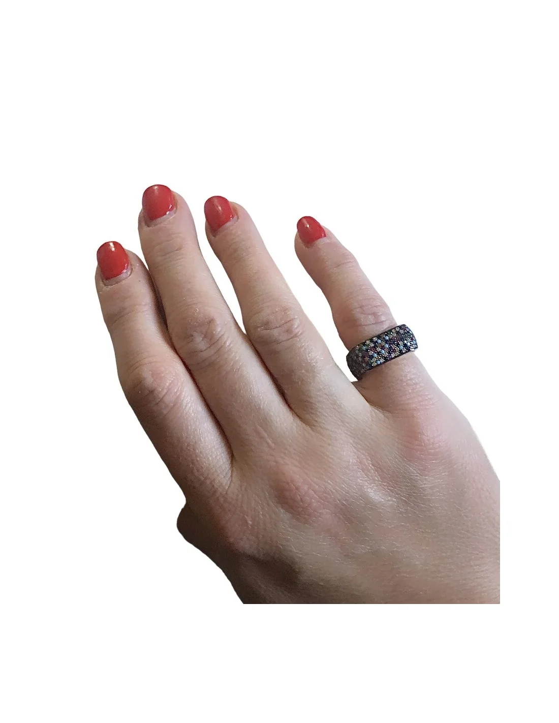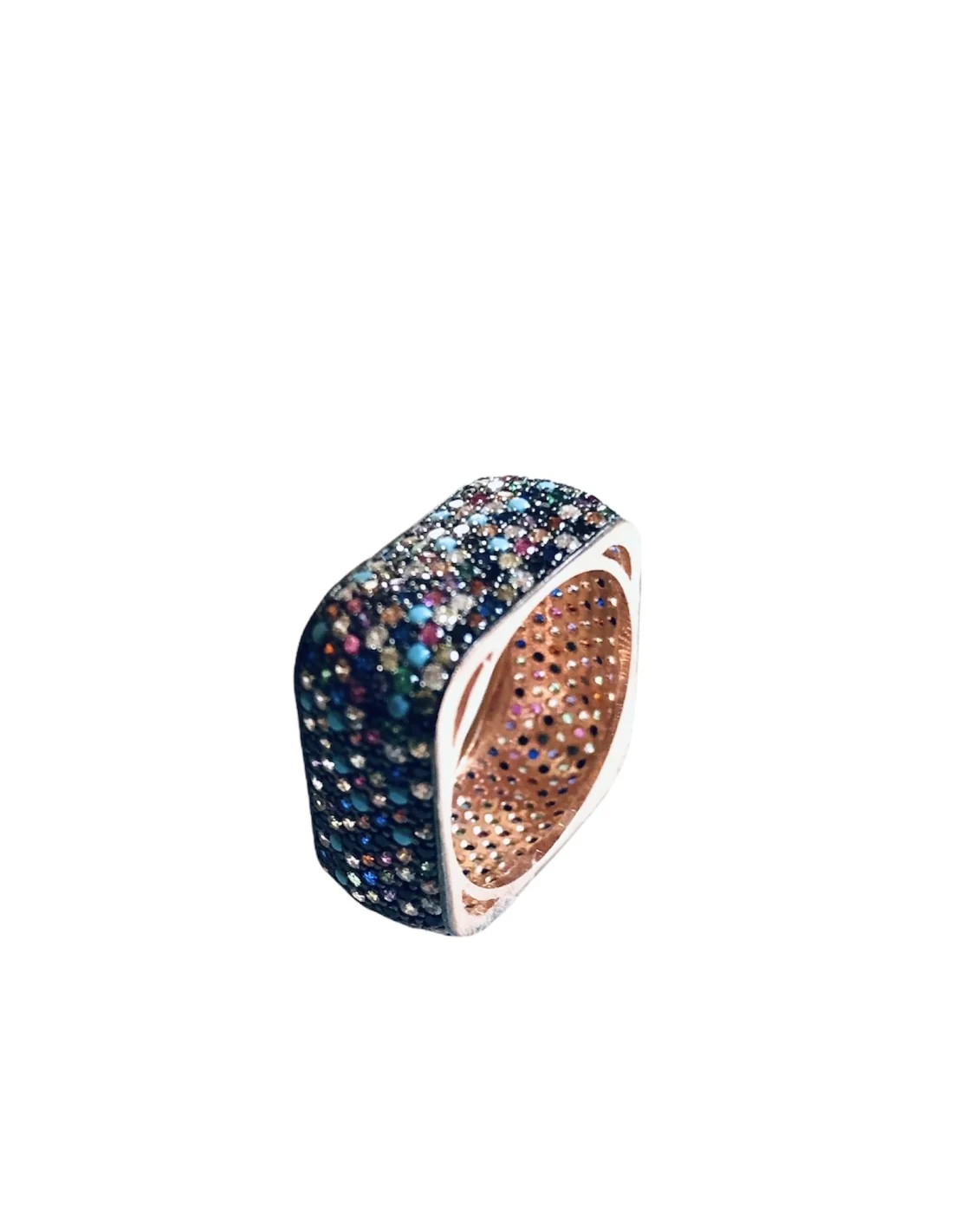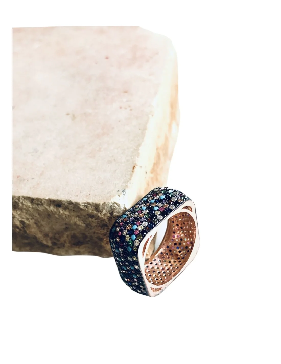 Το τετράγωνο σχέδιο του δαχτυλιδιού χαρίζει μοντέρνα αισθητική, ενώ τα πολύχρωμα ζιργκόν δημιουργούν έναν εκρηκτικό συνδυασμό χρωμάτων που τραβάει τα βλέμματα.