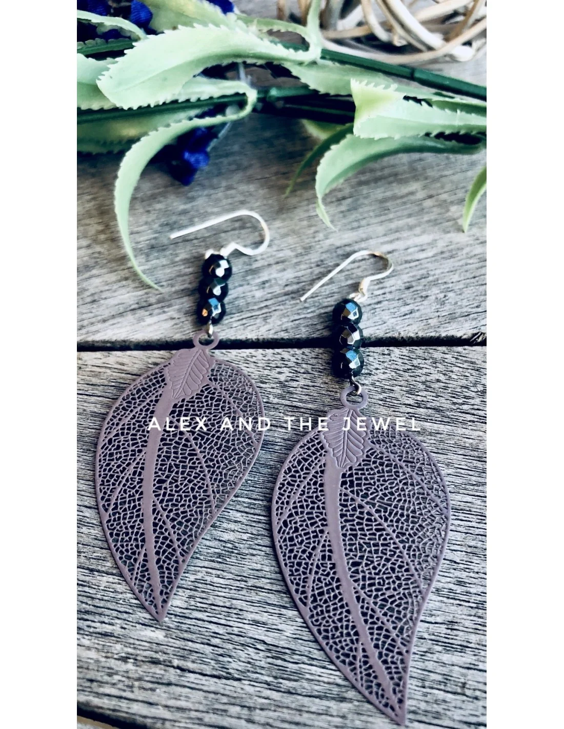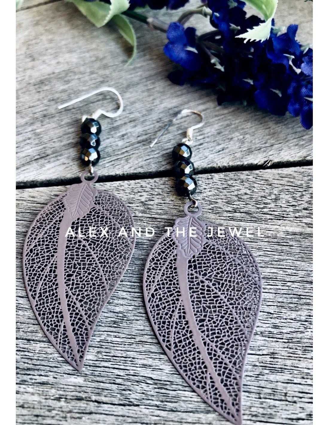 Χειροποίητο κόσμημα σκουλαρίκια από στοιχείο φιλιγκρί σε γκρι μωβ με ημιπολύτιμες πέτρες Αιματίτη Purple Shadow