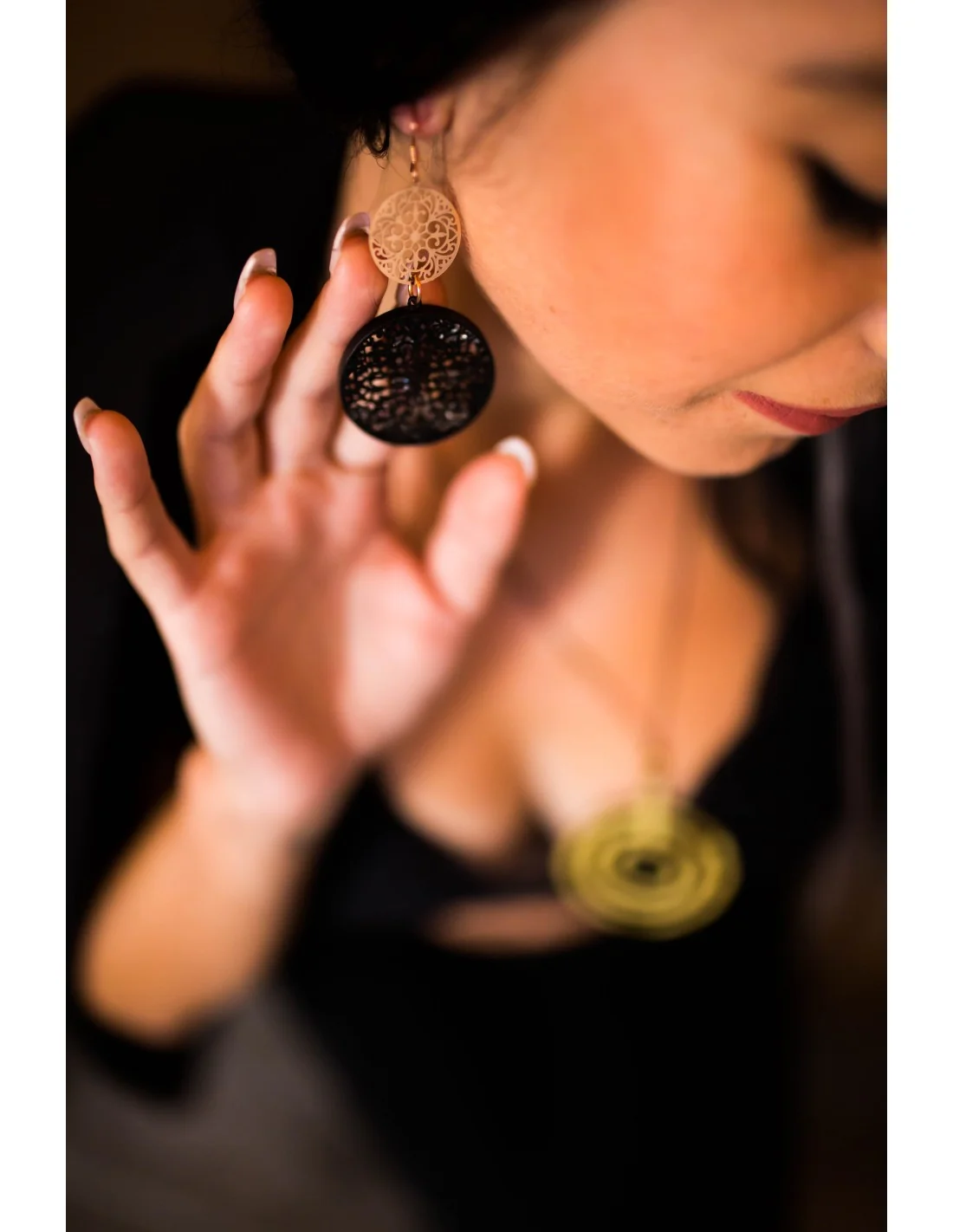 Τα σκουλαρίκια Kyklos ξεχωρίζουν με την υπέροχη διπλή σχεδίαση από μαύρο ματ φιλιγκρί δίσκο, διακοσμημένο με κρύσταλλα που προσφέρουν λάμψη και κομψότητα. Η προσθήκη του μικρού ροζ χρυσού δίσκου δημιουργεί μια ισχυρή αντίθεση, ενώ οι γάντζοι από ασήμι 925 επιχρυσωμένο προσδίδουν πολυτελή αίσθηση. Ένα εντυπωσιακό και εκλεπτυσμένο κόσμημα που προσφέρει τη σωστή ισορροπία μεταξύ κλασικού και μοντέρνου.